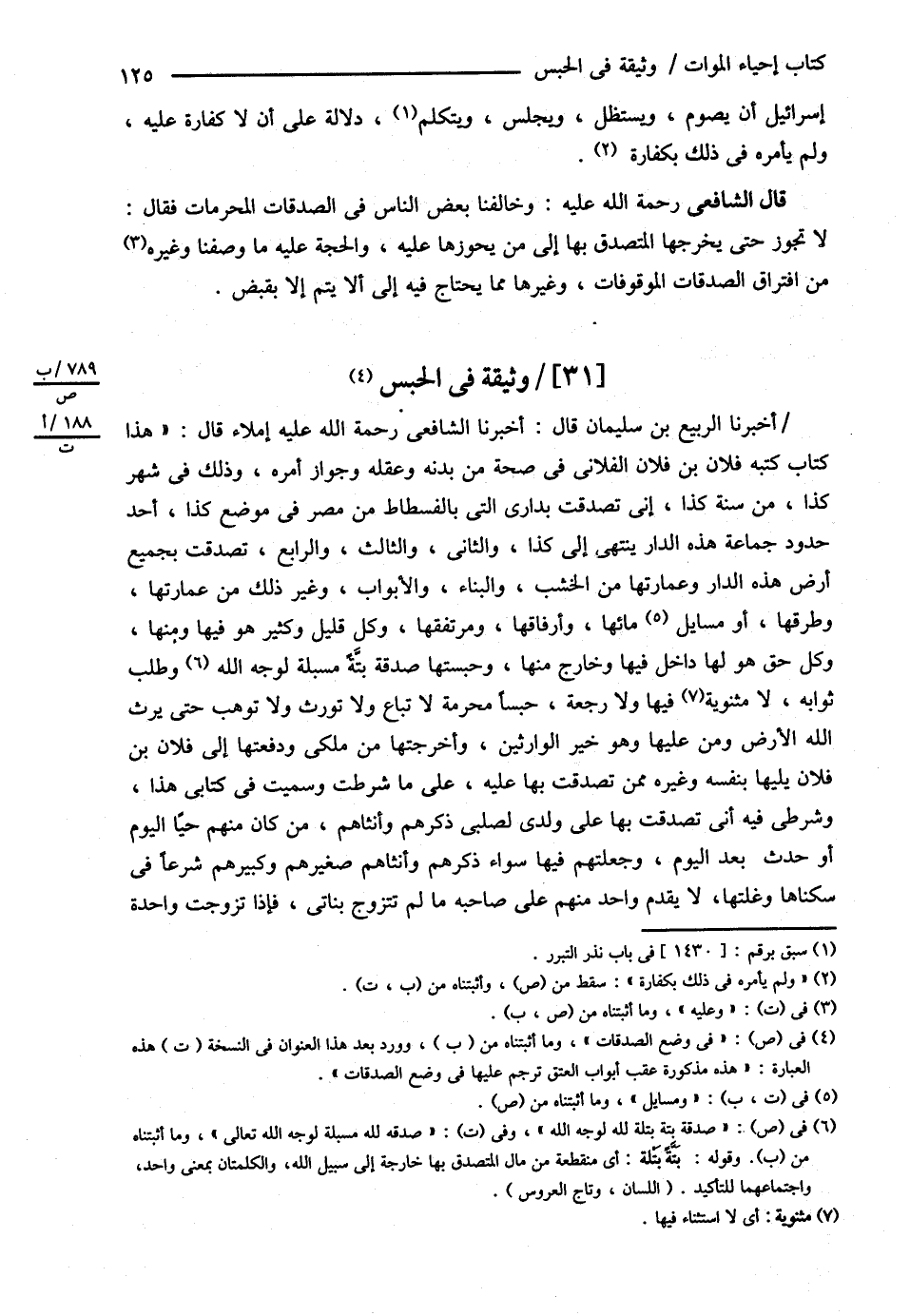 قَالَ الشَّافِعِيُّ : وَخَالَفَنَا بَعْضُ النَّاسِ فِي الصَّدَقَاتِ الْمُحَرَّمَاتِ فَقَالَ : لاَ تَجُوزُ حَتَّى يُخْرِجَهَا الْمُتَصَدِّقُ بِهَا إلَى مَنْ يَحُوزُهَا عَلَيْهِ وَالْحُجَّةُ عَلَيْهِ مَا وَصَفْنَا وَغَيْرُهُ مِنْ افْتِرَاقِ الصَّدَقَاتِ الْمَوْقُوفَاتِ وَغَيْرِهَا مِمَّا يَحْتَاجُ فِيهِ إلَى أَنْ لاَ يَتِمَّ إلَّا بِقَبْضٍ . وَثِيقَةٌ فِي الْحَبْسِ ( أَخْبَرَنَا الرَّبِيعُ بْنُ سُلَيْمَانَ ) قَالَ : أَخْبَرَنَا الشَّافِعِيُّ إمْلاَءً قَالَ : هَذَا كِتَابٌ كَتَبَهُ فُلاَنُ بْنُ فُلاَنٍ الْفُلاَنِيُّ فِي صِحَّةٍ مِنْ بَدَنِهِ وَعَقْلِهِ وَجَوَازِ أَمْرِهِ وَذَلِكَ فِي شَهْرِ كَذَا مِنْ سَنَةِ كَذَا إنِّي تَصَدَّقْت بِدَارِي الَّتِي بِالْفُسْطَاطِ مِنْ مِصْرَ فِي مَوْضِعِ كَذَا أَحَدُ حُدُودِ جَمَاعَةِ هَذِهِ الدَّارِ يَنْتَهِي إلَى كَذَا وَالثَّانِي وَالثَّالِثِ وَالرَّابِعِ تَصَدَّقْت بِجَمِيعِ أَرْضِ هَذِهِ الدَّارِ وَعِمَارَتِهَا مِنْ الْخَشَبِ وَالْبِنَاءِ وَالْأَبْوَابِ وَغَيْرِ ذَلِكَ مِنْ عِمَارَتِهَا وَطُرُقِهَا وَمَسَايِلِ مَائِهَا وَأَرْفَاقِهَا وَمُرْتَفَقِهَا وَكُلِّ قَلِيلٍ وَكَثِيرٍ هُوَ فِيهَا وَمِنْهَا وَكُلِّ حَقٍّ هُوَ لَهَا دَاخِلٌ فِيهَا وَخَارِجٌ مِنْهَا وَحَبَسْتهَا صَدَقَةً بَتَّةً مُسَبَّلَةً لِوَجْهِ اللَّهِ وَطَلَبِ ثَوَابِهِ لاَ مَثْنَوِيَّةَ فِيهَا , وَلاَ رَجْعَةَ حَبْسًا مُحَرَّمَةً لاَ تُبَاعُ , وَلاَ تُوَرَّثُ , وَلاَ تُوهَبُ حَتَّى يَرِثَ اللَّهُ الْأَرْضَ وَمَنْ عَلَيْهَا , وَهُوَ خَيْرُ الْوَارِثِينَ وَأَخْرَجْتهَا مِنْ مِلْكِي وَدَفَعْتهَا إلَى فُلاَنِ بْنِ فُلاَنٍ يَلِيهَا بِنَفْسِهِ وَغَيْرِهِ مِمَّنْ تَصَدَّقْت بِهَا عَلَيْهِ عَلَى مَا شَرَطْت وَسَمَّيْت فِي كِتَابِي هَذَا وَشَرْطِي فِيهِ أَنِّي تَصَدَّقْت بِهَا عَلَى وَلَدِي لِصُلْبِي ذَكَرِهِمْ وَأُنْثَاهُمْ مَنْ كَانَ مِنْهُمْ حَيًّا الْيَوْمَ , أَوْ حَدَثَ بَعْدَ الْيَوْمِ وَجَعَلْتهمْ فِيهَا سَوَاءً ذَكَرَهُمْ وَأُنْثَاهُمْ صَغِيرَهُمْ وَكَبِيرَهُمْ شَرْعًا فِي سُكْنَاهَا وَغَلَّتِهَا لاَ يَقْدُمُ وَاحِدٌ مِنْهُمْ عَلَى صَاحِبِهِ مَا لَمْ تَتَزَوَّجْ بَنَاتِي , فَإِذَا تَزَوَّجَتْ وَاحِدَةٌ مِنْهُنَّ @