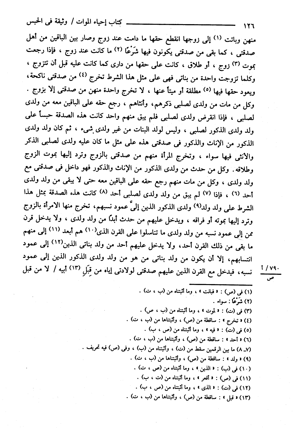 وَبَاتَتْ إلَى زَوْجِهَا انْقَطَعَ حَقُّهَا مَا دَامَتْ عِنْدَ زَوْجٍ وَصَارَ بَيْنَ الْبَاقِينَ مِنْ أَهْلِ صَدَقَتِي كَمَا بَقِيَ مِنْ صَدَقَتِي يَكُونُونَ فِيهِمْ شَرْعًا مَا كَانَتْ عِنْدَ زَوْجٍ . فَإِذَا رَجَعَتْ بِمَوْتِ زَوْجٍ , أَوْ طَلاَقٍ كَانَتْ عَلَى حَقِّهَا مِنْ دَارِي كَمَا كَانَتْ عَلَيْهِ قَبْلَ أَنْ تَتَزَوَّجَ وَكُلَّمَا تَزَوَّجَتْ وَاحِدَةٌ مِنْ بَنَاتِي فَهِيَ عَلَى مِثْلِ هَذَا الشَّرْطِ تَخْرُجُ مِنْ صَدَقَتِي نَاكِحَةً وَيَعُودُ حَقُّهَا فِيهَا مُطَلَّقَةً أَوْ مَيِّتًا عَنْهَا لاَ تَخْرُجُ وَاحِدَةٌ مِنْهُنَّ مِنْ صَدَقَتِي إلَّا بِزَوْجٍ . وَكُلُّ مَنْ مَاتَ مِنْ وَلَدِي لِصُلْبِي ذَكَرِهِمْ وَأُنْثَاهُمْ رَجَعَ حَقُّهُ عَلَى الْبَاقِينَ مَعَهُ مِنْ وَلَدِي لِصُلْبِي , فَإِذَا انْقَرَضَ وَلَدِي لِصُلْبِي فَلَمْ يَبْقَ مِنْهُمْ وَاحِدٌ كَانَتْ هَذِهِ الصَّدَقَةُ حَبْسًا عَلَى وَلَدِ وَلَدِي الذُّكُورِ لِصُلْبِي وَلَيْسَ لِوَلَدِ الْبَنَاتِ مِنْ غَيْرِ وَلَدِي شَيْءٌ ثُمَّ كَانَ وَلَدُ وَلَدِي الذُّكُورُ مِنْ الْإِنَاثِ وَالذُّكُورُ فِي صَدَقَتِي هَذِهِ عَلَى مِثْلِ مَا كَانَ عَلَيْهِ وَلَدِي لِصُلْبِي الذَّكَرُ وَالْأُنْثَى فِيهَا سَوَاءٌ وَتَخْرُجُ الْمَرْأَةُ مِنْهُمْ مِنْ صَدَقَتِي بِالزَّوْجِ وَتُرَدُّ إلَيْهَا بِمَوْتِ الزَّوْجِ , أَوْ طَلاَقِهِ وَكُلُّ مَنْ حَدَثَ مِنْ وَلَدِي الذُّكُورِ مِنْ الْإِنَاثِ وَالذُّكُورِ فَهُوَ دَاخِلٌ فِي صَدَقَتِي مَعَ وَلَدِ وَلَدِي وَكُلُّ مَنْ مَاتَ مِنْهُمْ رَجَعَ حَقُّهُ عَلَى الْبَاقِينَ مَعَهُ حَتَّى لاَ يَبْقَى مِنْ وَلَدِ وَلَدِي أَحَدٌ . فَإِذَا لَمْ يَبْقَ مِنْ وَلَدِ وَلَدِي لِصُلْبِي أَحَدٌ كَانَتْ هَذِهِ الصَّدَقَةُ بِمِثْلِ هَذَا الشَّرْطِ عَلَى وَلَدِ وَلَدِ وَلَدِي لِلذُّكُورِ الَّذِينَ إلَى عَمُودِ نَسَبِهِمْ تَخْرُجُ مِنْهَا الْمَرْأَةُ بِالزَّوْجِ وَتُرَدُّ إلَيْهَا بِمَوْتِهِ , أَوْ فِرَاقِهِ وَيَدْخُلُ عَلَيْهِمْ مَنْ حَدَثَ أَبَدًا مِنْ وَلَدِ وَلَدِ وَلَدِي , وَلاَ يَدْخُلُ قَرْنٌ مِمَّنْ إلَى عَمُودِ نَسَبِهِ مِنْ وَلَدِ وَلَدِي مَا تَنَاسَلُوا عَلَى الْقَرْنِ الَّذِينَ هُمْ أَبْعَدُ إلَيَّ مِنْهُمْ مَا بَقِيَ مِنْ ذَلِكَ الْقَرْنِ أَحَدٌ , وَلاَ يَدْخُلُ عَلَيْهِمْ أَحَدٌ مِنْ وَلَدِ بَنَاتِي الَّذِينَ إلَى عَمُودِ انْتِسَابِهِمْ إلَّا أَنْ يَكُونَ مِنْ وَلَدِ بَنَاتِي مَنْ هُوَ مِنْ وَلَدِ وَلَدِي الذُّكُورِ الَّذِينَ إلَى عَمُودِ نَسَبِهِ فَيَدْخُلُ مَعَ الْقَرْنِ الَّذِينَ عَلَيْهِمْ صَدَقَتِي لِوِلاَدَتِي إيَّاهُ مِنْ قِبَلِ أَبِيهِ لاَ مِنْ قِبَلِ @