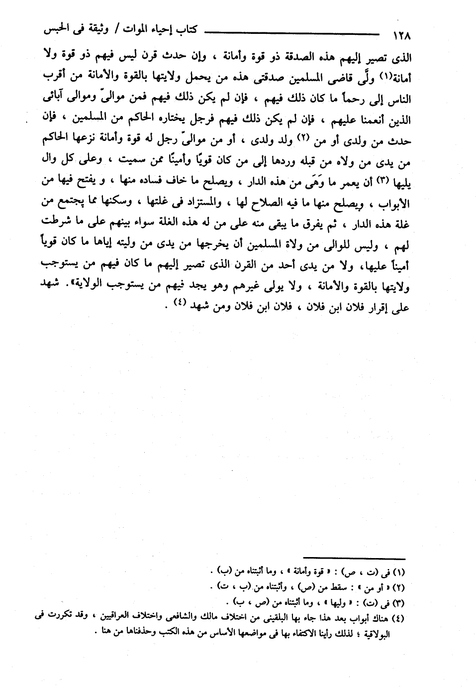 الَّذِي تَصِيرُ إلَيْهِمْ هَذِهِ الصَّدَقَةُ ذُو قُوَّةٍ وَأَمَانَةٍ , وَإِنْ حَدَثَ قَرْنٌ لَيْسَ فِيهِمْ ذُو قُوَّةٍ , وَلاَ أَمَانَةٍ وَلَّى قَاضِي الْمُسْلِمِينَ صَدَقَتِي هَذِهِ مَنْ يَحْمِلُ وِلاَيَتَهَا بِالْقُوَّةِ وَالْأَمَانَةِ مَنْ أَقْرَبُ النَّاسِ إلَيَّ رَحِمًا مَا كَانَ ذَلِكَ فِيهِمْ فَإِنْ لَمْ يَكُنْ ذَلِكَ فِيهِمْ فَمِنْ مُوَالِيَّ وَمَوَالِي آبَائِي الَّذِينَ أَنْعَمْنَا عَلَيْهِمْ فَإِنْ لَمْ يَكُنْ ذَلِكَ فِيهِمْ فَرَجُلٌ يَخْتَارُهُ الْحَاكِمُ مِنْ الْمُسْلِمِينَ فَإِنْ حَدَثَ مِنْ وَلَدِي أَوْ مِنْ وَلَدِ وَلَدِي , أَوْ مِنْ مَوَالِي رَجُلٍ لَهُ قُوَّةٌ وَأَمَانَةٌ نَزَعَهَا الْحَاكِمُ مِنْ يَدَيْ مَنْ وَلَّاهُ مِنْ قِبَلِهِ وَرَدَّهَا إلَى مَنْ كَانَ قَوِيًّا وَأَمِينًا مِمَّنْ سَمَّيْت وَعَلَى كُلِّ وَالٍ يَلِيهَا أَنْ يُعَمِّرَ مَا وَهِيَ مِنْ هَذِهِ الدَّارِ وَيُصْلِحَ مَا خَافَ فَسَادَهُ مِنْهَا وَيَفْتَحَ فِيهَا مِنْ الْأَبْوَابِ وَيُصْلِحَ مِنْهَا مَا فِيهِ الصَّلاَحُ لَهَا وَالْمُسْتَرَدُّ فِي غَلَّتِهَا وَسَكَنِهَا مِمَّا يَجْتَمِعُ مِنْ غَلَّةِ هَذِهِ الدَّارِ ثُمَّ يُفَرِّقُ مَا يَبْقَى عَلَى مَنْ لَهُ هَذِهِ الْغَلَّةُ سَوَاءٌ بَيْنَهُمْ مَا شَرَطْت لَهُمْ , وَلَيْسَ لِلْوَالِي مِنْ وُلاَةِ الْمُسْلِمِينَ أَنْ يُخْرِجَهَا مِنْ يَدَيْ مَنْ وَلَّيْته إيَّاهَا مَا كَانَ قَوِيًّا أَمِينًا عَلَيْهَا , وَلاَ مِنْ يَدَيْ أَحَدٍ مِنْ الْقَرْنِ الَّذِي تَصِيرُ إلَيْهِمْ مَا كَانَ فِيهِمْ مَنْ يَسْتَوْجِبُ وِلاَيَتَهَا بِالْقُوَّةِ وَالْأَمَانَةِ , وَلاَ يُوَلِّي غَيْرَهُمْ , وَهُوَ يَجِدُ فِيهِمْ مَنْ يَسْتَوْجِبُ الْوِلاَيَةَ , شَهِدَ عَلَى إقْرَارِ فُلاَنِ بْنِ فُلاَنٍ , فُلاَنُ بْنُ فُلاَنٍ وَمَنْ شَهِدَ .@