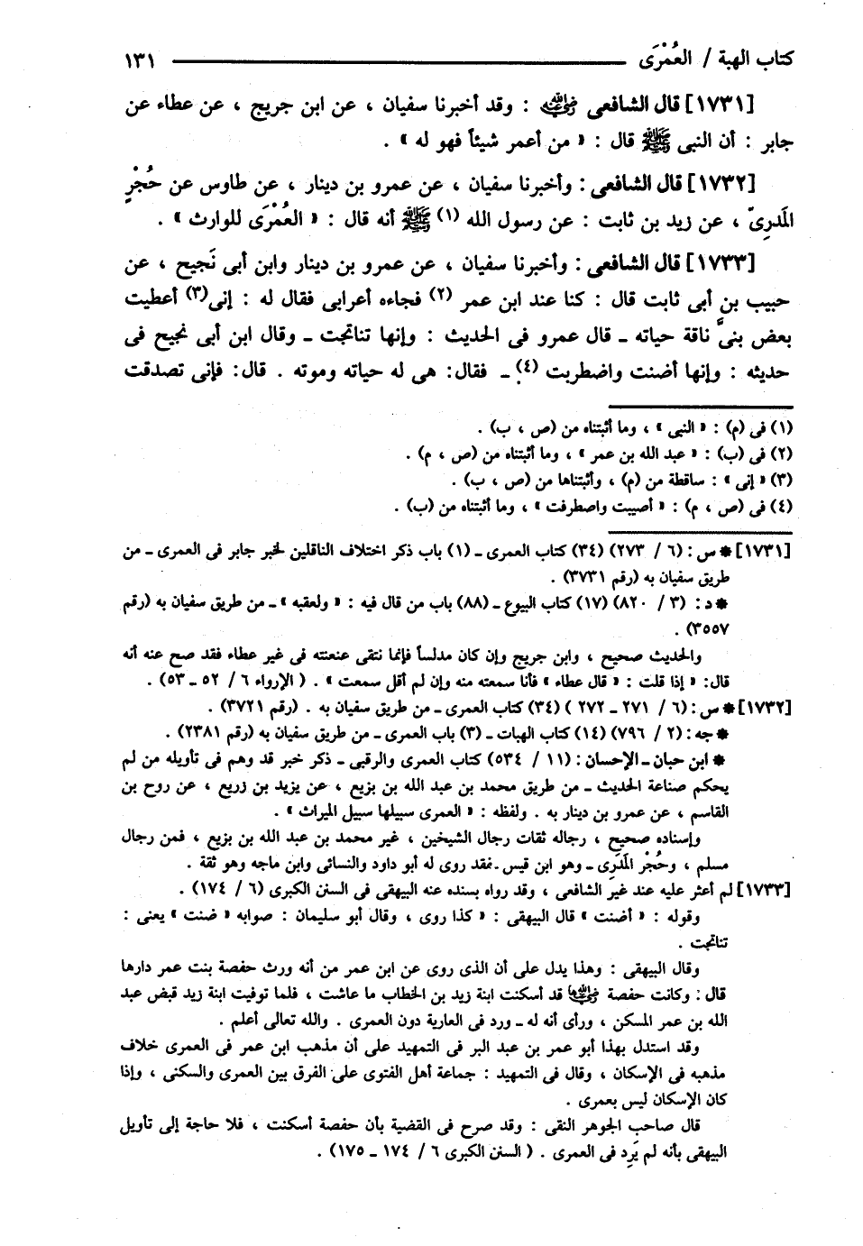 قَالَ الشَّافِعِيُّ : وَأَخْبَرَنَا سُفْيَانُ عَنْ عَمْرِو بْنِ دِينَارٍ وَابْنُ أَبِي نَجِيحٍ عَنْ حَبِيبِ بْنِ أَبِي ثَابِتٍ قَالَ كُنَّا عِنْدَ عَبْدِ اللَّهِ بْنِ عُمَرَ فَجَاءَهُ أَعْرَابِيٌّ فَقَالَ : لَهُ إنِّي أَعْطَيْت بَعْضَ بَنِيَّ نَاقَةً حَيَاتَهُ قَالَ : عُمَرُ , وَفِي الْحَدِيثِ وَإِنَّهَا تَنَاتَجَتْ . وَقَالَ ابْنُ أَبِي نَجِيحٍ فِي حَدِيثِهِ وَإِنَّهَا أَضْنَتْ وَاضْطَرَبَتْ فَقَالَ : هِيَ لَهُ حَيَاتَهُ وَمَوْتَهُ . قَالَ : فَإِنِّي تَصَدَّقْتُ@