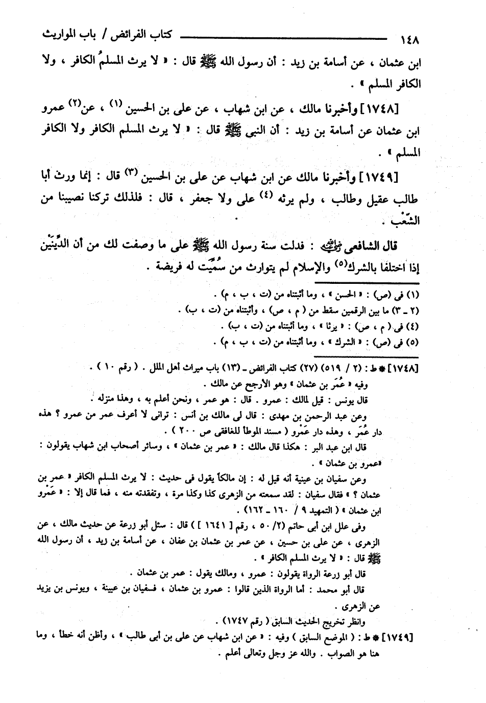 ابْنِ عُثْمَانَ عَنْ أُسَامَةَ بْنِ زَيْدٍ أَنَّ رَسُولَ اللَّهِ - صلى الله عليه وسلم - قَالَ : { لاَ يَرِثُ الْمُسْلِمُ الْكَافِرَ , وَلاَ الْكَافِرُ الْمُسْلِمَ } وَأَخْبَرَنَا مَالِكٌ عَنْ ابْنِ شِهَابٍ عَنْ عَلِيِّ بْنِ الْحُسَيْنِ عَنْ عَمْرِو بْنِ عُثْمَانَ عَنْ أُسَامَةَ بْنِ زَيْدٍ أَنَّ النَّبِيَّ - صلى الله عليه وسلم - قَالَ : { لاَ يَرِثُ الْمُسْلِمُ الْكَافِرَ , وَلاَ الْكَافِرُ الْمُسْلِمَ } وَأَخْبَرَنَا مَالِكٌ عَنْ ابْنِ شِهَابٍ عَنْ عَلِيِّ بْنِ الْحُسَيْنِ قَالَ : إنَّمَا وَرِثَ أَبَا طَالِبٍ عَقِيلٌ وَطَالِبٌ , وَلَمْ يَرِثْهُ عَلِيٌّ , وَلاَ جَعْفَرٌ . قَالَ : فَلِذَلِكَ تَرَكْنَا نَصِيبَنَا مِنْ الشِّعْبِ .