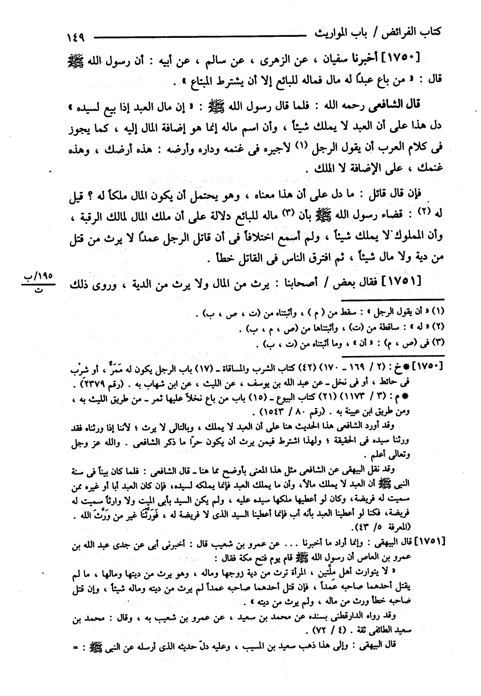 قَالَ الشَّافِعِيُّ : فَلَمَّا قَالَ رَسُولُ اللَّهِ - صلى الله عليه وسلم - : إنَّ مَالَ الْعَبْدِ إذَا بِيعَ لِسَيِّدِهِ دَلَّ هَذَا عَلَى أَنَّ الْعَبْدَ لاَ يَمْلِكُ شَيْئًا , وَأَنَّ اسْمَ مَالِهِ إنَّمَا هُوَ إضَافَةُ الْمَالِ إلَيْهِ , كَمَا يَجُوزُ فِي كَلاَمِ الْعَرَبِ أَنْ يَقُولَ الرَّجُلُ لِأَجِيرٍ فِي غَنَمِهِ وَدَارِهِ وَأَرْضِهِ هَذِهِ أَرْضُك وَهَذِهِ غَنَمُك عَلَى الْإِضَافَةِ لاَ الْمِلْكِ , فَإِنْ قَالَ قَائِلٌ : مَا دَلَّ عَلَى أَنَّ هَذَا مَعْنَاهُ , وَهُوَ يُحْتَمَلُ أَنْ يَكُونَ الْمَالُ مِلْكًا لَهُ ؟ قِيلَ : لَهُ قَضَاءُ رَسُولِ اللَّهِ - صلى الله عليه وسلم - بِأَنَّ مَالَهُ لِلْبَائِعِ دَلاَلَةٌ عَلَى أَنَّ مِلْكَ الْمَالِ لِمَالِكِ الرَّقَبَةِ وَأَنَّ الْمَمْلُوكَ لاَ يَمْلِكُ شَيْئًا , وَلَمْ أَسْمَعْ اخْتِلاَفًا فِي أَنَّ قَاتِلَ الرَّجُلِ عَمْدًا لاَ يَرِثُ مَنْ قَتَلَ مِنْ دِيَةٍ , وَلاَ مَالٍ شَيْئًا . ثُمَّ افْتَرَقَ النَّاسُ فِي الْقَاتِلِ خَطَأً , فَقَالَ : بَعْضُ أَصْحَابِنَا يَرِثُ مِنْ الْمَالِ , وَلاَ يَرِثُ مِنْ الدِّيَةِ وَرُوِيَ ذَلِكَ @
