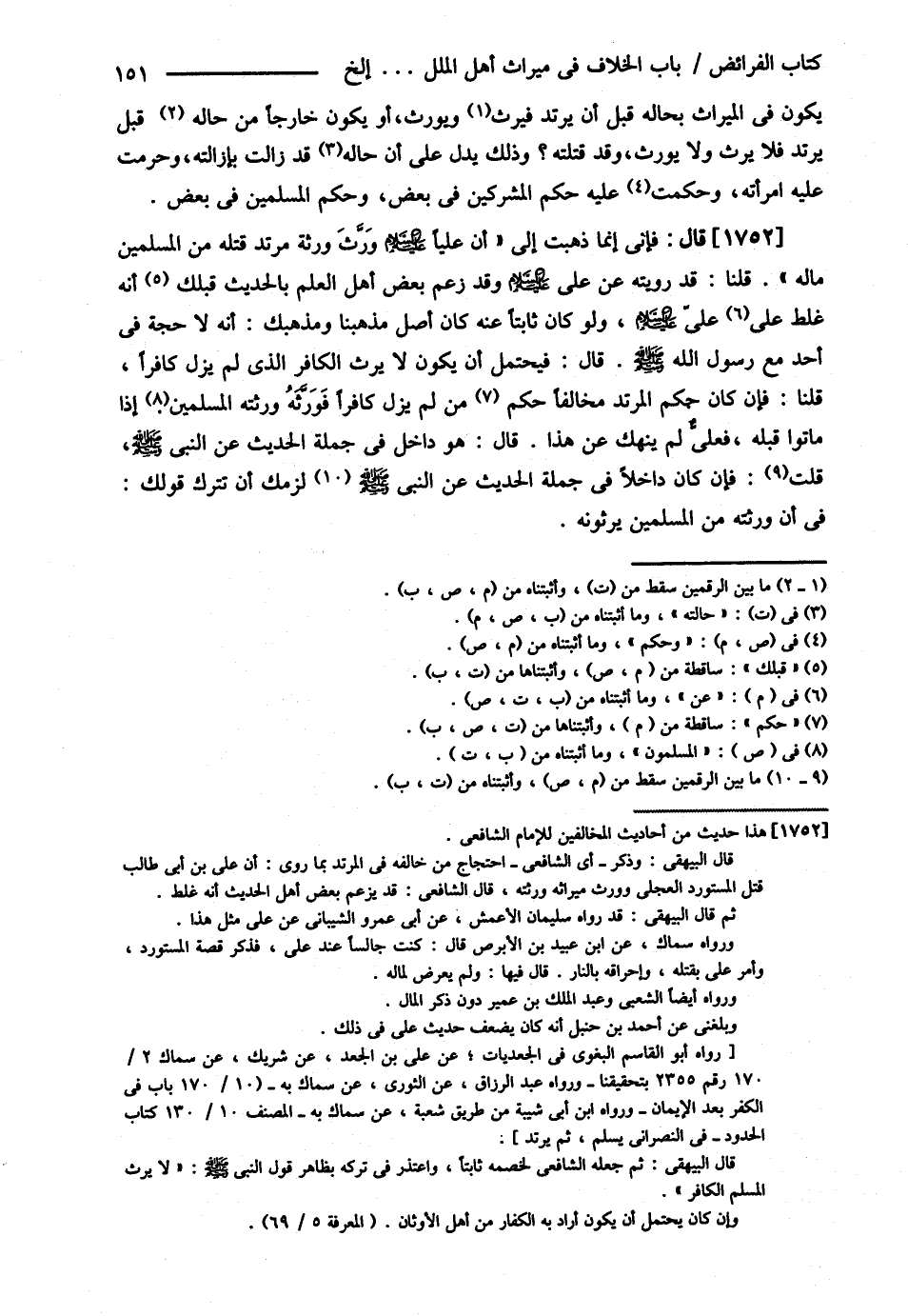 يَكُونَ فِي الْمِيرَاثِ بِحَالِهِ قَبْلَ أَنْ يَرْتَدَّ فَيَرِثَ وَيُورَثَ أَوْ يَكُونَ خَارِجًا مِنْ حَالِهِ قَبْلَ أَنْ يَرْتَدَّ فَلاَ يَرِثَ , وَلاَ يُورَثَ , وَقَدْ قَتَلْته ؟ وَذَلِكَ يَدُلُّ عَلَى أَنَّ قَدْ زَالَتْ بِإِزَالَتِهِ وَحَرَّمْت عَلَيْهِ امْرَأَتَهُ وَحَكَمْت عَلَيْهِ حُكْمَ الْمُشْرِكِينَ فِي بَعْضٍ وَحُكْمَ الْمُسْلِمِينَ فِي بَعْضٍ قَالَ : فَإِنِّي إنَّمَا ذَهَبْت إلَى أَنَّ عَلِيًّا رضي الله عنه وَرَّثَ وَرَثَةَ مُرْتَدٍّ قَتَلَهُ مِنْ الْمُسْلِمِينَ مَالَهُ قُلْنَا : قَدْ رَوَيْته عَنْ عَلِيٍّ رضي الله عنه وَقَدْ زَعَمَ بَعْضُ أَهْلِ الْعِلْمِ بِالْحَدِيثِ قَبْلَك أَنَّهُ غُلِطَ عَلَى عَلِيٍّ كَرَّمَ اللَّهُ وَجْهَهُ , وَلَوْ كَانَ ثَابِتًا عَنْهُ كَانَ أَصْلُ مَذْهَبِنَا وَمَذْهَبِك أَنَّهُ لاَ حُجَّةَ فِي أَحَدٍ مَعَ رَسُولِ اللَّهِ - صلى الله عليه وسلم - قَالَ : فَيُحْتَمَلُ أَنْ يَكُونَ لاَ يَرِثُ الْكَافِرُ الَّذِي لَمْ يَزَلْ كَافِرًا قُلْنَا فَإِنْ كَانَ حُكْمُ الْمُرْتَدِّ مُخَالِفًا حُكْمَ مَنْ لَمْ يَزَلْ كَافِرًا فَوَرَّثَهُ فَوَرَثَتُهُ الْمُسْلِمُونَ إذَا مَاتُوا قَبْلَهُ فَعَلِيٌّ لَمْ يَنْهَك عَنْ هَذَا قَالَ : هُوَ دَاخِلٌ فِي جُمْلَةِ الْحَدِيثِ عَنْ النَّبِيِّ - صلى الله عليه وسلم - قُلْت : فَإِنْ كَانَ دَاخِلاً فِي جُمْلَةِ الْحَدِيثِ عَنْ النَّبِيِّ - صلى الله عليه وسلم - لَزِمَك أَنْ تَتْرُكَ قَوْلَك فِي أَنَّ وَرَثَتَهُ مِنْ الْمُسْلِمِينَ يَرِثُونَهُ@