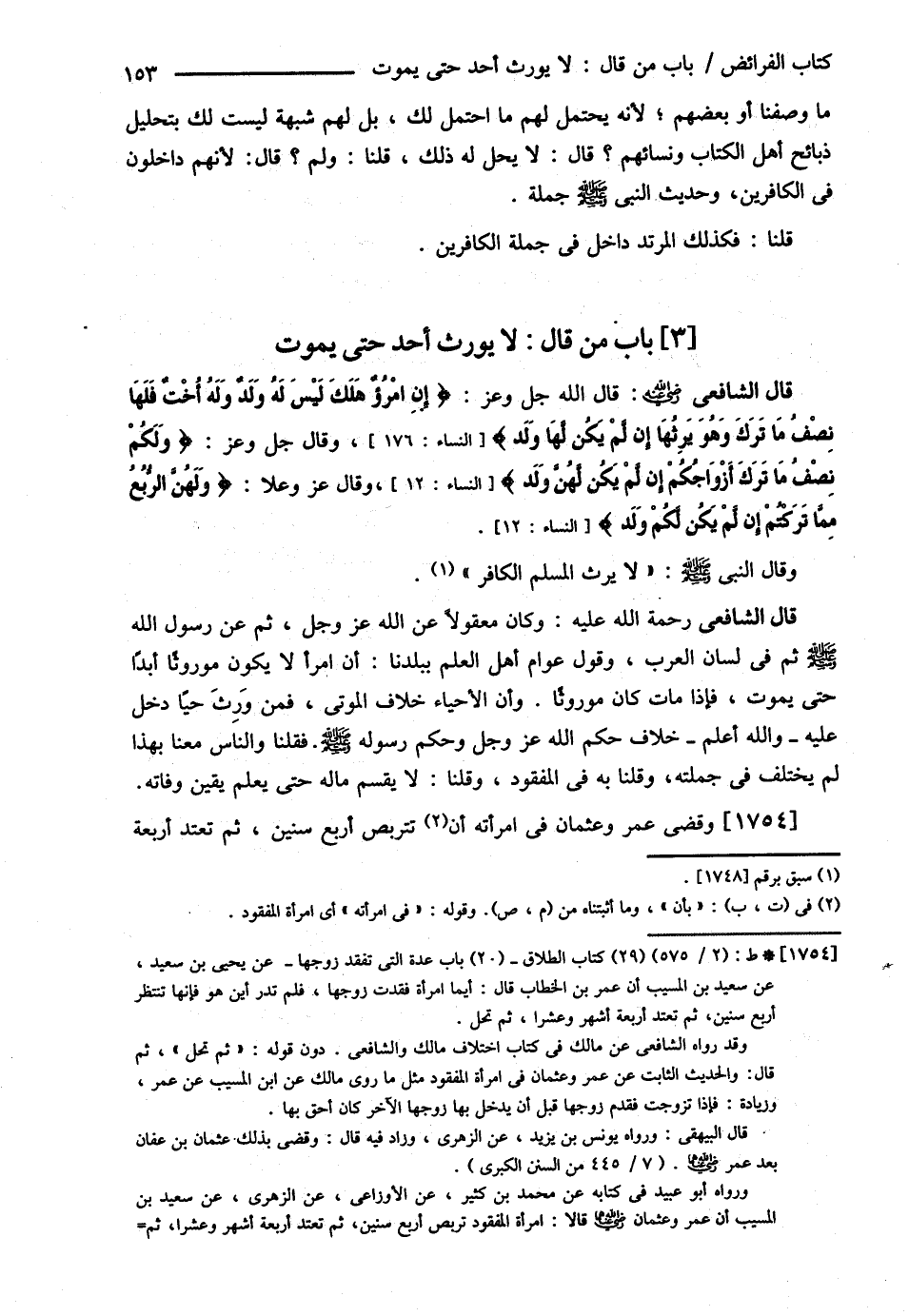 قَالَ الشَّافِعِيُّ : وَكَانَ مَعْقُولاً عَنْ اللَّهِ عَزَّ وَجَلَّ ثُمَّ عَنْ رَسُولِ اللَّهِ - صلى الله عليه وسلم - ثُمَّ فِي لِسَانِ الْعَرَبِ وَقَوْلِ عَوَامِّ أَهْلِ الْعِلْمِ بِبَلَدِنَا أَنَّ امْرَأً لاَ يَكُونُ مَوْرُوثًا أَبَدًا حَتَّى يَمُوتَ , فَإِذَا مَاتَ كَانَ مَوْرُوثًا وَأَنَّ الْأَحْيَاءَ خِلاَفُ الْمَوْتَى فَمَنْ وَرِثَ حَيًّا دَخَلَ عَلَيْهِ وَاَللَّهُ تَعَالَى أَعْلَمُ خِلاَفَ حُكْمِ اللَّهِ عَزَّ وَجَلَّ وَحُكْمِ رَسُولِ اللَّهِ - صلى الله عليه وسلم - فَقُلْنَا : وَالنَّاسُ مَعَنَا بِهَذَا لَمْ يَخْتَلِفْ فِي جُمْلَتِهِ وَقُلْنَا بِهِ فِي الْمَفْقُودِ وَقُلْنَا لاَ يُقَسَّمُ مَالُهُ حَتَّى يُعْلَمَ يَقِينُ وَفَاتِهِ . وَقَضَى عُمَرُ وَعُثْمَانُ فِي امْرَأَتِهِ بِأَنْ تَتَرَبَّصَ أَرْبَعَ سِنِينَ ثُمَّ تَعْتَدَّ أَرْبَعَةَ@