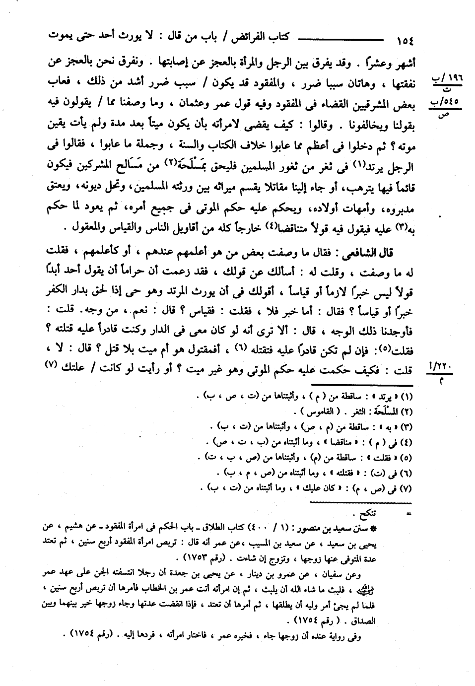 قَالَ الشَّافِعِيُّ : فَقَالَ : مَا وَصَفْت بَعْضَ مَنْ هُوَ أَعْلَمُهُمْ عِنْدَهُمْ , أَوْ كَأَعْلَمِهِمْ فَقُلْت لَهُ مَا وَصَفْت , وَقُلْت : لَهُ أَسْأَلُك عَنْ قَوْلِك , فَقَدْ زَعَمْت أَنَّ حَرَامًا أَنْ يَقُولَ أَحَدٌ أَبَدًا قَوْلاً لَيْسَ خَبَرًا لاَزِمًا , أَوْ قِيَاسًا أَقَوْلُكَ فِي أَنْ يُورَثَ الْمُرْتَدُّ , وَهُوَ حَيٌّ إذَا لَحِقَ بِدَارِ الْكُفْرِ خَبَرًا , أَوْ قِيَاسًا ؟ فَقَالَ : أَمَّا خَبَرٌ فَلاَ , فَقُلْت : فَقِيَاسٌ ؟ قَالَ : نَعَمْ مِنْ وَجْهٍ , قُلْت فَأَوْجِدْنَا ذَلِكَ الْوَجْهَ قَالَ : أَلاَ تَرَى أَنَّهُ لَوْ كَانَ مَعِي فِي الدَّارِ وَكُنْتُ قَادِرًا عَلَيْهِ قَتَلْته ؟ فَقُلْت فَإِنْ لَمْ تَكُنْ قَادِرًا عَلَيْهِ فَتَقْتُلُهُ أَفَمَقْتُولٌ هُوَ أَمْ مَيِّتٌ بِلاَ قَتْلٍ ؟ قَالَ : لاَ قُلْت : فَكَيْفَ حَكَمْت عَلَيْهِ حُكْمَ الْمَوْتَى , وَهُوَ غَيْرُ مَيِّتٍ ؟ أَوَرَأَيْت لَوْ كَانَتْ عِلَّتُك@