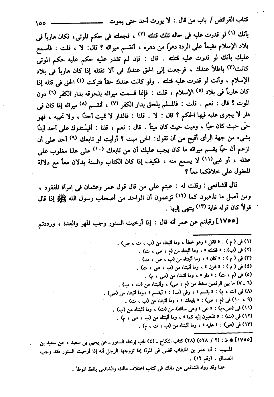 بِأَنَّك لَوْ قَدَرْت عَلَيْهِ فِي حَالِهِ تِلْكَ فَقَتَلْته فَجَعَلْته فِي حُكْمِ الْمَوْتَى فَكَانَ هَارِبًا فِي بِلاَدِ الْإِسْلاَمِ مُقِيمًا عَلَى الرِّدَّةِ دَهْرًا مِنْ دَهْرِهِ أَتُقَسِّمُ مِيرَاثَهُ ؟ قَالَ : لاَ , قُلْت : فَأَسْمَعُ عِلَّتَك بِأَنَّك لَوْ قَدَرْت عَلَيْهِ قَتَلْته . قَالَ : فَإِنْ لَمْ تَقْدِرْ عَلَيْهِ حُكِمَ عَلَيْهِ حُكْمُ الْمَوْتَى كَانَتْ بَاطِلاً عِنْدَك فَرَجَعْت إلَى الْحَقِّ عِنْدَك فِي أَنْ لاَ تَقْتُلَهُ إذَا كَانَ هَارِبًا فِي بِلاَدِ الْإِسْلاَمِ وَأَنْتَ لَوْ قَدَرْت عَلَيْهِ قَتَلْته . وَلَوْ كَانَتْ عِنْدَك حَقًّا فَتَرَكْت الْحَقَّ فِي قَتْلِهِ إذَا كَانَ هَارِبًا فِي بِلاَدِ الْإِسْلاَمِ . قُلْت : فَإِنَّمَا قَسَّمْت مِيرَاثَهُ بِلُحُوقِهِ بِدَارِ الْكُفْرِ دُونَ الْمَوْتِ ؟ قَالَ : نَعَمْ , قُلْت : فَالْمُسْلِمُ يَلْحَقُ بِدَارِ الْكُفْرِ أَيُقَسَّمُ مِيرَاثُهُ إذَا كَانَ فِي دَارٍ لاَ يَجْرِي عَلَيْهِ فِيهَا الْحُكْمُ ؟ قَالَ : لاَ . قُلْنَا فَالدَّارُ لاَ تُمِيتُ أَحَدًا , وَلاَ تُحْيِيهِ , فَهُوَ حَيٌّ حَيْثُ كَانَ حَيًّا وَمَيِّتٌ حَيْثُ كَانَ مَيِّتًا . قَالَ نَعَمْ : قُلْنَا أَفَتَسْتَدْرِكُ عَلَى أَحَدٍ أَبَدًا بِشَيْءٍ مِنْ جِهَةِ الرَّأْيِ أَقْبَحُ أَنْ تَقُولَ الْحَيُّ مَيِّتٌ ؟ أَرَأَيْت لَوْ تَابَعَك أَحَدٌ عَلَى أَنْ تَزْعُمَ أَنَّ حَيًّا يُقَسَّمُ مِيرَاثُهُ مَا كَانَ يَجِبُ عَلَيْك أَنَّ مَنْ تَابَعَك عَلَى هَذَا مَغْلُوبٌ عَلَى عَقْلِهِ , أَوْ غَبِيٌّ لاَ يُسْمَعُ مِنْهُ . فَكَيْفَ إذَا كَانَ الْكِتَابُ وَالسُّنَّةُ يَدُلَّانِ مَعًا عَلَى دَلاَلَةِ الْمَعْقُولِ عَلَى خِلاَفِكُمَا مَعًا ؟ .