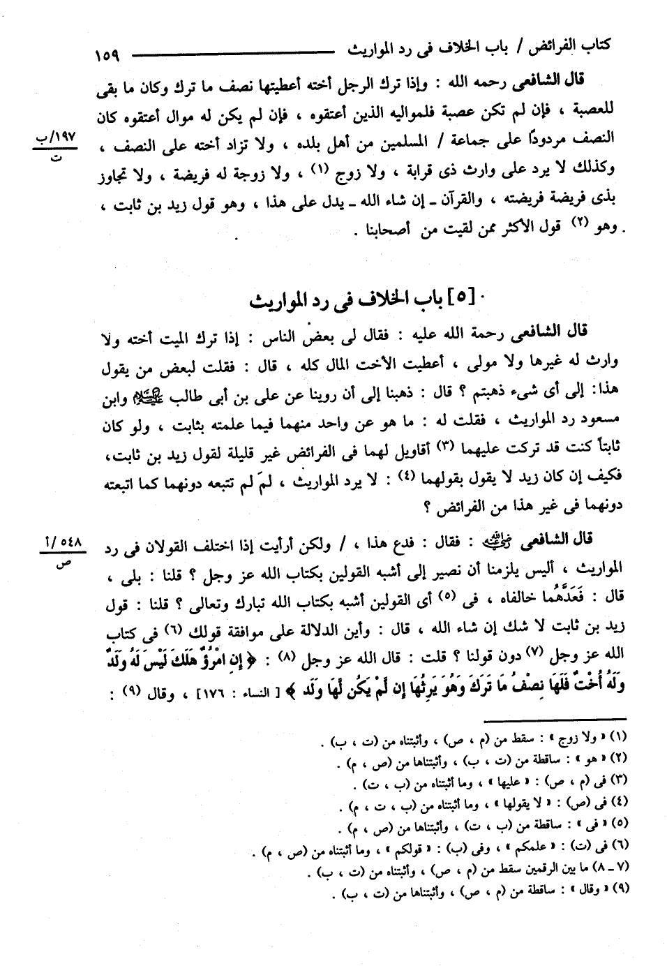 قَالَ الشَّافِعِيُّ: فَقَالَ: فَدَعْ هَذَا , وَلَكِنْ أَرَأَيْت إذَا اخْتَلَفَ الْقَوْلاَنِ فِي رَدِّ الْمَوَارِيثِ أَلَيْسَ يَلْزَمُنَا أَنْ نَصِيرَ إلَى أَشْبَهِ الْقَوْلَيْنِ بِكِتَابِ اللَّهِ تَبَارَكَ وَتَعَالَى؟ قُلْنَا بَلَى قَالَ فَعُدَّهُمَا خَالَفَاهُ أَيُّ الْقَوْلَيْنِ أَشْبَهُ بِكِتَابِ اللَّهِ تَبَارَكَ وَتَعَالَى؟ قُلْنَا قَوْلُ زَيْدِ بْنِ ثَابِتٍ لاَ شَكَّ إنْ شَاءَ اللَّهُ تَعَالَى قَالَ: وَأَيْنَ الدَّلاَلَةُ عَلَى مُوَافَقَةِ قَوْلِكُمْ فِي كِتَابِ اللَّهِ عَزَّ وَجَلَّ دُونَ قَوْلِنَا؟ قُلْت قَالَ اللَّهُ عَزَّ وَجَلَّ: ? إنْ امْرُؤٌ هَلَكَ لَيْسَ لَهُ وَلَدٌ وَلَهُ أُخْتٌ فَلَهَا نِصْفُ مَا تَرَكَ , وَهُوَ يَرِثُهَا إنْ لَمْ يَكُنْ لَهَا وَلَدٌ} وَقَالَ:@