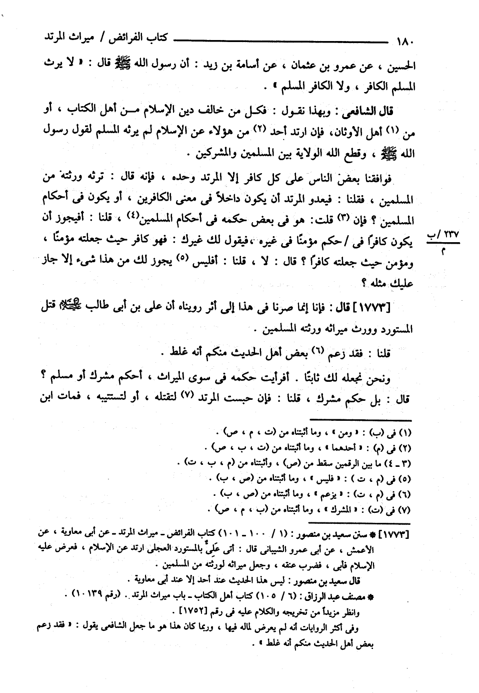 قَالَ الشَّافِعِيُّ : وَبِهَذَا نَقُولُ فَكُلُّ مَنْ خَالَفَ دِينَ الْإِسْلاَمِ مِنْ أَهْلِ الْكِتَابِ وَمِنْ أَهْلِ الْأَوْثَانِ فَإِنْ ارْتَدَّ أَحَدٌ مِنْ هَؤُلاَءِ عَنْ الْإِسْلاَمِ لَمْ يَرِثْهُ الْمُسْلِمُ لِقَوْلِ رَسُولِ اللَّهِ - صلى الله عليه وسلم - , وَقَطْعِ اللَّهِ الْوِلاَيَةَ بَيْنَ الْمُسْلِمِينَ وَالْمُشْرِكِينَ , فَوَافَقْنَا بَعْضَ النَّاسِ عَلَى كُلِّ كَافِرٍ إلَّا الْمُرْتَدَّ وَحْدَهُ فَإِنَّهُ قَالَ تَرِثُهُ وَرَثَتُهُ مِنْ الْمُسْلِمِينَ فَقُلْنَا فَيَعْدُو الْمُرْتَدُّ أَنْ يَكُونَ دَاخِلاً فِي مَعْنَى الْكَافِرِينَ , أَوْ يَكُونَ فِي أَحْكَامِ الْمُسْلِمِينَ ؟ فَإِنْ قُلْت : هُوَ فِي بَعْضِ حُكْمِهِ فِي أَحْكَامِ الْمُسْلِمِينَ , قُلْنَا أَفَيَجُوزُ أَنْ يَكُونَ كَافِرًا فِي حُكْمٍ مُؤْمِنًا فِي غَيْرِهِ ؟ فَيَقُولُ لَك غَيْرُك فَهُوَ كَافِرٌ حَيْثُ جَعَلْته مُؤْمِنًا وَمُؤْمِنٌ حَيْثُ جَعَلْته كَافِرًا , قَالَ : لاَ , قُلْنَا أَفَلَيْسَ يَجُوزُ لَك مِنْ هَذَا شَيْءٌ إلَّا جَازَ عَلَيْك مِثْلُهُ ؟ قَالَ : فَإِنَّا إنَّمَا صِرْنَا فِي هَذَا إلَى أَثَرٍ رَوَيْنَاهُ أَنَّ عَلِيَّ بْنَ أَبِي طَالِبٍ رضي الله عنه قَتَلَ الْمُسْتَوْرِدَ وَوَرَّثَ مِيرَاثَهُ وَرَثَتَهُ الْمُسْلِمِينَ قُلْنَا , فَقَدْ زَعَمَ بَعْضُ أَهْلِ الْحَدِيثِ مِنْكُمْ أَنَّهُ غَلَطٌ وَنَحْنُ نَجْعَلُهُ لَك ثَابِتًا أَفَرَأَيْت حُكْمَهُ فِي سِوَى الْمِيرَاثِ أَحُكْمُ مُشْرِكٍ , أَوْ مُسْلِمٍ ؟ قَالَ : بَلْ حُكْمُ مُشْرِكٍ قُلْنَا فَإِنْ حَبَسْت الْمُرْتَدَّ لِقَتْلِهِ أَوْ لِتَسْتَتِيبَهُ فَمَاتَ ابْنٌ@