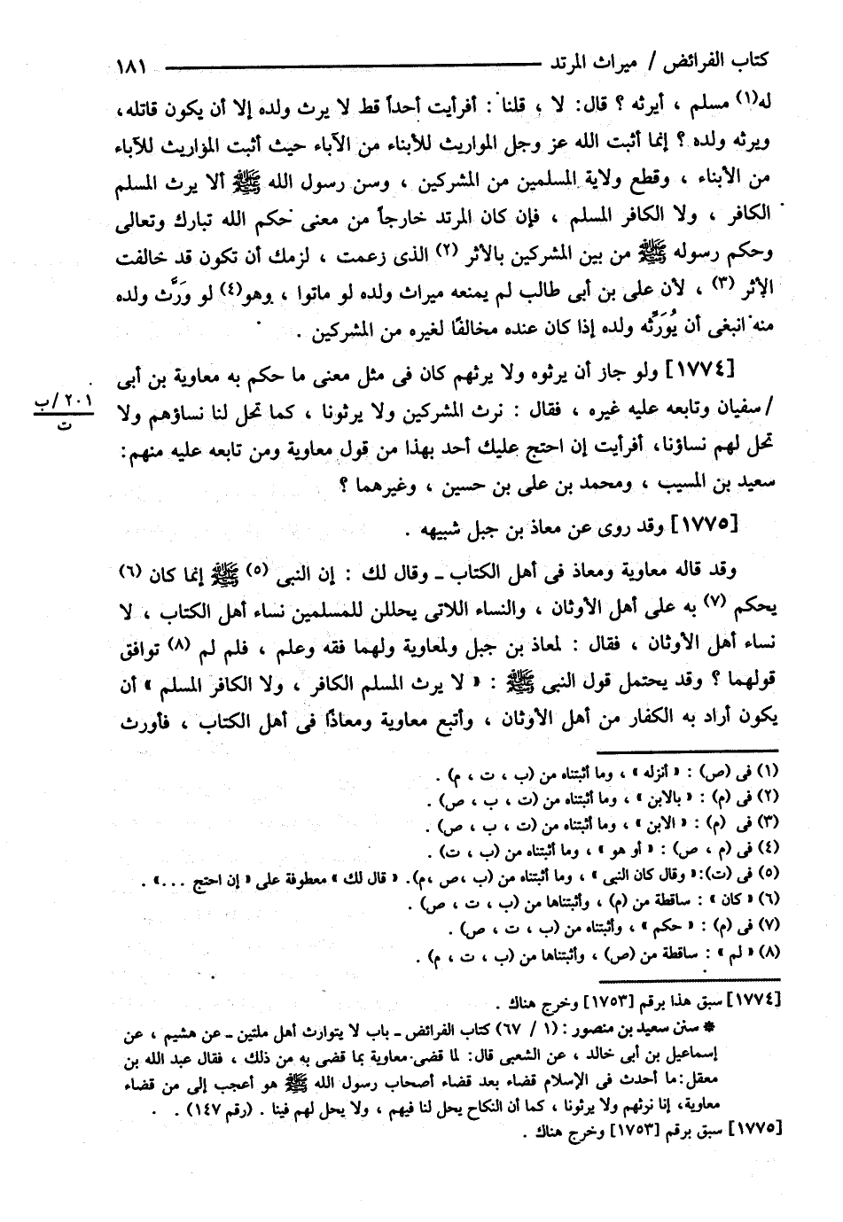 لَهُ مُسْلِمٌ أَيَرِثُهُ ؟ قَالَ : لاَ , قُلْنَا أَفَرَأَيْت أَحَدًا قَطُّ لاَ يَرِثُ وَلَدَهُ إلَّا أَنْ يَكُونَ قَاتِلَهُ وَيَرِثُهُ وَلَدُهُ ؟ إنَّمَا أَثْبَتَ اللَّهُ عَزَّ وَجَلَّ الْمَوَارِيثَ لِلْأَبْنَاءِ مِنْ الْآبَاءِ حَيْثُ أَثْبَتَ الْمَوَارِيثَ لِلْآبَاءِ مِنْ الْأَبْنَاءِ وَقَطَعَ وِلاَيَةَ الْمُسْلِمِينَ مِنْ الْمُشْرِكِينَ وَسَنَّ رَسُولُ اللَّهِ - صلى الله عليه وسلم - أَنْ { لاَ يَرِثَ الْمُسْلِمُ الْكَافِرَ , وَلاَ الْكَافِرُ الْمُسْلِمَ } فَإِنْ كَانَ الْمُرْتَدُّ خَارِجًا مِنْ مَعْنَى حُكْمِ اللَّهِ تَبَارَكَ وَتَعَالَى وَحُكْمِ رَسُولِهِ - صلى الله عليه وسلم - مِنْ بَيْنِ الْمُشْرِكِينَ بِالْأَثَرِ الَّذِي زَعَمْت لَزِمَك أَنْ تَكُونَ قَدْ خَالَفْت الْأَثَرَ ; لِأَنَّ عَلِيَّ بْنَ أَبِي طَالِبٍ رضي الله عنه لَمْ يَمْنَعْهُ مِيرَاثَ وَلَدِهِ لَوْ مَاتُوا , وَهُوَ لَوْ وَرَّثَ وَلَدَهُ مِنْهُ انْبَغَى أَنْ يُوَرِّثَهُ وَلَدَهُ إذَا كَانَ عِنْدَهُ مُخَالِفًا لِغَيْرِهِ مِنْ الْمُشْرِكِينَ , وَلَوْ جَازَ أَنْ يَرِثُوهُ , وَلاَ يَرِثُهُمْ كَانَ فِي مِثْلِ مَعْنَى مَا حَكَمَ بِهِ مُعَاوِيَةُ بْنُ أَبِي سُفْيَانَ وَتَابَعَهُ عَلَيْهِ غَيْرُهُ فَقَالَ : نَرِثُ الْمُشْرِكِينَ , وَلاَ يَرِثُونَا كَمَا تَحِلُّ لَنَا نِسَاؤُهُمْ , وَلاَ تَحِلُّ لَهُمْ نِسَاؤُنَا أَفَرَأَيْت إنْ احْتَجَّ عَلَيْك أَحَدٌ بِهَذَا مِنْ قَوْلِ مُعَاوِيَةَ وَمَنْ تَابَعَهُ عَلَيْهِ مِنْهُمْ سَعِيدُ بْنُ الْمُسَيِّبِ وَمُحَمَّدُ بْنُ عَلِيِّ بْنِ الْحُسَيْنِ وَغَيْرُهُمَا , وَقَدْ رُوِيَ عَنْ مُعَاذِ بْنِ جَبَلٍ شَبِيهُهُ . وَقَدْ قَالَهُ مُعَاوِيَةُ وَمُعَاذٌ فِي أَهْلِ الْكِتَابِ , وَقَالَ : لَك إنَّ النَّبِيَّ - صلى الله عليه وسلم - إنَّمَا كَانَ يَحْكُمُ بِهِ عَلَى أَهْلِ الْأَوْثَانِ وَالنِّسَاءِ اللَّاتِي يَحْلِلْنَ لِلْمُسْلِمِينَ نِسَاءِ أَهْلِ الْكِتَابِ لاَ نِسَاءِ أَهْلِ الْأَوْثَانِ فَقَالَ : لِمُعَاذِ بْنِ جَبَلٍ وَلِمُعَاوِيَة وَلَهُمَا فِقْهٌ وَعِلْمٌ فَلِمَ لَمْ تُوَافِقْ قَوْلَهُمَا ؟ وَقَدْ يَحْتَمِلُ قَوْلُ النَّبِيِّ - صلى الله عليه وسلم - { لاَ يَرِثُ الْمُسْلِمُ الْكَافِرَ , وَلاَ الْكَافِرُ الْمُسْلِمَ } أَنْ يَكُونَ أَرَادَ بِهِ الْكُفَّارَ مِنْ أَهْلِ الْأَوْثَانِ وَأَتَّبِعُ مُعَاوِيَةَ وَمُعَاذًا فِي أَهْلِ الْكِتَابِ فَأُوَرِّثُ @