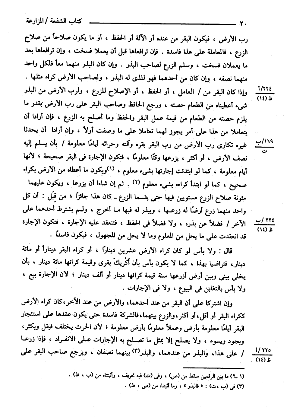 رَبُّ الْأَرْضِ فَيَكُونُ الْبَقَرُ مِنْ عِنْدِهِ أَوْ الْآلَةُ , أَوْ الْحِفْظُ , أَوْ مَا يَكُونُ صَلاَحًا مِنْ صَلاَحِ الزَّرْعِ فَالْمُعَامَلَةُ عَلَى هَذَا فَاسِدَةٌ فَإِنْ تَرَافَعَاهَا قَبْلَ أَنْ يَعْمَلاَ فُسِخَتْ , وَإِنْ تَرَافَعَاهَا بَعْدَمَا يَعْمَلاَنِ فُسِخَتْ وَسُلِّمَ الزَّرْعُ لِصَاحِبِ الْبَذْرِ , وَإِنْ كَانَ الْبَذْرُ مِنْهُمَا مَعًا فَلِكُلِّ وَاحِدٍ مِنْهُمَا نِصْفُهُ , وَإِنْ كَانَ مِنْ أَحَدِهِمَا فَهُوَ لِلَّذِي لَهُ الْبَذْرُ وَلِصَاحِبِ الْأَرْضِ كِرَاءُ مِثْلِهَا , وَإِذَا كَانَ الْبَقَرُ مِنْ الْعَامِلِ , أَوْ الْحِفْظُ , أَوْ الْإِصْلاَحُ لِلزَّرْعِ وَلِرَبِّ الْأَرْضِ مِنْ الْبَذْرِ شَيْءٌ أَعْطَيْنَاهُ مِنْ الطَّعَامِ حِصَّتَهُ وَرَجَعَ الْحَافِظُ وَصَاحِبُ الْبَقَرِ عَلَى رَبِّ الْأَرْضِ بِقَدْرِ مَا يَلْزَمُ حِصَّتَهُ مِنْ الطَّعَامِ مِنْ قِيمَةِ عَمَلِ الْبَقَرِ وَالْحِفْظِ وَمَا أَصْلَحَ بِهِ الزَّرْعَ فَإِنْ أَرَادَا أَنْ يَتَعَامَلاَ مِنْ هَذَا عَلَى أَمْرٍ يَجُوزُ لَهُمَا تَعَامَلاَ عَلَى مَا وَصَفْت أَوَّلاً , وَإِنْ أَرَادَا أَنْ يُحْدِثَا غَيْرَهُ تَكَارَى رَبُّ الْأَرْضِ مِنْ رَبِّ الْبَقَرِ بَقَرَهُ وَآلَتَهُ وَحِرَاثَهُ أَيَّامًا مَعْلُومَةً بِأَنْ يُسَلِّمَ إلَيْهِ نِصْفَ الْأَرْضِ , أَوْ أَكْثَرَ يَزْرَعُهَا وَقْتًا مَعْلُومًا فَتَكُونَ الْإِجَارَةُ فِي الْبَقَرِ صَحِيحَةً ; لِأَنَّهَا أَيَّامٌ مَعْلُومُهُ كَمَا لَوْ اُبْتُدِئَتْ إجَارَتُهَا بِشَيْءٍ مَعْلُومٍ وَيَكُونَ مَا أَعْطَاهُ مِنْ الْأَرْضِ بِكِرَاءٍ صَحِيحٍ كَمَا لَوْ ابْتَدَأَ كِرَاءَهُ بِشَيْءٍ مَعْلُومٍ . ثُمَّ إنْ شَاءَا أَنْ يَزْرَعَا وَيَكُونَ عَلَيْهِمَا مُؤْنَةُ صَلاَحِ الزَّرْعِ مُسْتَوِيَيْنِ فِيهَا حَتَّى يَقْسِمَا الزَّرْعَ كَانَ هَذَا جَائِزًا مِنْ قِبَلِ أَنَّ كُلَّ وَاحِدٍ مِنْهُمَا زَرَعَ أَرْضًا لَهُ زَرْعُهَا وَيَبْذُرُ لَهُ فِيهَا مَا أَخْرَجَ , وَلَمْ يَشْتَرِطْ أَحَدُهُمَا عَلَى الْآخَرِ فَضْلاً عَنْ بَذْرِهِ , وَلاَ فَضْلاً فِي الْحِفْظِ فَتَنْعَقِدُ عَلَيْهِ الْإِجَارَةُ فَتَكُونُ الْإِجَارَةُ قَدْ انْعَقَدَتْ عَلَى مَا يَحِلُّ مِنْ الْمَعْلُومِ وَمَا لاَ يَحِلُّ مِنْ الْمَجْهُولِ فَيَكُونُ فَاسِدًا . قَالَ : وَلاَ بَأْسَ لَوْ كَانَ كِرَاءُ الْأَرْضِ عِشْرِينَ دِينَارًا وَكِرَاءُ الْبَقَرِ دِينَارًا أَوْ مِائَةَ دِينَارٍ فَتَرَاضَيَا بِهَذَا كَمَا لاَ يَكُونُ بَأْسٌ بِأَنْ أُكْرِيكَ بَقَرِي وَقِيمَةُ كِرَائِهَا مِائَةُ دِينَارٍ بِأَنْ يُخَلَّى بَيْنِي وَبَيْنَ أَرْضٍ أَزْرَعُهَا سَنَةً قِيمَةُ كِرَائِهَا دِينَارٌ , أَوْ أَلْفُ دِينَارٍ ; لِأَنَّ الْإِجَارَةَ بَيْعٌ , وَلاَ بَأْسَ بِالتَّغَابُنِ فِي الْبُيُوعِ , وَلاَ فِي الْإِجَارَاتِ , وَإِنْ اشْتَرَكَا عَلَى أَنَّ الْبَقَرَ مِنْ عِنْدِ أَحَدِهِمَا وَالْأَرْضَ مِنْ عِنْدِ الْآخَرِ كَانَ كِرَاءُ الْأَرْضِ كَكِرَاءِ الْبَقَرِ , أَوْ أَقَلَّ وَالزَّرْعُ بَيْنَهُمَا فَالشَّرِكَةُ فَاسِدَةٌ حَتَّى يَكُونَ عَقْدُهَا عَلَى اسْتِئْجَارِ الْبَقَرِ أَيَّامًا مَعْلُومَةً وَعَمَلاً مَعْلُومًا بِأَرْضٍ مَعْلُومَةٍ ; لِأَنَّ الْحَرْثَ يَخْتَلِفُ فَيَقِلُّ وَيَكْثُرُ وَيَجُودُ وَيَسُوءُ , وَلاَ يَصْلُحُ إلَّا بِمِثْلِ مَا تَصْلُحُ بِهِ الْإِجَارَاتُ عَلَى الِانْفِرَادِ , فَإِذَا زَرَعَا عَلَى هَذَا وَالْبَذْرُ مِنْ عِنْدِهِمَا فَالْبَذْرُ بَيْنَهُمَا نِصْفَانِ وَيَرْجِعُ صَاحِبُ الْبَقَرِ عَلَى@
