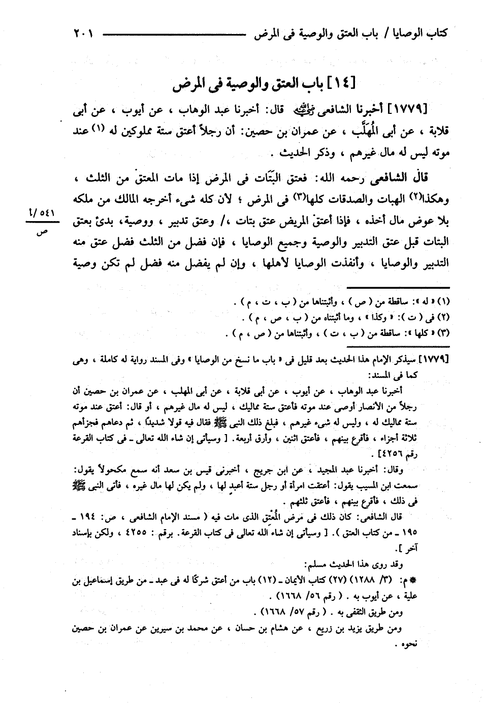 بَابُ الْعِتْقِ وَالْوَصِيَّةِ فِي الْمَرَضِ أَخْبَرَنَا الشَّافِعِيُّ قَالَ : أَخْبَرَنَا عَبْدُ الْوَهَّابِ عَنْ أَيُّوبَ عَنْ أَبِي قِلاَبَةَ عَنْ أَبِي الْمُهَلَّبِ عَنْ عِمْرَانَ بْنِ حُصَيْنٍ أَنَّ رَجُلاً أَعْتَقَ سِتَّةَ مَمْلُوكِينَ لَهُ عِنْدَ مَوْتِهِ لَيْسَ لَهُ مَالٌ غَيْرُهُمْ , وَذَكَرَ الْحَدِيثَ .