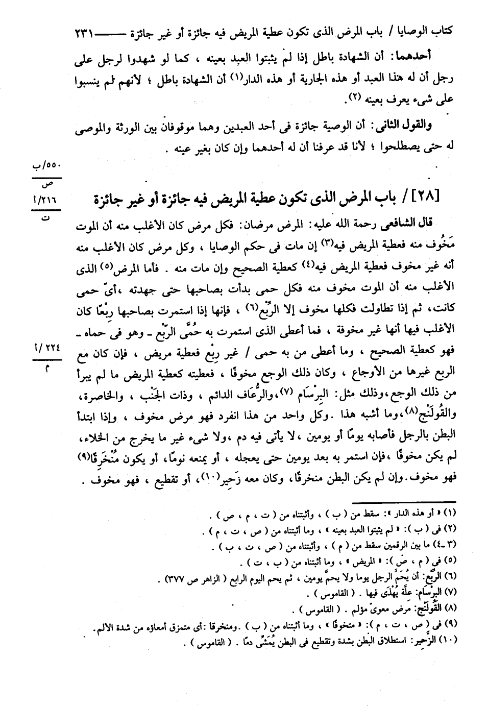 قَالَ الشَّافِعِيُّ : رحمه الله تعالى الْمَرَضُ مَرَضَانِ فَكُلُّ مَرَضٍ كَانَ الْأَغْلَبُ مِنْهُ أَنَّ الْمَوْتَ مَخُوفٌ مِنْهُ فَعَطِيَّةُ الْمَرِيضِ فِيهِ إنْ مَاتَ فِي حُكْمِ الْوَصَايَا وَكُلُّ مَرَضٍ كَانَ الْأَغْلَبُ مِنْهُ أَنَّهُ غَيْرُ مَخُوفٍ فَعَطِيَّةُ الْمَرِيضِ فِيهِ كَعَطِيَّةِ الصَّحِيحِ , وَإِنْ مَاتَ مِنْهُ , فَأَمَّا الْمَرَضُ الَّذِي الْأَغْلَبُ مِنْهُ أَنَّ الْمَوْتَ مَخُوفٌ مِنْهُ فَكُلُّ حُمَّى بَدَأَتْ بِصَاحِبِهَا حَتَّى جَهِدَته أَيَّ حُمَّى كَانَتْ , ثُمَّ إذَا تَطَاوَلَتْ فَكُلُّهَا مَخُوفٌ إلَّا الرِّبْعَ فَإِنَّهَا إذَا اسْتَمَرَّتْ بِصَاحِبِهَا رِبْعًا كَانَ الْأَغْلَبُ فِيهَا أَنَّهَا غَيْرُ مَخُوفَةٍ فَمَا أَعْطَى الَّذِي اسْتَمَرَّتْ بِهِ حُمَّى الرِّبْعِ , وَهُوَ فِي حُمَّاهُ فَهُوَ كَعَطِيَّةِ الصَّحِيحِ وَمَا أَعْطَى مَنْ بِهِ حُمَّى غَيْرُ رِبْعٍ فَعَطِيَّةُ مَرِيضٍ , فَإِنْ كَانَ مَعَ الرِّبْعِ غَيْرُهَا مِنْ الْأَوْجَاعِ وَكَانَ ذَلِكَ الْوَجَعُ مَخُوفًا فَعَطِيَّتُهُ كَعَطِيَّةِ الْمَرِيضِ مَا لَمْ يَبْرَأْ مِنْ ذَلِكَ الْوَجَعِ وَذَلِكَ مِثْلُ الْبِرْسَامِ وَالرُّعَافِ الدَّائِمِ وَذَاتِ الْجَنْبِ وَالْخَاصِرَةِ وَالْقُولَنْجِ وَمَا أَشْبَهَ هَذَا وَكُلُّ وَاحِدٍ مِنْ هَذَا انْفَرَدَ فَهُوَ مَرَضٌ مَخُوفٌ , وَإِذَا ابْتَدَأَ الْبَطْنُ بِالرَّجُلِ فَأَصَابَهُ يَوْمًا أَوْ يَوْمَيْنِ لاَ يَأْتِي فِيهِ دَمٌ , وَلاَ شَيْءٌ غَيْرُ مَا يَخْرُجُ مِنْ الْخَلاَءِ لَمْ يَكُنْ مَخُوفًا , فَإِنْ اسْتَمَرَّ بِهِ بَعْدَ يَوْمَيْنِ حَتَّى يُعَجِّلَهُ , أَوْ يَمْنَعَهُ نَوْمًا , أَوْ يَكُونَ مُنْخَرِقًا فَهُوَ مَخُوفٌ وَإِنْ لَمْ يَكُنْ الْبَطْنُ مُنْخَرِقًا وَكَانَ مَعَهُ زَحِيرٌ , أَوْ تَقْطِيعٌ فَهُوَ مَخُوفٌ@