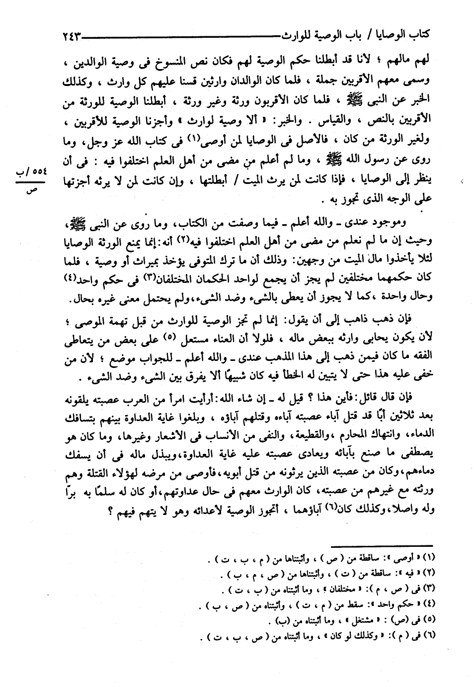 لَهُمْ مَا لَهُمْ ; لِأَنَّا قَدْ أَبْطَلْنَا حُكْمَ الْوَصِيَّةِ لَهُمْ فَكَانَ نَصُّ الْمَنْسُوخِ فِي وَصِيَّةِ الْوَالِدَيْنِ وَسَمَّى مَعَهُمْ الْأَقْرَبِينَ جُمْلَةً فَلَمَّا كَانَ الْوَالِدَانِ وَارِثَيْنِ قِسْنَا عَلَيْهِمْ كُلَّ وَارِثٍ , وَكَذَلِكَ الْخَبَرُ عَنْ النَّبِيِّ - صلى الله عليه وسلم - فَلَمَّا كَانَ الْأَقْرَبُونَ وَرَثَةً وَغَيْرَ وَرَثَةٍ أَبْطَلْنَا الْوَصِيَّةَ لِلْوَرَثَةِ مِنْ الْأَقْرَبِينَ بِالنَّصِّ وَالْقِيَاسِ وَالْخَبَرِ {أَلاَ لاَ وَصِيَّةَ لِوَارِثٍ} وَأَجَزْنَا الْوَصِيَّةَ لِلْأَقْرَبَيْنِ وَلِغَيْرِ الْوَرَثَةِ مَنْ كَانَ فَالْأَصْلُ فِي الْوَصَايَا لِمَنْ أَوْصَى فِي كِتَابِ اللَّهِ عَزَّ وَجَلَّ وَمَا رُوِيَ عَنْ رَسُولِ اللَّهِ - صلى الله عليه وسلم - وَمَا لَمْ أَعْلَمْ مَنْ مَضَى مِنْ أَهْلِ الْعِلْمِ اخْتَلَفُوا فِيهِ فِي أَنْ يُنْظَرَ إلَى الْوَصَايَا , فَإِذَا كَانَتْ لِمَنْ يَرِثُ الْمَيِّتَ أَبْطَلْتهَا , وَإِنْ كَانَتْ لِمَنْ لاَ يَرِثُهُ أَجَزْتهَا عَلَى الْوَجْهِ الَّذِي تَجُوزُ بِهِ وَمَوْجُودٌ عِنْدِي وَاَللَّهُ تَعَالَى أَعْلَمُ فِيمَا وَصَفْت مِنْ الْكِتَابِ وَمَا رُوِيَ عَنْ النَّبِيِّ - صلى الله عليه وسلم - وَحَيْثُ إنَّ مَا لَمْ نَعْلَمْ مَنْ مَضَى مِنْ أَهْلِ الْعِلْمِ اخْتَلَفُوا فِيهِ أَنَّهُ إنَّمَا يُمْنَعُ الْوَرَثَةُ الْوَصَايَا لِئَلَّا يَأْخُذُوا مَالَ الْمَيِّتِ مِنْ وَجْهَيْنِ , وَذَلِكَ أَنَّ مَا تَرَكَ الْمُتَوَفَّى يُؤْخَذُ بِمِيرَاثٍ , أَوْ وَصِيَّةٍ فَلَمَّا كَانَ حُكْمُهُمَا مُخْتَلِفَيْنِ لَمْ يَجُزْ أَنْ يُجْمَعَ لِوَاحِدٍ الْحُكْمَانِ الْمُخْتَلِفَانِ فِي حُكْمٍ وَاحِدٍ وَحَالٍ وَاحِدَةٍ كَمَا لاَ يَجُوزُ أَنْ يُعْطَى بِالشَّيْءِ وَضِدِّ الشَّيْءِ , وَلَمْ يَحْتَمِلْ مَعْنًى غَيْرَهُ فَإِنْ ذَهَبَ ذَاهِبٌ إلَى أَنْ يَقُولَ إنَّمَا لَمْ تَجُزْ الْوَصِيَّةُ لِلْوَارِثِ مِنْ قِبَلِ تُهْمَةِ الْمُوصِي لاََنْ يَكُونَ يُحَابِي وَارِثَهُ بِبَعْضِ مَالِهِ. فَلَوْلاَ أَنَّ الْعَنَاءَ مُسْتَعْلٍ عَلَى بَعْضِ مَنْ يَتَعَاطَى الْفِقْهَ مَا كَانَ فِيمَنْ ذَهَبَ إلَى هَذَا الْمَذْهَب عِنْدِي وَاَللَّهُ أَعْلَمُ لِلْجَوَابِ مَوْضِعٌ ; لِأَنَّ مَنْ خَفِيَ عَلَيْهِ هَذَا حَتَّى لاَ يَتَبَيَّنَ لَهُ الْخَطَأُ فِيهِ كَانَ شَبِيهًا أَنْ لاَ يُفَرِّقَ بَيْنَ الشَّيْءِ وَضِدِّ الشَّيْءِ فَإِنْ قَالَ: قَائِلٌ فَأَيْنَ هَذَا؟ قِيلَ لَهُ إنْ شَاءَ اللَّهُ تَعَالَى أَرَأَيْت امْرَأً مِنْ الْعَرَبِ عَصَبَتُهُ يَلْقَوْنَهُ بَعْدَ ثَلاَثِينَ أَبًا قَدْ قَتَلَ آبَاءَ عَصَبَتِهِ آبَاءَهُ وَقَتَلَهُمْ آبَاؤُهُ وَبَلَغُوا غَايَةَ الْعَدَاوَةِ بَيْنَهُمْ بتسافك الدِّمَاءِ وَانْتِهَاكِ الْمَحَارِمِ وَالْقَطِيعَةِ وَالنَّفْيِ مِنْ الْأَنْسَابِ فِي الْأَشْعَارِ وَغَيْرِهَا وَمَا كَانَ هُوَ يَصْطَفِي مَا صُنِعَ بِآبَائِهِ وَيُعَادِي عَصَبَتُهُ عَلَيْهِ غَايَةَ الْعَدَاوَةِ وَيَبْذُلُ مَالَهُ فِي أَنْ يَسْفِكَ دِمَاءَهُمْ وَكَانَ مِنْ عَصَبَتِهِ الَّذِينَ يَرِثُونَهُ مَنْ قَتَلَ أَبَوَيْهِ فَأَوْصَى مِنْ مَرَضِهِ لِهَؤُلاَءِ الْقَتَلَةِ وَهُمْ وَرَثَتُهُ مَعَ غَيْرِهِمْ مِنْ عَصَبَتِهِ كَانَ الْوَارِثُ مَعَهُمْ فِي حَالِ عَدَاوَتِهِمْ , أَوْ كَانَ لَهُ سِلْمًا بِهِ بَرًّا وَلَهُ وَاصِلاً , وَكَذَلِكَ كَانَ آبَاؤُهُمَا أَتَجُوزُ الْوَصِيَّةُ لِأَعْدَائِهِ , وَهُوَ لاَ يُتَّهَمُ فِيهِمْ؟.@