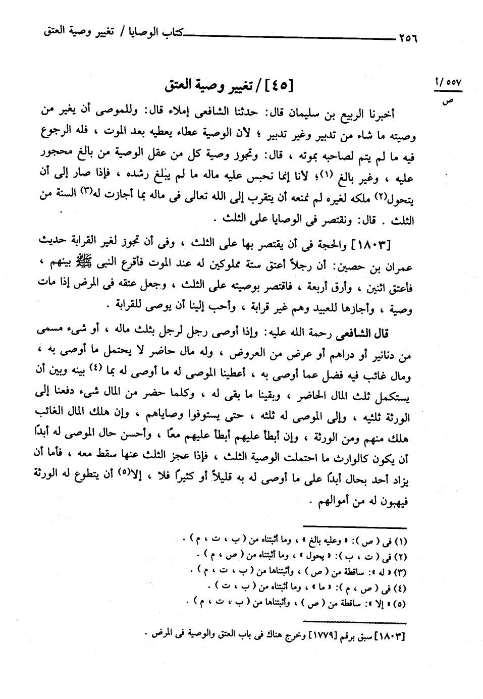 تَغْيِيرُ وَصِيَّةِ الْعِتْقِ أَخْبَرَنَا الرَّبِيعُ بْنُ سُلَيْمَانَ قَالَ : حَدَّثَنَا الشَّافِعِيُّ إمْلاَءً قَالَ : وَلِلْمُوصِي أَنْ يُغَيِّرَ مِنْ وَصِيَّتِهِ مَا شَاءَ مِنْ تَدْبِيرٍ وَغَيْرِ تَدْبِيرٍ ; لِأَنَّ الْوَصِيَّةَ عَطَاءٌ يُعْطِيهِ بَعْدَ الْمَوْتِ فَلَهُ الرُّجُوعُ فِيهِ مَا لَمْ يَتِمَّ لِصَاحِبِهِ بِمَوْتِهِ , قَالَ : وَتَجُوزُ وَصِيَّةُ كُلِّ مَنْ عَقَلَ الْوَصِيَّةَ مِنْ بَالِغٍ مَحْجُورٍ عَلَيْهِ وَغَيْرِ بَالِغٍ لِأَنَّا إنَّمَا نَحْبِسُ عَلَيْهِ مَالَهُ مَا لَمْ يَبْلُغْ رُشْدَهُ , فَإِذَا صَارَ إلَى أَنْ يُحَوِّلَ مِلْكَهُ لِغَيْرِهِ لَمْ نَمْنَعْهُ أَنْ يَتَقَرَّبَ إلَى اللَّهِ تَعَالَى فِي مَالِهِ بِمَا أَجَازَتْ لَهُ السُّنَّةُ مِنْ الثُّلُثِ , قَالَ : وَنَقْتَصِرُ فِي الْوَصَايَا عَلَى الثُّلُثِ , وَالْحُجَّةُ فِي أَنْ يُقْتَصَرَ بِهَا عَلَى الثُّلُثِ , وَفِي أَنْ تَجُوزَ لِغَيْرِ الْقَرَابَةِ حَدِيثُ عِمْرَانَ بْنِ حُصَيْنٍ { أَنْ رَجُلاً أَعْتَقَ سِتَّةً مَمْلُوكِينَ لَهُ عِنْدَ الْمَوْتِ فَأَقْرَعَ النَّبِيُّ - صلى الله عليه وسلم - بَيْنَهُمْ فَأَعْتَقَ اثْنَيْنِ وَأَرَقَّ أَرْبَعَةً } فَاقْتَصَرَ بِوَصِيَّتِهِ عَلَى الثُّلُثِ وَجَعَلَ عِتْقَهُ فِي الْمَرَضِ إذَا مَاتَ وَصِيَّةً وَأَجَازَهَا لِلْعَبِيدِ وَهُمْ غَيْرُ قَرَابَةٍ وَأُحِبُّ إلَيْنَا أَنْ يُوصِيَ لِلْقَرَابَةِ