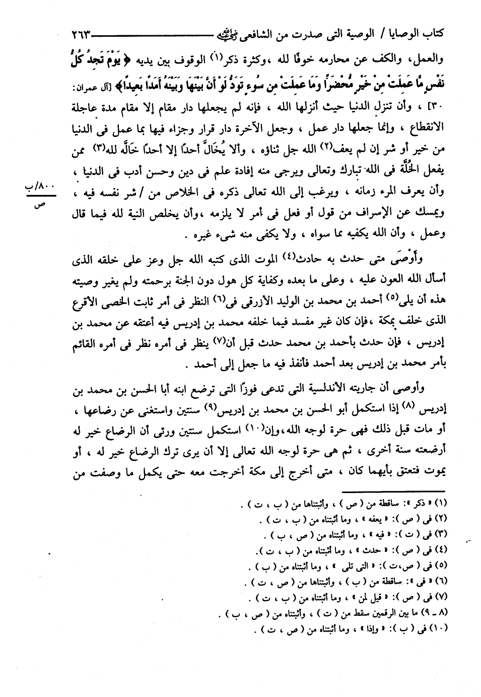 وَالْعَمَلِ وَالْكَفِّ عَنْ مَحَارِمِهِ خَوْفًا لِلَّهِ وَكَثْرَةِ ذِكْرِ الْوُقُوفِ بَيْنَ يَدَيْهِ { يَوْمَ تَجِدُ كُلُّ نَفْسٍ مَا عَمِلَتْ مِنْ خَيْرٍ مُحْضَرًا وَمَا عَمِلَتْ مِنْ سُوءٍ تَوَدُّ لَوْ أَنَّ بَيْنَهَا وَبَيْنَهُ أَمَدًا بَعِيدًا } وَأَنْ تُنْزِلَ الدُّنْيَا حَيْثُ أَنْزَلَهَا اللَّهُ فَإِنَّهُ لَمْ يَجْعَلْهَا دَارَ مَقَامٍ إلَّا مَقَامَ مُدَّةٍ عَاجِلَةِ الِانْقِطَاعِ , وَإِنَّمَا جَعَلَهَا دَارَ عَمَلٍ وَجَعَلَ الْآخِرَةَ دَارَ قَرَارٍ وَجَزَاءٍ فِيهَا بِمَا عَمِلَ فِي الدُّنْيَا مِنْ خَيْرٍ , أَوْ شَرٍّ إنْ لَمْ يَعْفُ اللَّهُ جَلَّ ثَنَاؤُهُ , وَأَنْ لاَ يُخَالَّ أَحَدًا إلَّا أَحَدًا خَالَّهُ لِلَّهِ فَمَنْ يَفْعَلْ الْخُلَّةَ فِي اللَّهِ تَبَارَكَ وَتَعَالَى وَيُرْجَى مِنْهُ إفَادَةَ عِلْمٍ فِي دِينٍ وَحُسْنِ أَدَبٍ فِي الدُّنْيَا , وَأَنْ يَعْرِفَ الْمَرْءُ زَمَانَهُ وَيَرْغَبَ إلَى اللَّهِ تَعَالَى ذِكْرُهُ فِي الْخَلاَصِ مِنْ شَرِّ نَفْسِهِ فِيهِ , وَيُمْسِكَ عَنْ الْإِسْرَافِ مِنْ قَوْلٍ , أَوْ فِعْلٍ فِي أَمْرٍ لاَ يَلْزَمُهُ وَأَنْ يُخْلِصَ النِّيَّةَ لِلَّهِ عَزَّ وَجَلَّ فِيمَا قَالَ : وَعَمِلَ , وَأَنَّ اللَّهَ تَعَالَى يَكْفِيهِ مِمَّا سِوَاهُ , وَلاَ يَكْفِي مِنْهُ شَيْءٌ غَيْرُهُ , وَأَوْصَى مَتَى حَدَثَ بِهِ حَادِثُ الْمَوْتِ الَّذِي كَتَبَهُ اللَّهُ جَلَّ وَعَزَّ عَنْ خَلْقِهِ الَّذِي أَسْأَلُ اللَّهَ الْعَوْنَ عَلَيْهِ , وَعَلَى مَا بَعْدَهُ وَكِفَايَةَ كُلِّ هَوْلٍ دُونَ الْجَنَّةِ بِرَحْمَتِهِ , وَلَمْ يُغَيِّرْ وَصِيَّتَهُ هَذِهِ , أَنْ يَلِيَ أَحْمَدُ بْنُ مُحَمَّدِ بْنِ الْوَلِيدِ الْأَزْرَقِيُّ النَّظَرَ فِي أَمْرِ ثَابِتٍ الْخَصِيِّ الْأَقْرَعِ الَّذِي خَلَفَ بِمَكَّةَ , فَإِنْ كَانَ غَيْرَ مُفْسِدٍ فِيمَا خَلَّفَهُ مُحَمَّدُ بْنُ إدْرِيسَ فِيهِ أَعْتَقَهُ عَنْ مُحَمَّدِ بْنِ إدْرِيسَ فَإِنْ حَدَثَ بِأَحْمَدَ بْنِ مُحَمَّدٍ حَدَثٌ قَبْلَ أَنْ يَنْظُرَ فِي أَمْرِهِ نَظَرَ فِي أَمْرِهِ الْقَائِمُ بِأَمْرِ مُحَمَّدِ بْنِ إدْرِيسَ بَعْدَ أَحْمَدَ فَأَنْفَذَ فِيهِ مَا جُعِلَ إلَى أَحْمَدَ وَأَوْصَى أَنَّ جَارِيَتَهُ الْأَنْدَلُسِيَّةَ الَّتِي تُدْعَى فَوْزُ الَّتِي تُرْضِعُ ابْنَهُ أَبَا الْحَسَنِ بْنَ مُحَمَّدِ بْنِ إدْرِيسَ إذَا اسْتَكْمَلَ أَبُو الْحَسَنِ بْنُ مُحَمَّدِ بْنِ إدْرِيسَ سَنَتَيْنِ وَاسْتَغْنَى عَنْ رَضَاعِهَا , أَوْ مَاتَ قَبْلَ ذَلِكَ فَهِيَ حُرَّةٌ لِوَجْهِ اللَّهِ تَعَالَى , وَإِذَا اسْتَكْمَلَ سَنَتَيْنِ وَرُئِيَ أَنَّ الرَّضَاعَ خَيْرٌ لَهُ أَرْضَعَتْهُ سَنَةً أُخْرَى , ثُمَّ هِيَ حُرَّةٌ لِوَجْهِ اللَّهِ تَعَالَى إلَّا أَنْ يُرَى أَنَّ تَرْكَ الرَّضَاعِ خَيْرٌ لَهُ أَنْ يَمُوتَ فَتُعْتَقُ بِأَيِّهِمَا كَانَ وَمَتَى أُخْرِجَ إلَى مَكَّةَ أُخْرِجَتْ مَعَهُ حَتَّى يُكْمِلَ مَا وَصَفْت مِنْ@