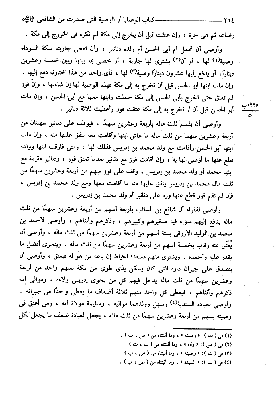 رَضَاعِهِ , ثُمَّ هِيَ حُرَّةٌ , وَإِنْ عَتَقَتْ قَبْلَ أَنْ يَخْرُجَ إلَى مَكَّةَ لَمْ تُكْرَهْ فِي الْخُرُوجِ إلَى مَكَّةَ وَأَوْصَى أَنْ تُحْمَلَ أُمُّ أَبِي الْحَسَنِ أُمُّ وَلَدِهِ دَنَانِيرَ وَأَنْ تُعْطِيَ جَارِيَتَهُ سِكَّةَ السَّوْدَاءَ وَصِيَّةً لَهَا , أَوْ أَنْ يُشْتَرَى لَهَا جَارِيَةٌ , أَوْ خَصِيٌّ بِمَا بَيْنَهَا وَبَيْنَ خَمْسَةٍ وَعِشْرِينَ دِينَارًا , أَوْ يُدْفَعَ إلَيْهَا عِشْرُونَ دِينَارًا وَصِيَّةً لَهَا فَأَيَّ وَاحِدٍ مِنْ هَذَا اخْتَارَتْهُ دُفِعَ إلَيْهَا , وَإِنْ مَاتَ ابْنُهَا أَبَا الْحَسَنِ قَبْلَ أَنْ تَخْرُجَ بِهِ إلَى مَكَّةَ فَهَذِهِ الْوَصِيَّةُ لَهَا إنْ شَاءَتْهَا , وَإِنْ لَمْ تُعْتِقْ حَتَّى تَخْرُجَ بِأَبِي الْحَسَنِ إلَى مَكَّةَ حُمِلَتْ وَابْنُهَا مَعَهَا مَعَ أَبِي الْحَسَنِ , وَإِنْ مَاتَ أَبُو الْحَسَنِ قَبْلَ أَنْ تَخْرُجَ بِهِ إلَى مَكَّةَ عَتَقَتْ فَوْزُ وَأَعْطَيْت ثَلاَثَةَ دَنَانِيرَ وَأَوْصَى أَنْ يُقْسَمَ ثُلُثُ مَالِهِ بِأَرْبَعَةٍ وَعِشْرِينَ سَهْمًا عَلَى دَنَانِيرَ سَهْمَانِ مِنْ أَرْبَعَةٍ وَعِشْرِينَ سَهْمًا مِنْ ثُلُثِ مَالِهِ مَا عَاشَ ابْنُهَا وَأَقَامَتْ مَعَهُ يُنْفَقُ عَلَيْهَا مِنْهُ , وَإِنْ مَاتَ ابْنُهَا أَبُو الْحَسَنِ وَأَقَامَتْ مَعَ وَلَدِ مُحَمَّدِ بْنِ إدْرِيسَ فَذَلِكَ لَهَا وَمَتَى فَارَقَتْ ابْنَهَا وَوَلَدَهُ قُطِعَ عَنْهَا مَا أَوْصَى لَهَا بِهِ , وَإِنْ أَقَامَتْ فَوْزُ مَعَ دَنَانِيرَ بَعْدَمَا تُعْتَقُ فَوْزُ وَدَنَانِيرُ مُقِيمَةٌ مَعَ ابْنِهَا مُحَمَّدٍ , أَوْ وَلَدِ مُحَمَّدِ بْنِ إدْرِيسَ وُقِفَ عَلَى فَوْزَ سَهْمٌ مِنْ أَرْبَعَةٍ وَعِشْرِينَ سَهْمًا مِنْ ثُلُثِ مَالِ مُحَمَّدِ بْنِ إدْرِيسَ يُنْفَقُ عَلَيْهَا مِنْهُ مَا أَقَامَتْ مَعَهَا وَمَعَ وَلَدِ مُحَمَّدِ بْنِ إدْرِيسَ فَإِنْ لَمْ تُقِمْ فَوْزُ قُطِعَ عَنْهَا وَرُدَّ عَلَى دَنَانِيرَ أُمِّ وَلَدِ مُحَمَّدِ بْنِ إدْرِيسَ وَأَوْصَى لِفُقَرَاءِ آلِ شَافِعِ بْنِ السَّائِبِ بِأَرْبَعَةِ أَسْهُمٍ مِنْ أَرْبَعَةٍ وَعِشْرِينَ سَهْمًا مِنْ ثُلُثِ مَالِهِ يُدْفَع إلَيْهِمْ سَوَاءٌ فِيهِ صَغِيرُهُمْ وَكَبِيرُهُمْ وَذَكَرُهُمْ وَإِنَاثُهُمْ وَأَوْصَى لِأَحْمَدَ بْنِ مُحَمَّدِ بْنِ الْوَلِيدِ الْأَزْرَقِيِّ بِسِتَّةِ أَسْهُمٍ مِنْ أَرْبَعَةٍ وَعِشْرِينَ سَهْمًا مِنْ ثُلُثِ مَالِهِ وَأَوْصَى أَنْ يُعْتَقَ عَنْهُ رِقَابٌ بِخَمْسَةِ أَسْهُمٍ مِنْ أَرْبَعَةٍ وَعِشْرِينَ سَهْمًا مِنْ ثُلُثِ مَالِهِ وَيُتَحَرَّى أَفْضَلَ مَا يُقْدَرُ عَلَيْهِ وَأَحْمَدَهُ وَيُشْتَرَى مِنْهُمْ مَسْعَدَة الْخَيَّاطُ إنْ بَاعَهُ مَنْ هُوَ لَهُ فَيُعْتَقُ وَأَوْصَى أَنْ يُتَصَدَّق عَلَى جِيرَانِ دَارِهِ الَّتِي كَانَ يَسْكُنُ بِذِي طُوًى مِنْ مَكَّةَ بِسَهْمٍ وَاحِدٍ مِنْ أَرْبَعَةٍ وَعِشْرِينَ سَهْمًا مِنْ ثُلُثِ مَالِهِ يَدْخُلُ فِيهِمْ كُلُّ مَنْ يَحْوِي إدْرِيسَ وَلاَءَهُ وَمَوَالِي أُمِّهِ ذَكَرُهُمْ وَإِنَاثُهُمْ فَيُعْطِي كُلَّ وَاحِدِ مِنْهُمْ ثَلاَثَةَ أَضْعَافِ مَا يُعْطِي وَاحِدًا مِنْ جِيرَانِهِ وَأَوْصَى لِعُبَادَةَ السِّنْدِيَّةِ وَسَهْلٍ وَوَلَدِهِمَا مَوَالِيَهُ وَسَلِيمَة مَوْلاَةِ أُمِّهِ وَمَنْ أَعْتَقَ فِي وَصِيَّتِهِ بِسَهْمٍ مِنْ أَرْبَعَةٍ وَعِشْرِينَ سَهْمًا مِنْ ثُلُثِ مَالِهِ يَجْعَلُ لِعِبَادَةِ ضَعْفَ مَا يَجْعَلُ لِكُلِّ @