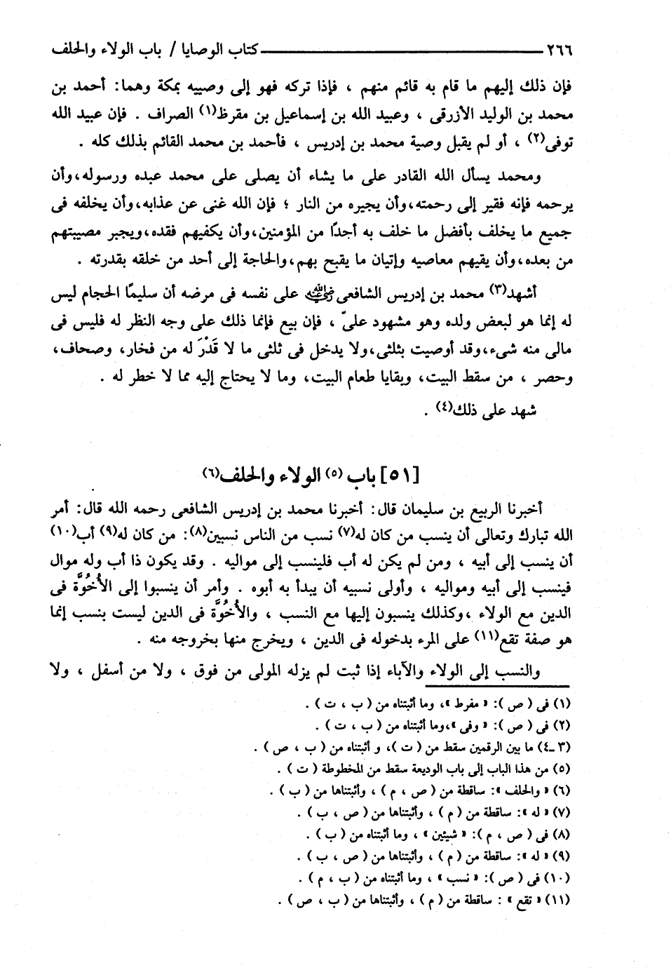 , فَإِنَّ ذَلِكَ إلَيْهِمْ مَا قَامَ بِهِ قَائِمٌ مِنْهُمْ , فَإِذَا تَرَكَهُ فَهُوَ إلَى وَصِيَّيْهِ بِمَكَّةَ وَهُمَا أَحْمَدُ بْنُ مُحَمَّدِ بْنِ الْوَلِيدِ الْأَزْرَقِيُّ وَعُبَيْدُ اللَّهِ بْنُ إسْمَاعِيلَ بْنِ مُقَرِّظ الصَّرَّافُ فَإِنْ عُبَيْدَ اللَّهِ تُوُفِّيَ , أَوْ لَمْ يَقْبَلْ وَصِيَّةَ مُحَمَّدِ بْنِ إدْرِيسَ فَأَحْمَدُ بْنُ مُحَمَّدٍ الْقَائِمُ بِذَلِكَ كُلِّهِ وَمُحَمَّدٌ يَسْأَلُ اللَّهَ الْقَادِرَ عَلَى مَا يَشَاءُ أَنْ يُصَلِّيَ عَلَى سَيِّدِنَا مُحَمَّدٍ عَبْدِهِ وَرَسُولِهِ وَأَنْ يَرْحَمُهُ فَإِنَّهُ فَقِيرٌ إلَى رَحْمَتِهِ وَأَنْ يُجِيرَهُ مِنْ النَّارِ , فَإِنَّ اللَّهَ تَعَالَى غَنِيٌّ عَنْ عَذَابِهِ وَأَنْ يَخْلُفَهُ فِي جَمِيعِ مَا يُخْلَفُ بِأَفْضَلَ مَا خَلَفَ بِهِ أَحَدًا مِنْ الْمُؤْمِنِينَ وَأَنْ يَكْفِيَهُمْ فَقْدَهُ وَيَجْبُرَ مُصِيبَتَهُمْ مِنْ بَعْدِهِ وَأَنْ يَقِيَهُمْ مَعَاصِيَهُ وَإِتْيَانَ مَا يَقْبُحُ بِهِمْ وَالْحَاجَةَ إلَى أَحَدٍ مِنْ خَلْقِهِ بِقُدْرَتِهِ وَلِلَّهِ الْحَمْدُ أَشْهَدَ مُحَمَّدَ بْنَ إدْرِيسَ الشَّافِعِيَّ عَلَى نَفْسِهِ فِي مَرَضِهِ أَنَّ سُلَيْمًا الْحَجَّامَ لَيْسَ إنَّمَا هُوَ لِبَعْضِ وَلَدِهِ , وَهُوَ مَشْهُودٌ عَلَيَّ فَإِنْ بِيعَ فَإِنَّمَا ذَلِكَ عَلَى وَجْهِ النَّظَرِ لَهُ فَلَيْسَ مَالِي مِنْهُ شَيْءٌ , وَقَدْ أَوْصَيْت بِثُلُثِي , وَلاَ يَدْخُلُ فِي ثُلُثِي مَا لاَ قَدْرَ لَهُ مِنْ فُخَّارٍ وَصِحَافٍ وَحُصْر مِنْ سَقْطِ الْبَيْتِ وَبَقَايَا طَعَامِ الْبَيْتِ وَمَا لاَ يُحْتَاجُ إلَيْهِ مِمَّا لاَ خَطَرَ لَهُ شَهِدَ عَلَى ذَلِكَ .