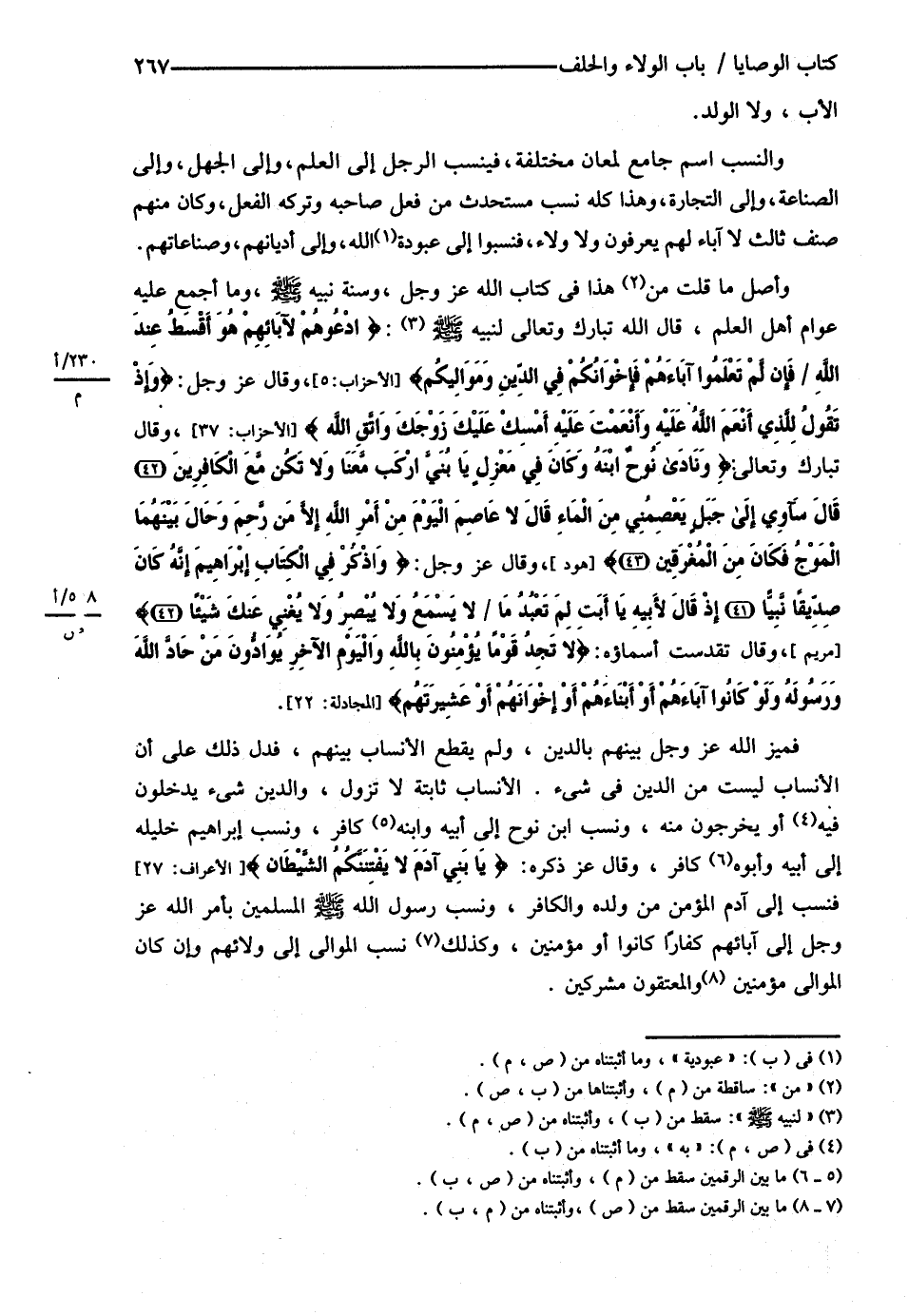 الْأَبُ , وَلاَ الْوَلَدُ وَالنَّسَبُ اسْمٌ جَامِعٌ لَمَعَانٍ مُخْتَلِفَةٍ فَيُنْسَبُ الرَّجُلُ إلَى الْعِلْمِ وَإِلَى الْجَهْلِ وَإِلَى الصِّنَاعَةِ وَإِلَى التِّجَارَةِ , وَهَذَا كُلُّهُ نَسَبٌ مُسْتَحْدَثٌ مِنْ فِعْلِ صَاحِبِهِ وَتَرْكِهِ الْفِعْلَ وَكَانَ مِنْهُمْ صِنْفٌ ثَالِثٌ لاَ آبَاءَ لَهُمْ يُعْرَفُونَ , وَلاَ وَلاَءَ فَنُسِبُوا إلَى عُبُودِيَّةِ اللَّهِ وَإِلَى أَدْيَانِهِمْ وَصِنَاعَاتِهِمْ , وَأَصْلُ مَا قُلْت مِنْ هَذَا فِي كِتَابِ اللَّهِ عَزَّ وَجَلَّ وَسُنَّةِ نَبِيِّهِ - صلى الله عليه وسلم - وَمَا أَجْمَعَ عَلَيْهِ عَوَامُّ أَهْلِ الْعِلْمِ قَالَ: اللَّهِ تَبَارَكَ وَتَعَالَى {اُدْعُوهُمْ لِآبَائِهِمْ هُوَ أَقْسَطُ عِنْدَ اللَّهِ فَإِنْ لَمْ تَعْلَمُوا آبَاءَهُمْ فَإِخْوَانُكُمْ فِي الدِّينِ وَمَوَالِيكُمْ} وَقَالَ: عَزَّ وَجَلَّ: ? وَإِذْ تَقُولُ لِلَّذِي أَنْعَمَ اللَّهُ عَلَيْهِ وَأَنْعَمْت عَلَيْهِ أَمْسِكْ عَلَيْك زَوْجَك وَاتَّقِ اللَّهَ} وَقَالَ: تَبَارَكَ وَتَعَالَى {وَنَادَى نُوحٌ ابْنَهُ وَكَانَ فِي مَعْزِلٍ يَا بُنَيَّ ارْكَبْ مَعَنَا , وَلاَ تَكُنْ مَعَ الْكَافِرِينَ قَالَ: سَآوِي إلَى جَبَلٍ يَعْصِمُنِي مِنْ الْمَاءِ قَالَ: لاَ عَاصِمَ الْيَوْمَ مِنْ أَمْرِ اللَّهِ إلَّا مَنْ رَحِمَ وَحَالَ بَيْنَهُمَا الْمَوْجُ فَكَانَ مِنْ الْمُغْرِقِينَ} وَقَالَ: عَزَّ وَجَلَّ: ? وَاذْكُرْ فِي الْكِتَابِ إبْرَاهِيمَ إنَّهُ كَانَ صِدِّيقًا نَبِيًّا إذْ قَالَ: لِأَبِيهِ يَا أَبَتْ لَمْ تَعْبُدُ مَا لاَ يَسْمَعُ , وَلاَ يُبْصِرُ , وَلاَ يُغْنِي عَنْك شَيْئًا؟} وَقَالَ: تَقَدَّسَتْ أَسْمَاؤُهُ {لاَ تَجِدُ قَوْمًا يُؤْمِنُونَ بِاَللَّهِ وَالْيَوْمِ الْآخِرِ يُوَادُّونَ مَنْ حَادَّ اللَّهَ وَرَسُولَهُ , وَلَوْ كَانُوا آبَاءَهُمْ أَوْ أَبْنَاءَهُمْ , أَوْ إخْوَانَهُمْ أَوْ عَشِيرَتَهُمْ} فَمَيَّزَ اللَّهُ عَزَّ وَجَلَّ بَيْنَهُمْ بِالدِّينِ , وَلَمْ يَقْطَعْ الْأَنْسَابَ بَيْنُهُمْ فَدَلَّ ذَلِكَ عَلَى أَنَّ الْأَنْسَابَ لَيْسَتْ مِنْ الدِّينِ فِي شَيْءٍ. الْأَنْسَابُ ثَابِتَةٌ لاَ تَزُولُ وَالدِّينُ شَيْءٌ يَدْخُلُونَ فِيهِ , أَوْ يَخْرُجُونَ مِنْهُ وَنَسَبَ ابْنَ نُوحٍ إلَى أَبِيهِ وَابْنُهُ كَافِرٌ وَنَسَبَ إبْرَاهِيمُ خَلِيلَهُ إلَى أَبِيهِ وَأَبُوهُ كَافِرٌ وَقَالَ: عَزَّ وَجَلَّ ذِكْرُهُ {يَا بَنِي آدَمَ لاَ يَفْتِنَنكُمْ الشَّيْطَانُ} فَنَسَبَ إلَى آدَمَ الْمُؤْمِنَ مِنْ وَلَدِهِ وَالْكَافِرَ وَنَسَبَ رَسُولُ اللَّهِ - صلى الله عليه وسلم - الْمُسْلِمِينَ بِأَمْرِ اللَّهِ عَزَّ وَجَلَّ إلَى آبَائِهِمْ كُفَّارًا كَانُوا , أَوْ مُؤْمِنِينَ , وَكَذَلِكَ نَسَبَ الْمَوَالِي إلَى , وَلاَئِهِمْ , وَإِنْ كَانَ الْمَوَالِي مُؤْمِنِينَ وَالْمُعْتِقُونَ مُشْرِكِينَ.@