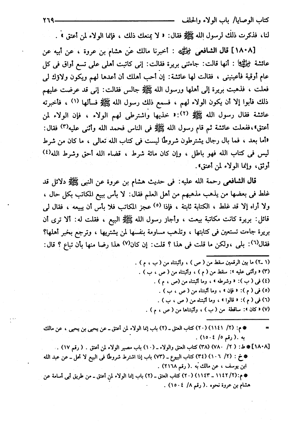 قَالَ الشَّافِعِيُّ: أَخْبَرَنَا مَالِكٌ عَنْ هِشَامٍ عَنْ عُرْوَةَ عَنْ أَبِيهِ {عَنْ عَائِشَةَ رضي الله تعالى عنها أَنَّهَا قَالَتْ جَاءَتْنِي بَرِيرَةُ فَقَالَتْ إنِّي كَاتَبْت أَهْلِي عَلَى تِسْعِ أَوَاقٍ فِي كُلِّ عَامٍ أُوقِيَّةٌ فَأَعِينِينِي فَقَالَتْ لَهَا عَائِشَةُ إنْ أَحَبَّ أَهْلُك أَنْ أُعِدَّهَا لَهُمْ وَيَكُونَ , وَلاَؤُك لِي فَعَلْت فَذَهَبَتْ بَرِيرَةُ إلَى أَهْلِهَا وَرَسُولُ اللَّهِ - صلى الله عليه وسلم - جَالِسٌ فَقَالَتْ إنِّي قَدْ عَرَضْت عَلَيْهِمْ ذَلِكَ فَأَبَوْا إلَّا أَنْ يَكُونَ الْوَلاَءُ لَهُمْ فَسَمِعَ ذَلِكَ رَسُولُ اللَّهِ - صلى الله عليه وسلم - فَسَأَلَهَا فَأَخْبَرَتْهُ عَائِشَةُ فَقَالَ: - صلى الله عليه وسلم - خُذِيهَا وَاشْتَرِطِي لَهُمْ الْوَلاَءَ , فَإِنَّ الْوَلاَءَ لِمَنْ أَعْتَقَ فَفَعَلَتْ عَائِشَةُ , ثُمَّ قَامَ رَسُولُ اللَّهِ - صلى الله عليه وسلم - فِي النَّاسِ فَحَمِدَ اللَّهَ وَأَثْنَى عَلَيْهِ فَقَالَ: أَمَّا بَعْدُ فَمَا بَالُ رِجَالٍ يَشْتَرِطُونَ شُرُوطًا لَيْسَتْ فِي كِتَابِ اللَّهِ تَعَالَى مَا كَانَ مِنْ شَرْطٍ لَيْسَ فِي كِتَابِ اللَّهِ فَهُوَ بَاطِلٌ , وَإِنْ كَانَ مِائَةَ شَرْطٍ قَضَاءُ اللَّهِ أَحَقُّ وَشَرْطُهُ أَوْثَقُ , وَإِنَّمَا الْوَلاَءُ لِمَنْ أَعْتَقَ}.