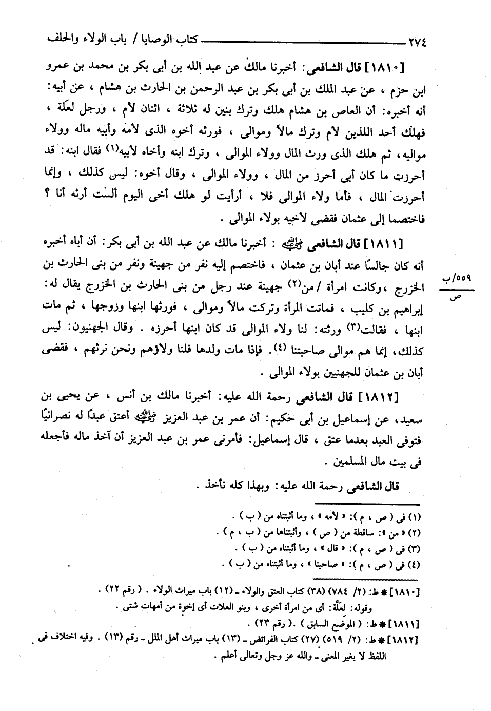قَالَ الشَّافِعِيُّ : أَخْبَرَنَا مَالِكُ بْنُ أَنَسٍ عَنْ يَحْيَى بْنِ سَعِيدٍ عَنْ إسْمَاعِيلَ بْنِ أَبِي حَكِيمٍ أَنَّ عُمَرَ بْنَ عَبْدِ الْعَزِيزِ أَعْتَقَ عَبْدًا لَهُ نَصْرَانِيًّا فَتُوُفِّيَ الْعَبْدُ بَعْدَمَا عَتَقَ قَالَ إسْمَاعِيلُ فَأَمَرَنِي عُمَرُ بْنُ عَبْدِ الْعَزِيزِ أَنْ آخُذَ مَالَهُ فَأَجْعَلَهُ فِي بَيْتِ مَالِ الْمُسْلِمِينَ .