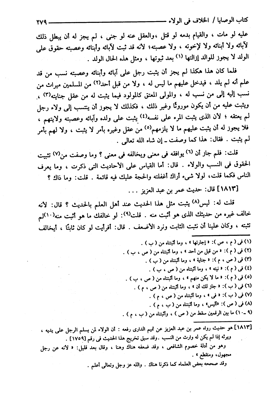 عَلَيْهِ لَوْ مَاتَ وَالْقِيَامِ بِدَمِهِ لَوْ قُتِلَ وَالْعَقْلِ عَنْهُ لَوْ جَنَى , لَمْ يَجُزْ لَهُ أَنْ يُبْطِلَ ذَلِكَ لِآبَائِهِ , وَلاَ أَبْنَائِهِ , وَلاَ لِإِخْوَتِهِ , وَلاَ عَصَبَتِهِ ; لِأَنَّهُ قَدْ ثَبَتَ لِآبَائِهِ وَأَبْنَائِهِ وَعَصَبَتِهِ حُقُوقٌ عَلَى الْوَلَدِ لاَ يَجُوزُ لِلْوَالِدِ إزَالَتُهَا بَعْدَ ثُبُوتِهَا , وَمِثْلُ هَذِهِ الْحَالِ الْوَلَدُ . فَلَمَّا كَانَ هَذَا هَكَذَا لَمْ يَجُزْ أَنْ يُثْبِتَ رَجُلٌ عَلَى آبَائِهِ وَأَبْنَائِهِ وَعَصَبَتِهِ نَسَبَ مَنْ قَدْ عَلِمَ أَنَّهُ لَمْ يَلِدْهُ فَيُدْخِلَ عَلَيْهِمْ مَا لَيْسَ لَهُ , وَلاَ مِنْ قِبَلِ أَحَدٍ مِنْ الْمُسْلِمِينَ مِيرَاثَ مِنْ نُسِبَ إلَيْهِ مَنْ نُسِبَ لَهُ وَالْمَوْلَى الْمُعْتَقُ كَالْمَوْلُودِ فِيمَا يَثْبُتُ لَهُ مِنْ عَقْلِ جِنَايَتِهِ وَيَثْبُتُ عَلَيْهِ مِنْ أَنْ يَكُونَ مَوْرُوثًا وَغَيْرِ ذَلِكَ , فَكَذَلِكَ لاَ يَجُوزُ أَنْ يَنْتَسِبَ إلَى وَلاَءِ رَجُلٍ لَمْ يُعْتِقْهُ ; لِأَنَّ الَّذِي يُثْبِتُ الْمَرْءُ عَلَى نَفْسِهِ يُثْبِتُ عَلَى وَلَدِهِ وَآبَائِهِ وَعَصَبَتِهِ وِلاَيَتَهُمْ , فَلاَ يَجُوزُ لَهُ أَنْ يُثْبِتَ عَلَيْهِمْ مَا لاَ يَلْزَمُهُمْ مِنْ عَقْلٍ وَغَيْرِهِ بِأَمْرٍ لاَ يَثْبُتُ , وَلاَ لَهُمْ بِأَمْرٍ لَمْ يَثْبُتْ . فَقَالَ : هَذَا كَمَا وَصَفْت إنْ شَاءَ اللَّهُ تَعَالَى قُلْت فَلِمَ جَازَ لَك أَنْ تُوَافِقَهُ فِي مَعْنًى وَتُخَالِفَهُ فِي مَعْنًى ؟ وَمَا وَصَفْت فِي تَثْبِيتِ الْحُقُوقِ فِي النَّسَبِ وَالْوَلاَءِ . قَالَ : أَمَّا الْقِيَاسُ عَلَى الْأَحَادِيثِ الَّتِي ذَكَرْت وَمَا يَعْرِفُ النَّاسُ فَكَمَا قُلْت لَوْلاَ شَيْءٌ أَرَاك أَغْفَلْته وَالْحُجَّةُ عَلَيْك فِيهِ قَائِمَةٌ . قُلْت وَمَا ذَاكَ ؟ قَالَ : حَدِيثُ عُمَرَ بْنِ عَبْدِ الْعَزِيزِ قُلْت لَهُ لَيْسَ يَثْبُتُ مِثْلُ هَذَا الْحَدِيثِ عِنْدَ أَهْلِ الْعِلْمِ بِالْحَدِيثِ . قَالَ : لِأَنَّهُ خَالَفَ غَيْرَهُ مِنْ حَدِيثِك الَّذِي هُوَ أَثْبَتُ مِنْهُ . قُلْت لَوْ خَالَفَك مَا هُوَ أَثْبُتُ مِنْهُ لَمْ نُثْبِتْهُ وَكَانَ عَلَيْنَا أَنْ نُثْبِتَ الثَّابِتَ وَنَرُدَّ الْأَضْعَفَ . قَالَ : أَفَرَأَيْت لَوْ كَانَ ثَابِتًا أَيُخَالِفُ@