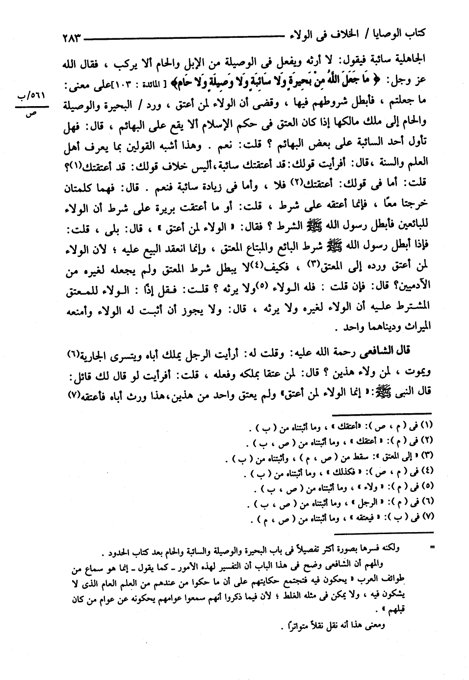 الْجَاهِلِيَّةِ سَائِبَةً فَيَقُولُ لاَ أَرِثُهُ , وَيَفْعَلُ فِي الْوَصِيلَةِ مِنْ الْإِبِلِ وَالَحَّامِ أَنْ لاَ يُرْكَبَ , فَقَالَ اللَّهُ عَزَّ وَجَلَّ : ? مَا جَعَلَ اللَّهُ مِنْ بَحِيرَةٍ , وَلاَ سَائِبَةٍ , وَلاَ وَصِيلَةٍ , وَلاَ حَامٍ } عَلَى مَعْنَى مَا جَعَلْتُمْ فَأَبْطَلَ شُرُوطَهُمْ فِيهَا وَقَضَى أَنَّ الْوَلاَءَ لِمَنْ أَعْتَقَ وَرَدَّ الْبَحِيرَةَ وَالْوَصِيلَةَ وَالَحَّامَ إلَى مِلْكِ مَالِكِهَا إذَا كَانَ الْعِتْقُ فِي حُكْمِ الْإِسْلاَمِ أَنْ لاَ يَقَعَ عَلَى الْبَهَائِمِ , قَالَ : فَهَلْ تَأَوَّلَ أَحَدٌ السَّائِبَةَ عَلَى بَعْضِ الْبَهَائِمِ ؟ قُلْت : نَعَمْ . وَهَذَا أَشْبَهُ الْقَوْلَيْنِ بِمَا يَعْرِفُ أَهْلُ الْعِلْمِ وَالسُّنَّةِ , قَالَ : أَفَرَأَيْت قَوْلَك قَدْ أَعْتَقْتُك سَائِبَةً أَلَيْسَ خِلاَفَ قَوْلِك قَدْ أَعْتَقْتُك ؟ قُلْت أَمَّا فِي قَوْلِك أَعْتَقْتُك فَلاَ , وَأَمَّا فِي زِيَادَةِ سَائِبَةً فَنَعَمْ . قَالَ : فَهُمَا كَلِمَتَانِ خَرَجَتَا مَعًا فَإِنَّمَا أَعْتَقَهُ عَلَى شَرْطٍ , قُلْت : أَوْ مَا أُعْتِقَتْ بَرِيرَةُ عَلَى شَرْطِ أَنَّ الْوَلاَءَ لِلْبَائِعِينَ فَأَبْطَلَ رَسُولُ اللَّهِ - صلى الله عليه وسلم - الشَّرْطَ ؟ فَقَالَ : { الْوَلاَءُ لِمَنْ أَعْتَقَ } قَالَ : بَلَى : قُلْت , فَإِذَا أَبْطَلَ رَسُولُ اللَّهِ - صلى الله عليه وسلم - شَرْطَ الْبَائِعِ وَالْمُبْتَاعِ الْمُعْتِقِ , وَإِنَّمَا انْعَقَدَ الْبَيْعُ عَلَيْهِ ; لِأَنَّ الْوَلاَءَ لِمَنْ أَعْتَقَ وَرَدَّهُ إلَى الْمُعْتِقِ فَكَيْفَ لاَ يَبْطُلُ شَرْطُ الْمُعْتِقِ , وَلَمْ يَجْعَلْهُ لِغَيْرِهِ مِنْ الْآدَمِيِّينَ ؟ قَالَ : فَإِنْ قُلْت فَلَهُ الْوَلاَءُ , وَلاَ يَرِثُهُ ؟ قُلْت فَقُلْ إذًا الْوَلاَءُ لِلْمُعْتِقِ الْمُشْتَرَطِ عَلَيْهِ أَنَّ الْوَلاَءَ لِغَيْرِهِ , وَلاَ يَرِثُهُ , قَالَ : لاَ يَجُوزُ أَنْ أُثْبِتَ لَهُ الْوَلاَءَ وَأَمْنَعَهُ الْمِيرَاثَ وَدِينَاهُمَا وَاحِدٌ .