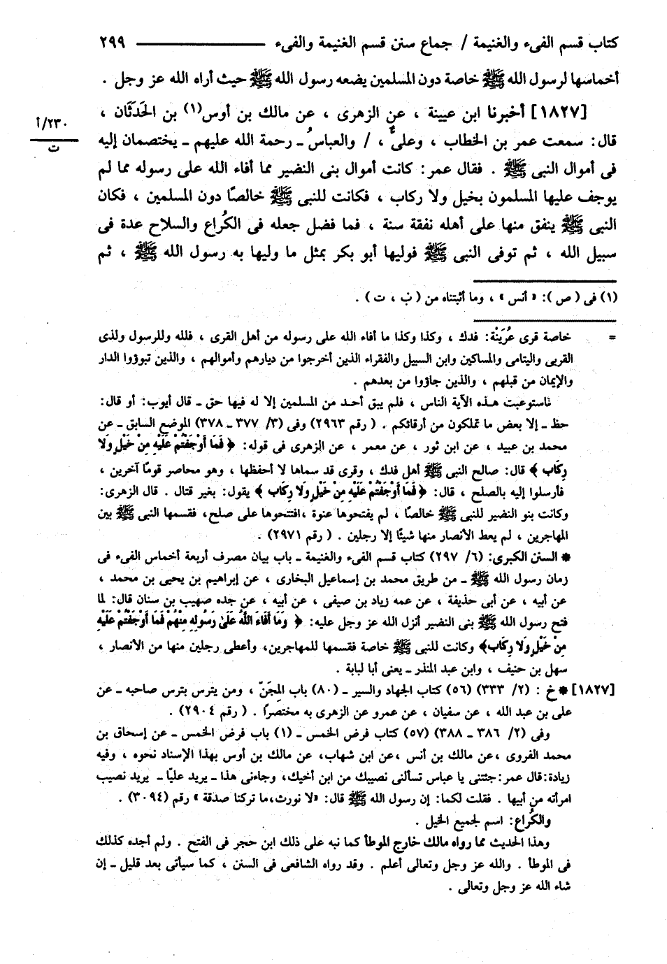 أَخْمَاسِهَا لِرَسُولِ اللَّهِ - صلى الله عليه وسلم - خَاصَّةً دُونَ الْمُسْلِمِينَ يَضَعُهُ رَسُولُ اللَّهِ - صلى الله عليه وسلم - حَيْثُ أَرَاهُ اللَّهُ عَزَّ وَجَلَّ . أَخْبَرَنَا ابْنُ عُيَيْنَةَ عَنْ الزُّهْرِيِّ عَنْ مَالِكِ بْنِ أَوْسِ بْنِ الْحَدَثَانِ , قَالَ سَمِعْت عُمَرَ بْنَ الْخَطَّابِ وَعَلِيٌّ وَالْعَبَّاسُ رَحْمَةُ اللَّهِ عَلَيْهِمْ يَخْتَصِمَانِ إلَيْهِ فِي أَمْوَالِ النَّبِيِّ - صلى الله عليه وسلم - فَقَالَ : عُمَرُ { كَانَتْ أَمْوَالُ بَنِي النَّضِيرِ مِمَّا أَفَاءَ اللَّهُ عَلَى رَسُولَهُ مِمَّا لَمْ يُوجِفْ عَلَيْهَا الْمُسْلِمُونَ بِخَيْلٍ , وَلاَ رِكَابٍ فَكَانَتْ لِلنَّبِيِّ - صلى الله عليه وسلم - خَالِصًا دُونَ الْمُسْلِمِينَ فَكَانَ النَّبِيُّ - صلى الله عليه وسلم - يُنْفِقُ مِنْهَا عَلَى أَهْلِهِ نَفَقَةَ سَنَةٍ فَمَا فَضَلَ جَعَلَهُ فِي الْكُرَاعِ وَالسِّلاَحِ عِدَّةً فِي سَبِيلِ اللَّهِ عَزَّ وَجَلَّ } , ثُمَّ تُوُفِّيَ النَّبِيُّ - صلى الله عليه وسلم - فَوَلِيَهَا أَبُو بَكْرٍ بِمِثْلِ مَا وَلِيَهَا بِهِ رَسُولُ اللَّهِ - صلى الله عليه وسلم - ثُمَّ@