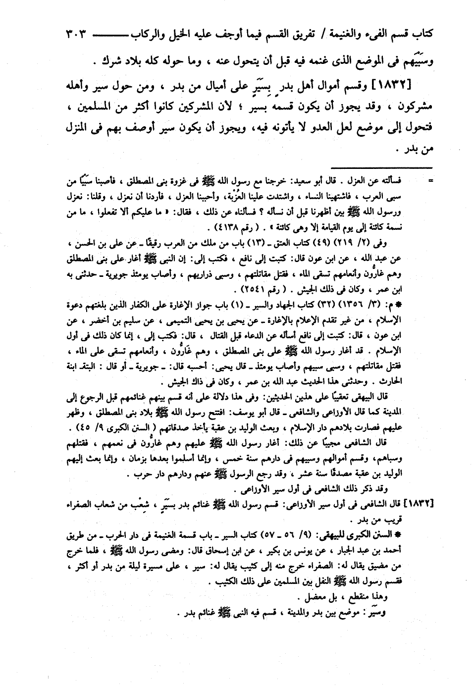 وَسَبْيَهُمْ فِي الْمَوْضِعِ الَّذِي غَنِمَهُ فِيهِ قَبْلَ أَنْ يَتَحَوَّلَ عَنْهُ وَمَا حَوْلَهُ كُلُّهُ بِلاَدُ شِرْكٍ وَقَسَمَ أَمْوَالَ أَهْلِ بَدْرٍ بِسَيْر عَلَى أَمْيَالٍ مِنْ بَدْرٍ وَمَنْ حَوْلَ سِيَرَ وَأَهْلُهُ مُشْرِكُونَ , وَقَدْ يَجُوزُ أَنْ يَكُونَ قَسَمَهُ بِسَيْر ; لِأَنَّ الْمُشْرِكِينَ كَانُوا أَكْثَرَ مِنْ الْمُسْلِمِينَ فَتَحَوَّلَ إلَى مَوْضِعٍ لَعَلَّ الْعَدُوَّ لاَ يَأْتُونَهُ فِيهِ وَيَجُوزُ أَنْ يَكُونَ سِيَرُ أَوَصَفَ بِهِمْ فِي الْمَنْزِلِ مِنْ بَدْر .@