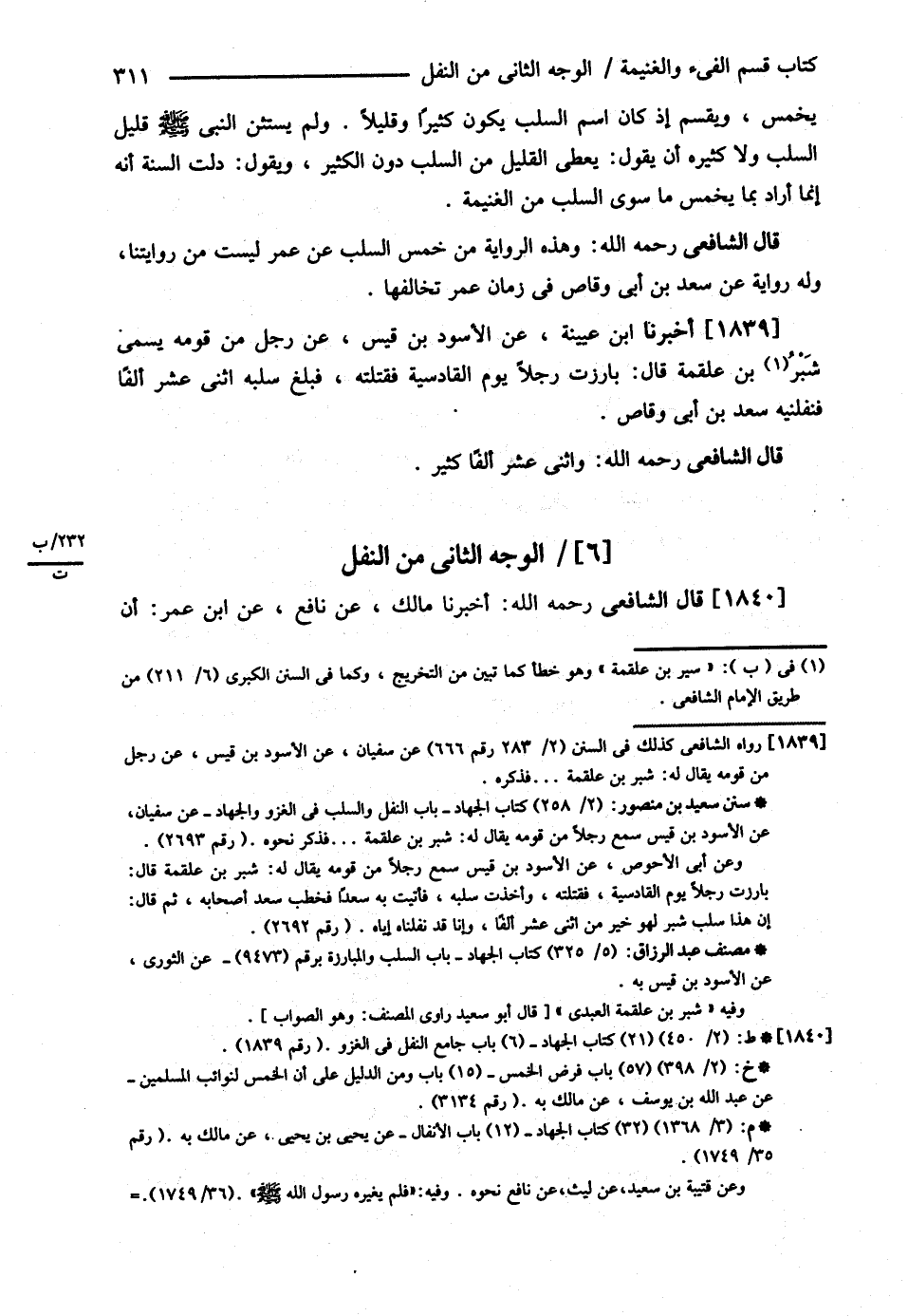 قَالَ الشَّافِعِيُّ : وَهَذِهِ الرِّوَايَةُ مِنْ خُمْسِ السَّلَبِ عَنْ عُمَرَ لَيْسَتْ مِنْ رِوَايَتِنَا وَلَهُ رِوَايَةٌ عَنْ سَعْدِ بْنِ أَبِي وَقَّاصٍ فِي زَمَانِ عُمَرَ تُخَالِفُهَا . أَخْبَرَنَا ابْنُ عُيَيْنَةَ عَنْ الْأَسْوَدِ بْنِ قَيْسٍ عَنْ رَجُلٍ مِنْ قَوْمِهِ يُسَمَّى سِيَرَ بْنَ عَلْقَمَةَ قَالَ : بَارَزْت رَجُلاً يَوْمَ الْقَادِسِيَّةِ فَقَتَلْته فَبَلَغَ سَلَبُهُ اثْنَيْ عَشْرَ أَلْفًا فَنَفَّلَنِيهِ سَعْدُ بْنُ أَبِي وَقَّاصٍ .