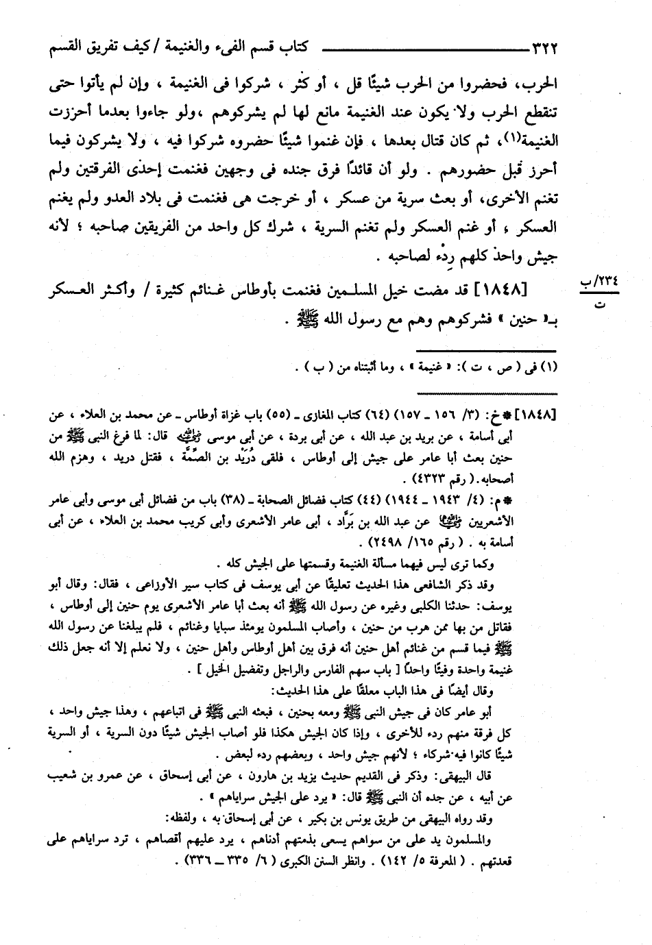 الْحَرْبُ فَحَضَرُوا مِنْ الْحَرْبِ شَيْئًا قَلَّ , أَوْ كَثُرَ شُرِكُوا فِي الْغَنِيمَةِ , وَإِنْ لَمْ يَأْتُوا حَتَّى تَنْقَطِعَ الْحَرْبُ , وَلاَ يَكُونُ عِنْدَ الْغَنِيمَةِ مَانِعٌ لَهَا لَمْ يُشْرِكُوهُمْ , وَلَوْ جَاءُوا بَعْدَمَا أُحْرِزَتْ الْغَنِيمَةُ , ثُمَّ كَانَ قِتَالٌ بَعْدَهَا فَإِنْ غَنِمُوا شَيْئًا حَضَرُوهُ شُرِكُوا فِيهِ , وَلاَ يُشْرِكُونَ فِيمَا أُحْرِزَ قَبْلَ حُضُورِهِمْ , وَلَوْ أَنَّ قَائِدًا فَرَّقَ جُنْدَهُ فِي وَجْهَيْنِ فَغَنِمَتْ إحْدَى الْفِرْقَتَيْنِ , وَلَمْ تَغْنَمْ الْأُخْرَى , أَوْ بَعَثَ سَرِيَّةً مِنْ عَسْكَرٍ , أَوْ خَرَجَتْ هِيَ فَغَنِمَتْ فِي بِلاَدِ الْعَدُوِّ , وَلَمْ يَغْنَمْ الْعَسْكَرُ , أَوْ غَنِمَ الْعَسْكَرُ , وَلَمْ تَغْنَمْ السَّرِيَّةُ شَرَكَ كُلُّ وَاحِدٍ مِنْ الْفَرِيقَيْنِ صَاحِبَهُ ; لِأَنَّهُ جَيْشٌ وَاحِدٌ كُلُّهُمْ رَدٌّ , لِصَاحِبِهِ قَدْ مَضَتْ خَيْلُ الْمُسْلِمِينَ فَغَنِمَتْ بِأَوْطَاسٍ غَنَائِمَ كَثِيرَةً وَأَكْثَرَ الْعَسْكَرُ : حُنَيْنٍ فَشَرِكُوهُمْ وَهُمْ مَعَ رَسُولِ اللَّهِ - صلى الله عليه وسلم -@