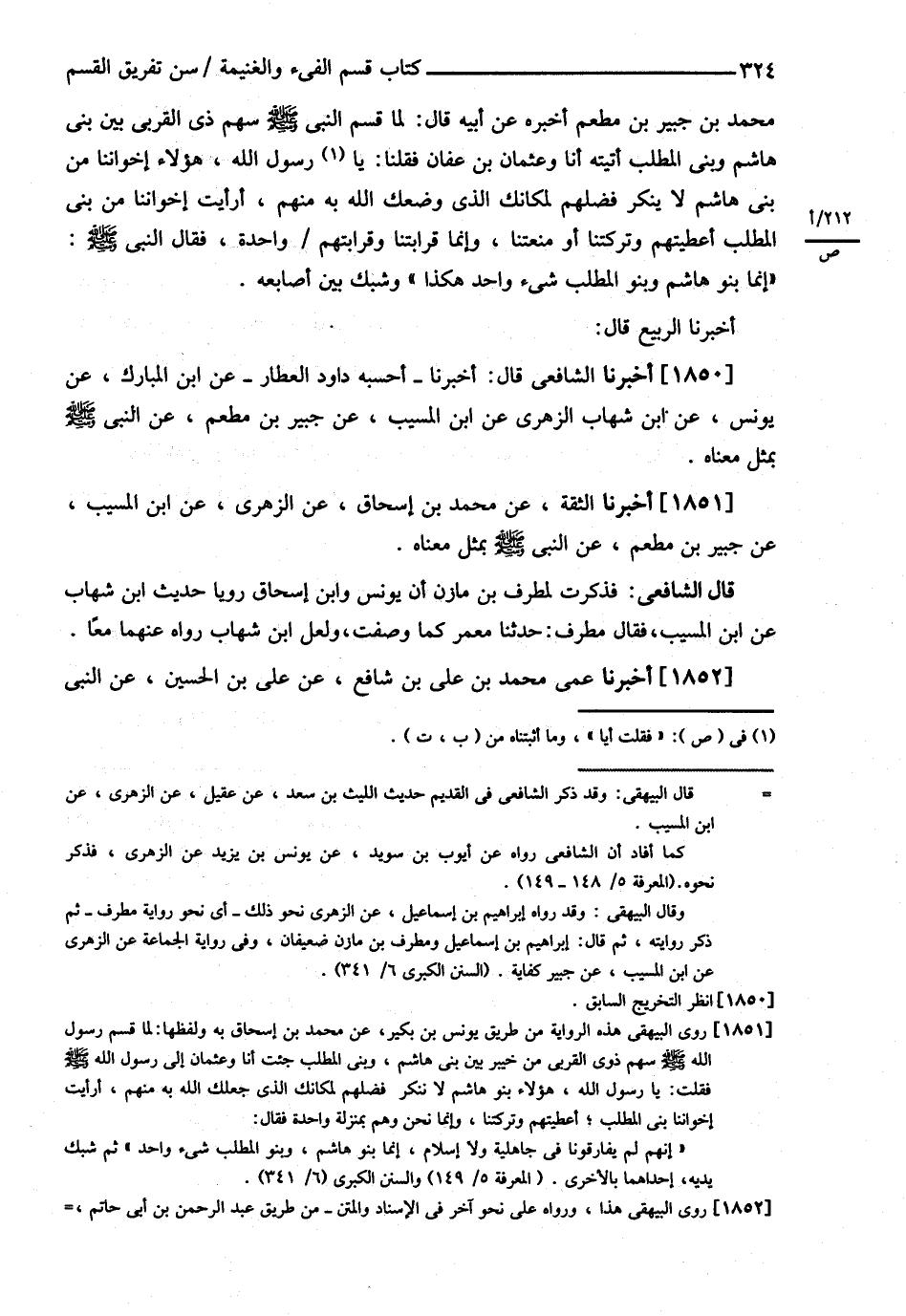 مُحَمَّدَ بْنَ جُبَيْرِ بْنِ مُطْعِمٍ أَخْبَرَهُ عَنْ أَبِيهِ قَالَ : { لَمَّا قَسَمَ النَّبِيُّ - صلى الله عليه وسلم - سَهْمَ ذِي الْقُرْبَى بَيْنَ بَنِي هَاشِمٍ وَبَنِي الْمُطَّلِبِ أَتَيْته أَنَا وَعُثْمَانُ بْنُ عَفَّانَ فَقُلْنَا يَا رَسُولَ اللَّهِ هَؤُلاَءِ إخْوَانُنَا مِنْ بَنِي هَاشِمٍ لاَ يُنْكَرُ فَضْلُهُمْ لِمَكَانِك الَّذِي وَضَعَك اللَّهُ بِهِ مِنْهُمْ . أَرَأَيْت إخْوَانَنَا مِنْ بَنِي الْمُطَّلِبِ أَعْطَيْتهمْ وَتَرَكْتنَا , أَوْ مَنَعْتنَا , وَإِنَّمَا قَرَابَتُنَا وَقَرَابَتُهُمْ وَاحِدَةٌ . فَقَالَ : النَّبِيُّ - صلى الله عليه وسلم - إنَّمَا بَنُو هَاشِمٍ وَبَنُو الْمُطَّلِبِ شَيْءٌ وَاحِدٌ هَكَذَا وَشَبَّكَ بَيْنَ أَصَابِعِهِ } أَخْبَرَنَا الرَّبِيعُ قَالَ أَخْبَرَنَا الشَّافِعِيُّ قَالَ أَخْبَرَنَا أَحْسَبُهُ دَاوُد الْعَطَّارَ عَنْ ابْنِ الْمُبَارَكِ عَنْ يُونُسَ عَنْ ابْنِ شِهَابٍ الزُّهْرِيِّ عَنْ ابْنِ الْمُسَيِّبِ عَنْ جُبَيْرِ بْنِ مُطْعِمٍ عَنْ النَّبِيِّ - صلى الله عليه وسلم - بِمِثْلِ مَعْنَاهُ أَخْبَرَنَا الثِّقَةُ عَنْ مُحَمَّدِ بْنِ إِسْحَاقَ عَنْ الزُّهْرِيِّ عَنْ ابْنِ الْمُسَيِّبِ عَنْ جُبَيْرِ بْنِ مُطْعِمٍ عَنْ النَّبِيِّ - صلى الله عليه وسلم - بِمِثْلِ مَعْنَاهُ .