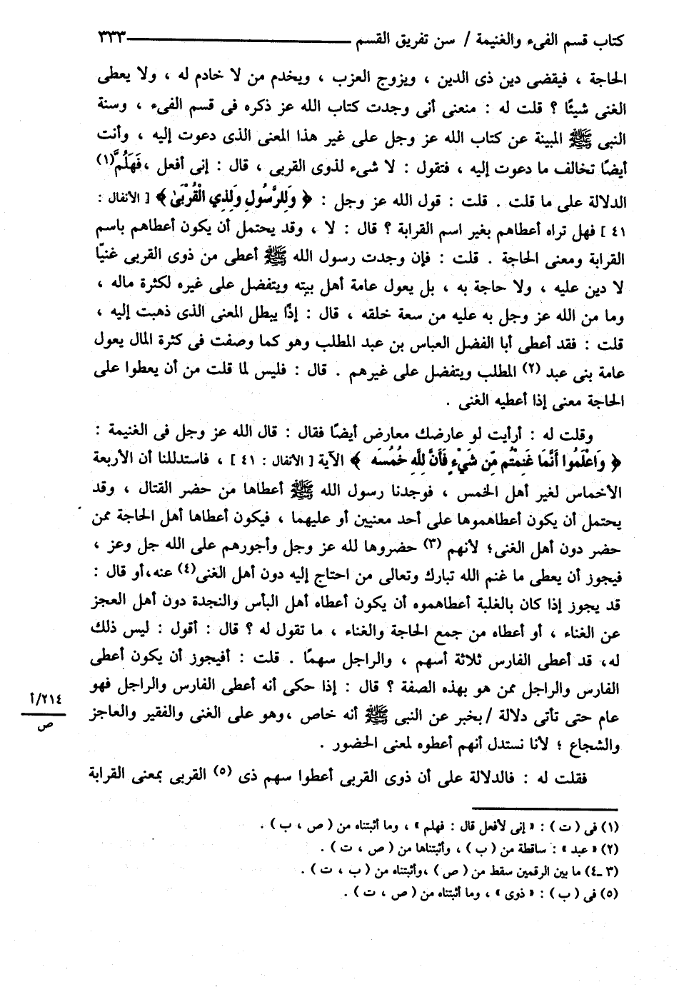 الْحَاجَةِ فَيُقْضَى دَيْنُ ذِي الدَّيْنِ وَيُزَوَّجُ الْعَزَبُ وَيُخْدَمُ مَنْ لاَ خَادِمَ لَهُ , وَلاَ يُعْطَى الْغَنِيُّ شَيْئًا: قُلْت لَهُ مَنَعَنِي أَنِّي وَجَدَتْ كِتَابَ اللَّهِ عَزَّ وَجَلَّ ذَكَرَهُ فِي قَسْمِ الْفَيْءِ وَسُنَّةُ النَّبِيِّ - صلى الله عليه وسلم - الْمُبَيِّنَةُ عَنْ كِتَابِ اللَّهِ عَزَّ وَجَلَّ عَلَى غَيْرِ هَذَا الْمَعْنَى الَّذِي دَعَوْت إلَيْهِ , وَأَنْتَ أَيْضًا تُخَالِفُ مَا دَعَوْت إلَيْهِ. فَتَقُولُ لاَ شَيْءَ لِذَوِي الْقُرْبَى , قَالَ: إنِّي أَفْعَلُ فَهَلُمَّ الدَّلاَلَةَ عَلَى مَا قُلْت قُلْت قَوْلُ اللَّهِ عَزَّ وَجَلَّ: ? وَلِلرَّسُولِ وَلِذِي الْقُرْبَى} فَهَلْ تَرَاهُ أَعْطَاهُمْ بِغَيْرِ اسْمِ الْقَرَابَةِ؟ قَالَ: لاَ , وَقَدْ يَحْتَمِلُ أَنْ يَكُونَ أَعْطَاهُمْ بِاسْمِ الْقَرَابَةِ وَمَعْنَى الْحَاجَةِ: قُلْت فَإِنْ وَجَدْت رَسُولَ اللَّهِ - صلى الله عليه وسلم - أَعْطَى مِنْ ذَوِي الْقُرْبَى غَنِيًّا لاَ دَيْنَ عَلَيْهِ , وَلاَ حَاجَةَ بِهِ بَلْ يَعُولُ عَامَّةَ أَهْلِ بَيْتِهِ وَيَتَفَضَّلُ عَلَى غَيْرِهِ لِكَثْرَةِ مَالِهِ , وَمَا مَنَّ اللَّهُ عَزَّ وَجَلَّ بِهِ عَلَيْهِ مِنْ سَعَةِ خَلْقِهِ , قَالَ: إذًا يُبْطِلُ الْمَعْنَى الَّذِي ذَهَبْت إلَيْهِ , قُلْت , فَقَدْ أَعْطَى أَبَا الْفَضْلِ الْعَبَّاسَ بْنَ عَبْدِ الْمُطَّلِبِ , وَهُوَ كَمَا وَصَفْت فِي كَثْرَةِ الْمَالِ يَعُولُ عَامَّةَ بَنِي الْمُطَّلِبِ وَيَتَفَضَّلُ عَلَى غَيْرِهِمْ , قَالَ: فَلَيْسَ لِمَا قُلْت مِنْ أَنْ يُعْطَوْا عَلَى الْحَاجَةِ مَعْنًى إذَا أُعْطِيَهُ الْغَنِيُّ , وَقُلْت لَهُ أَرَأَيْت لَوْ عَارَضَك مُعَارِضٌ أَيْضًا فَقَالَ: قَالَ: اللَّهُ عَزَّ وَجَلَّ فِي الْغَنِيمَةِ {وَاعْلَمُوا أَنَّمَا غَنِمْتُمْ مِنْ شَيْءٍ فَأَنَّ لِلَّهِ خُمُسَهُ ? الآيَةَ. , فَاسْتَدْلَلْنَا أَنَّ الْأَرْبَعَةَ الْأَخْمَاسَ لِغَيْرِ أَهْلِ الْخُمُسِ فَوَجَدْنَا رَسُولَ اللَّهِ - صلى الله عليه وسلم - أَعْطَاهَا مَنْ حَضَرَ الْقِتَالَ , وَقَدْ يَحْتَمِلُ أَنْ يَكُونَ أَعْطَاهُمُوهَا عَلَى أَحَدِ مَعْنَيَيْنِ , أَوْ عَلَيْهِمَا , فَيَكُونَ أَعْطَاهَا أَهْلَ الْحَاجَةِ مِمَّنْ حَضَرَ دُونَ أَهْلِ الْغِنَى عَنْهُ , أَوْ قَالَ: قَدْ يَجُوزُ إذَا كَانَ بِالْغَلَبَةِ أَعْطَاهُمُوهُ أَنْ يَكُونَ أَعْطَاهُ أَهْلَ الْبَأْسِ وَالنَّجْدَةِ دُونَ أَهْلِ الْعَجْزِ عَنْ الْغَنَاءِ , أَوْ أَعْطَاهُ مَنْ جَمَعَ الْحَاجَةَ وَالْغَنَاءَ مَا تَقُولُ لَهُ؟ قَالَ: أَقُولُ: لَيْسَ ذَلِكَ لَهُ قَدْ أَعْطَى الْفَارِسَ ثَلاَثَةَ أَسْهُمٍ وَالرَّاجِلَ سَهْمًا قُلْت: أَفَيَجُوزُ أَنْ يَكُونَ أَعْطَى الْفَارِسَ وَالرَّاجِلَ مِمَّنْ هُوَ بِهَذِهِ الصِّفَةِ؟ قَالَ: إذَا حُكِيَ أَنَّهُ أَعْطَى الْفَارِسَ وَالرَّاجِلَ فَهُوَ عَامٌّ حَتَّى تَأْتِيَ دَلاَلَةٌ بِخَبَرٍ عَنْ النَّبِيِّ - صلى الله عليه وسلم - أَنَّهُ خَاصٌّ , وَهُوَ عَلَى الْغَنِيِّ وَالْفَقِيرِ وَالْعَاجِزِ وَالشُّجَاعِ لِأَنَّا نَسْتَدِلُّ أَنَّهُمْ أُعْطُوهُ لِمَعْنَى الْحُضُورِ , فَقُلْت لَهُ: فَالدَّلاَلَةُ عَلَى أَنَّ ذَوِي الْقُرْبَى أُعْطُوا سَهْمَ ذَوِي الْقُرْبَى بِمَعْنَى الْقَرَابَةِ @