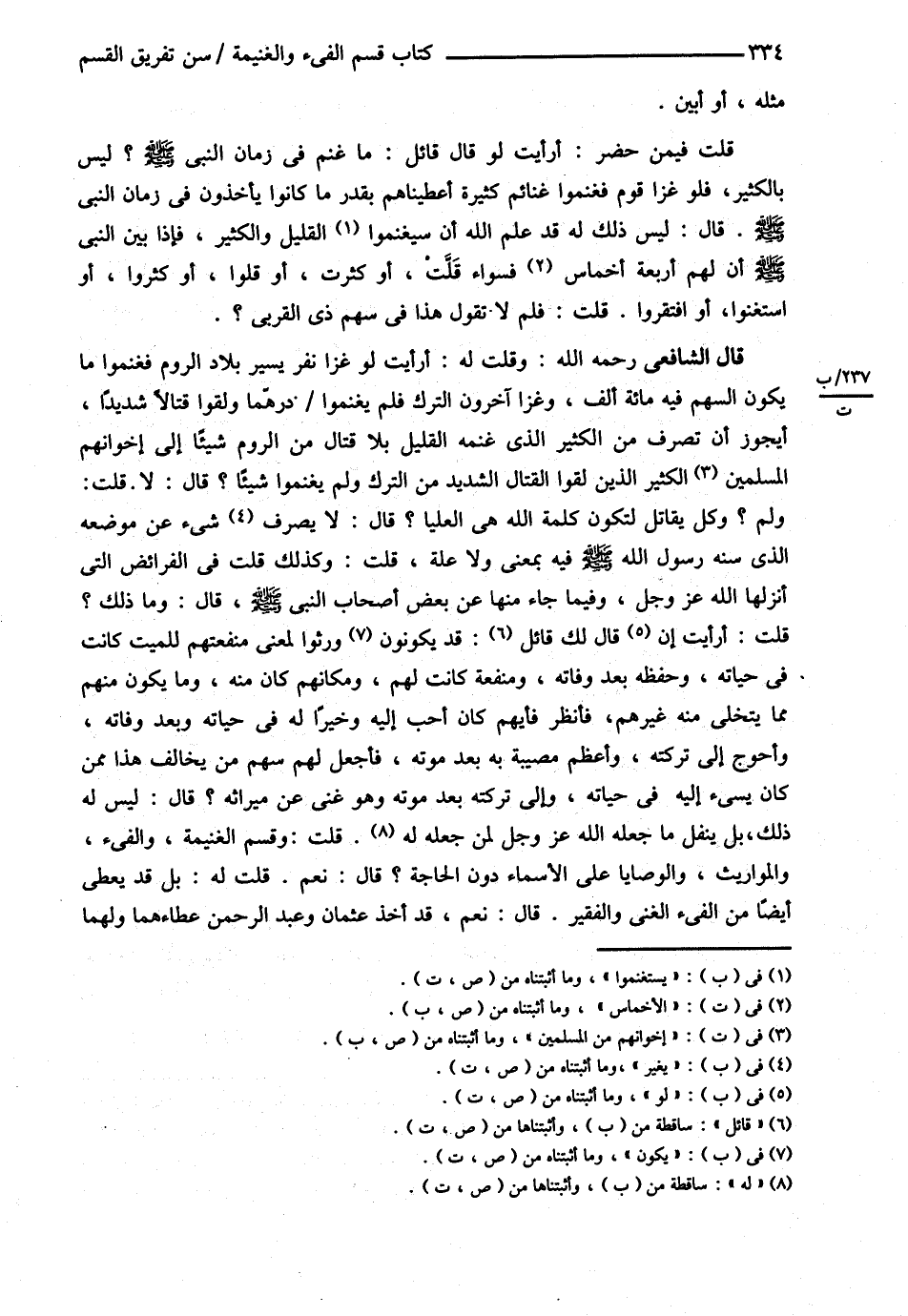 مِثْلُهُ , أَوْ أَبْيَنُ قُلْت فِيمَنْ حَضَرَ أَرَأَيْت لَوْ قَالَ : قَائِلٌ مَا غُنِمَ فِي زَمَانِ النَّبِيِّ - صلى الله عليه وسلم - ؟ لَيْسَ بِالْكَثِيرِ , فَلَوْ غَزَا قَوْمٌ فَغَنِمُوا غَنَائِمَ كَثِيرَةً أَعْطَيْنَاهُمْ بِقَدْرِ مَا كَانُوا يَأْخُذُونَ فِي زَمَانِ النَّبِيِّ - صلى الله عليه وسلم - قَالَ لَيْسَ ذَلِكَ لَهُ , قَدْ عَلِمَ اللَّهُ أَنْ يستغنموا الْقَلِيلَ وَالْكَثِيرَ , فَإِذَا بَيَّنَ النَّبِيُّ - صلى الله عليه وسلم - أَنَّ لَهُمْ أَرْبَعَةَ أَخْمَاسٍ فَسَوَاءٌ قَلَّتْ , أَوْ كَثُرَتْ أَوْ قَلُّوا , أَوْ كَثُرُوا , أَوْ اسْتَغْنَوْا أَوْ افْتَقَرُوا : قُلْت فَلِمَ لاَ تَقُولُ هَذَا فِي سَهْمِ ذِي الْقُرْبَى ؟ .