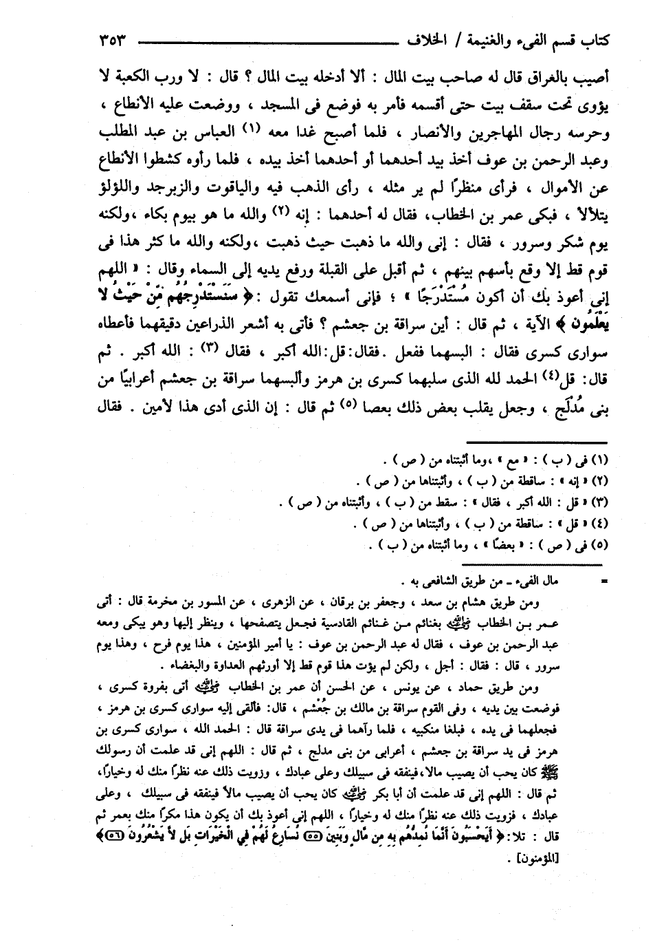 أُصِيبَ بِالْعِرَاقِ قَالَ لَهُ صَاحِبُ بَيْتِ الْمَالِ , أَلاَ أُدْخِلُهُ بَيْتَ الْمَالِ ؟ قَالَ لاَ وَرَبِّ الْكَعْبَةِ لاَ يُؤَدَّى تَحْتَ سَقْفِ بَيْتٍ حَتَّى أَقْسِمَهُ فَأَمَرَ بِهِ فَوُضِعَ فِي الْمَسْجِدِ وَوُضِعَتْ عَلَيْهِ الْأَنْطَاعُ وَحَرَسَهُ رِجَالُ الْمُهَاجِرِينَ وَالْأَنْصَارِ فَلَمَّا أَصْبَحَ غَدَا مَعَ الْعَبَّاسِ بْنِ عَبْدِ الْمُطَّلِبِ وَعَبْدِ الرَّحْمَنِ بْنِ عَوْفٍ أَخَذَ بِيَدِ أَحَدِهِمَا , أَوْ أَحَدُهُمَا أَخَذَ بِيَدِهِ فَلَمَّا رَأَوْهُ كَشَطُوا الْأَنْطَاعَ عَنْ الْأَمْوَالِ فَرَأَى مَنْظَرًا لَمْ يَرَ مِثْلَهُ رَأَى الذَّهَبَ فِيهِ وَالْيَاقُوتَ وَالزَّبَرْجَدَ وَاللُّؤْلُؤَ يَتَلاَْلاَُ فَبَكَى عُمَرُ بْنُ الْخَطَّابِ فَقَالَ لَهُ أَحَدُهُمَا وَاَللَّهِ مَا هُوَ بِيَوْمِ بُكَاءٍ , وَلَكِنَّهُ يَوْمُ شُكْرٍ وَسُرُورٍ فَقَالَ إنِّي وَاَللَّهِ مَا ذَهَبْت حَيْثُ ذَهَبْت , وَلَكِنَّهُ وَاَللَّهِ مَا كَثُرَ هَذَا فِي قَوْمٍ قَطُّ إلَّا وَقَعَ بَأْسُهُمْ بَيْنَهُمْ ثُمَّ أَقْبَلَ عَلَى الْقِبْلَةِ وَرَفَعَ يَدَيْهِ إلَى السَّمَاءِ , وَقَالَ : اللَّهُمَّ إنِّي أَعُوذُ بِك أَنْ أَكُونَ مُسْتَدْرَجًا فَإِنِّي أَسْمَعُك تَقُولُ { سَنَسْتَدْرِجُهُمْ مِنْ حَيْثُ لاَ يَعْلَمُونَ ? الآيَةَ. , ثُمَّ قَالَ : أَيْنَ سُرَاقَةُ بْنُ جَعْشَمٍ ؟ فَأُتِيَ بِهِ أَشْعَرَ الذِّرَاعَيْنِ دَقِيقَهُمَا فَأَعْطَاهُ سِوَارَيْ كِسْرَى فَقَالَ : الْبَسْهُمَا فَفَعَلَ فَقَالَ اللَّهُ أَكْبَرُ ثُمَّ قَالَ الْحَمْدُ لِلَّهِ الَّذِي سَلَبَهُمَا كِسْرَى بْنَ هُرْمُزَ وَأَلْبَسَهُمَا سُرَاقَةَ بْنَ جَعْشَمٍ أَعْرَابِيًّا مِنْ بَنِي مُدْلِجٍ وَجَعَلَ يُقَلِّبُ بَعْضَ ذَلِكَ بَعْضًا , ثُمَّ قَالَ : إنَّ الَّذِي أَدَّى هَذَا لاََمِينٌ فَقَالَ@