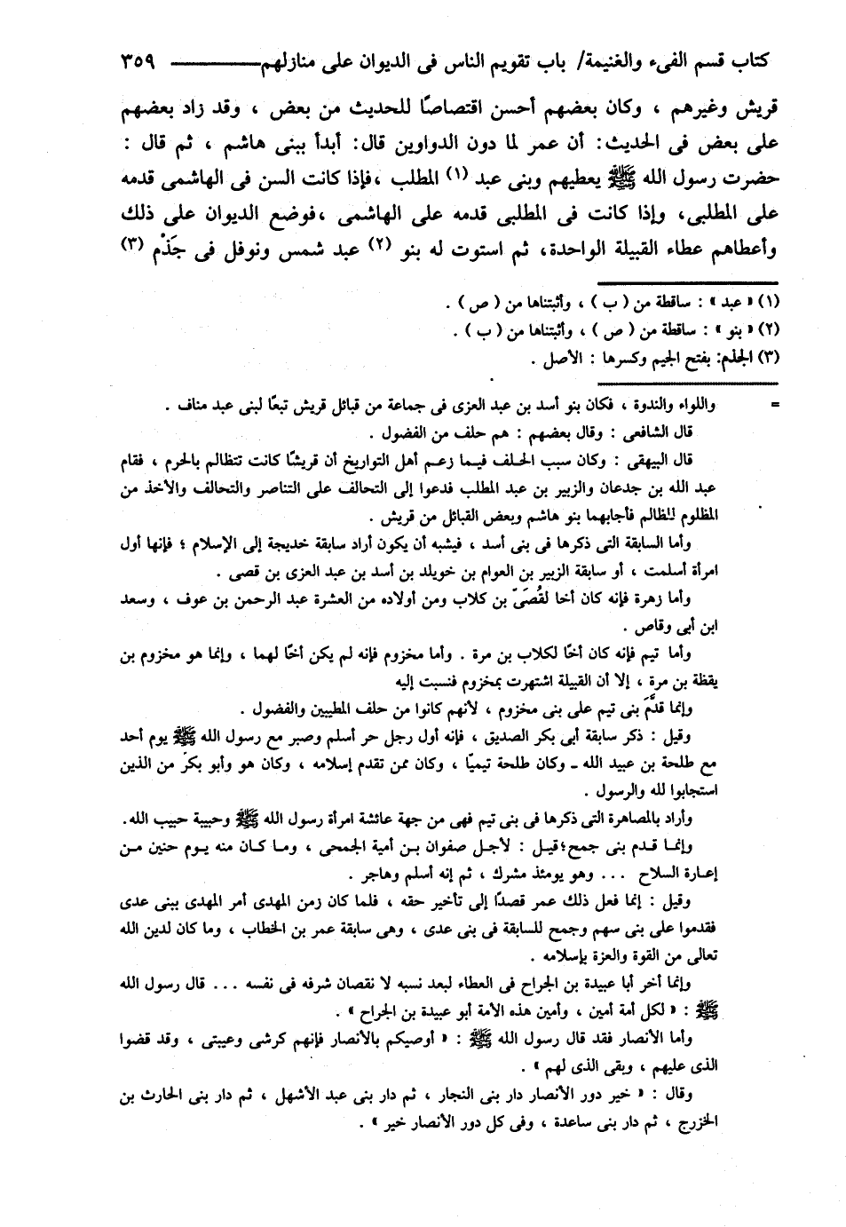 قُرَيْشٍ وَغَيْرِهِمْ وَكَانَ بَعْضُهُمْ أَحْسَنَ اقْتِصَاصًا لِلْحَدِيثِ مِنْ بَعْضٍ , وَقَدْ زَادَ بَعْضُهُمْ عَلَى بَعْضٍ فِي الْحَدِيثِ أَنَّ عُمَرَ لَمَّا دَوَّنَ الدِّيوَانَ قَالَ أَبْدَأُ بِبَنِي هَاشِمٍ ثُمَّ قَالَ حَضَرْت رَسُولَ اللَّهِ - صلى الله عليه وسلم - يُعْطِيهِمْ وَبَنِي الْمُطَّلِبِ . فَإِذَا كَانَتْ السِّنُّ فِي الْهَاشِمِيِّ قَدَّمَهُ عَلَى الْمُطَّلِبِيِّ , وَإِذَا كَانَتْ فِي الْمُطَّلِبِيِّ قَدَّمَهُ عَلَى الْهَاشِمِيِّ فَوَضَعَ الدِّيوَانَ عَلَى ذَلِكَ وَأَعْطَاهُمْ عَطَاءَ الْقَبِيلَةِ الْوَاحِدَةِ ثُمَّ اسْتَوَتْ لَهُ بَنُو عَبْدِ شَمْسٍ وَنَوْفَلٍ فِي جَذْمِ@