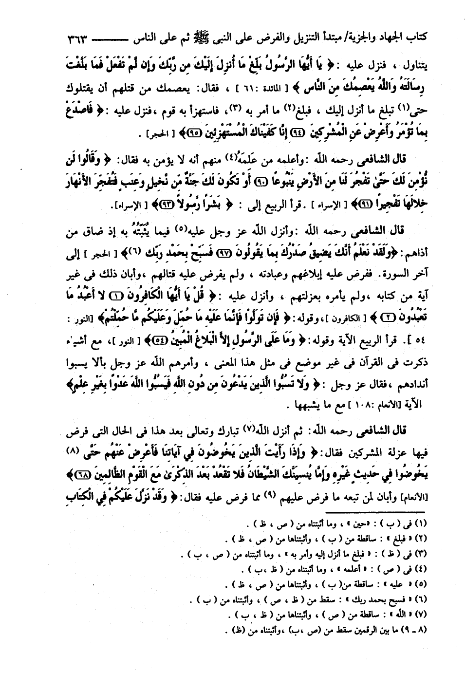 قَالَ الشَّافِعِيُّ : وَأَنْزَلَ اللَّهُ عَزَّ وَجَلَّ فِيمَا يُثَبِّتُهُ بِهِ إذَا ضَاقَ مِنْ أَذَاهُمْ { وَلَقَدْ نَعْلَمُ أَنَّك يَضِيقُ صَدْرُك بِمَا يَقُولُونَ فَسَبِّحْ بِحَمْدِ رَبِّك } إلَى آخِرِ السُّورَةِ . فَفَرَضَ عَلَيْهِ إبْلاَغَهُمْ وَعِبَادَتَهُ , وَلَمْ يَفْرِضْ عَلَيْهِ قِتَالَهُمْ وَأَبَانَ ذَلِكَ فِي غَيْرِ آيَةٍ مِنْ كِتَابِهِ , وَلَمْ يَأْمُرْهُ بِعُزْلَتِهِمْ وَأَنْزَلَ عَلَيْهِ { قُلْ يَا أَيُّهَا الْكَافِرُونَ لاَ أَعْبُدُ مَا تَعْبُدُونَ } وَقَوْلُهُ { فَإِنْ تَوَلَّوْا فَإِنَّمَا عَلَيْهِ مَا حُمِّلَ وَعَلَيْكُمْ مَا حُمِّلْتُمْ } قَرَأَ الرَّبِيعُ الْآيَةَ : وَقَوْلُهُ { مَا عَلَى الرَّسُولِ إلَّا الْبَلاَغُ } مَعَ أَشْيَاءَ ذُكِرَتْ فِي الْقُرْآنِ فِي غَيْرِ مَوْضِعٍ فِي مِثْلِ هَذَا الْمَعْنَى وَأَمَرَهُمْ اللَّهُ عَزَّ وَجَلَّ بِأَنْ لاَ يَسُبُّوا أَنْدَادَهُمْ فَقَالَ عَزَّ وَجَلَّ : ? وَلاَ تَسُبُّوا الَّذِينَ يَدْعُونَ مِنْ دُونِ اللَّهِ فَيَسُبُّوا اللَّهَ عَدْوًا بِغَيْرِ عِلْمٍ } الْآيَةُ مَعَ مَا يُشْبِهُهَا .