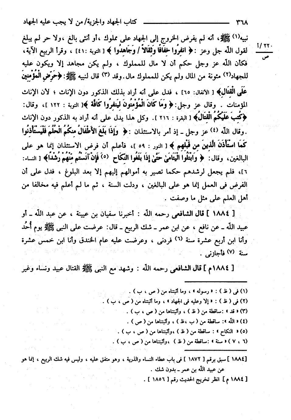 قَالَ الشَّافِعِيُّ : رحمه الله تعالى أَخْبَرَنَا سُفْيَانُ بْنُ عُيَيْنَةَ عَنْ عَبْدِ اللَّهِ , أَوْ عُبَيْدِ اللَّهِ عَنْ نَافِعٍ عَنْ { ابْنِ عُمَرَ شَكَّ الرَّبِيعُ قَالَ عُرِضْتُ عَلَى النَّبِيِّ - صلى الله عليه وسلم - يَوْمَ أُحُدٍ وَأَنَا ابْنُ أَرْبَعَ عَشْرَةَ سَنَةً فَرَدَّنِي وَعُرِضْتُ عَلَيْهِ عَامَ الْخَنْدَقِ وَأَنَا ابْنُ خَمْسَ عَشْرَةَ سَنَةً فَأَجَازَنِي } .