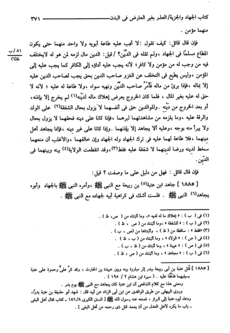 مِنْهُمَا مُؤْمِنٌ , فَإِنْ قَالَ قَائِلٌ : كَيْفَ تَقُولُ لاَ تَجِبُ عَلَيْهِ طَاعَةُ أَبَوَيْهِ , وَلاَ وَاحِدٌ مِنْهُمَا حَتَّى يَكُونَ الْمُطَاعُ مُسْلِمًا فِي الْجِهَادِ , وَلَمْ تَقُلْهُ فِي الدَّيْنِ ؟ قِيلَ : الدَّيْنُ مَالٌ لَزِمَهُ لِمَنْ هُوَ لَهُ لاَ يَخْتَلِفُ فِيهِ مَنْ وَجَبَ لَهُ مِنْ مُؤْمِنٍ , وَلاَ كَافِرٍ ; لِأَنَّهُ يَجِبُ عَلَيْهِ أَدَاؤُهُ إلَى الْكَافِرِ كَمَا يَجِبُ عَلَيْهِ إلَى الْمُؤْمِنِ وَلَيْسَ يُطِيعُ فِي التَّخَلُّفِ عَنْ الْغَزْوِ صَاحِبَ الدَّيْنِ بِحَقٍّ يَجِبُ لِصَاحِبِ الدَّيْنِ عَلَيْهِ إلَّا بِمَالِهِ , فَإِذَا بَرِئَ مِنْ مَالِهِ فَأَمْرُ صَاحِبِ الدَّيْنِ وَنَهْيُهُ سَوَاءٌ , وَلاَ طَاعَةَ لَهُ عَلَيْهِ ; لِأَنَّهُ لاَ حَقَّ لَهُ عَلَيْهِ بِغَيْرِ الْمَالِ فَلَمَّا كَانَ الْخُرُوجُ بِغَرَضِ إهْلاَكِ مَالِهِ لَدَيْهِ لَمْ يَخْرُجْ إلَّا بِإِذْنِهِ , أَوْ بَعْدَ الْخُرُوجِ مِنْ دَيْنِهِ وَلِلْوَالِدَيْنِ حَقٌّ فِي أَنْفُسِهِمَا لاَ يَزُولُ بِحَالٍ لِلشَّفَقَةِ عَلَى الْوَلَدِ وَالرِّقَّةِ عَلَيْهِ وَمَا يَلْزَمُهُ مِنْ مُشَاهَدَتِهِمَا لِبِرِّهِمَا , فَإِذَا كَانَا عَلَى دِينِهِ فَحَقُّهُمَا لاَ يَزُولُ بِحَالٍ , وَلاَ يَبْرَأُ مِنْهُ بِوَجْهٍ وَعَلَيْهِ أَنْ لاَ يُجَاهِدَ إلَّا بِإِذْنِهِمَا , وَإِذَا كَانَا عَلَى غَيْرِ دِينِهِ فَإِنَّمَا يُجَاهِدُ أَهْلَ دِينِهِمَا فَلاَ طَاعَةَ لَهُمَا عَلَيْهِ فِي تَرْكِ الْجِهَادِ وَلَهُ الْجِهَادُ , وَإِنْ خَالَفَهُمَا وَالْأَغْلَبُ أَنَّ مَنْعَهُمَا سُخْطٌ لِدِينِهِ وَرِضًا لِدِينِهِمَا لاَ شَفَقَةً عَلَيْهِ فَقَطْ , وَقَدْ انْقَطَعَتْ الْوِلاَيَةُ بَيْنَهُ وَبَيْنَهُمَا فِي الدِّينِ . فَإِنْ قَالَ قَائِلٌ : فَهَلْ مِنْ دَلِيلٍ عَلَى مَا وَصَفْت ؟ قِيلَ جَاهَدَ ابْنُ عُتْبَةَ بْنِ رَبِيعَةَ مَعَ النَّبِيِّ - صلى الله عليه وسلم - وَأَمَرَهُ النَّبِيُّ - صلى الله عليه وسلم - بِالْجِهَادِ وَأَبُوهُ مُجَاهِدُ النَّبِيَّ - صلى الله عليه وسلم - فَلَسْت أَشُكُّ فِي كَرَاهِيَةِ أَبِيهِ لِجِهَادِهِ مَعَ النَّبِيِّ - صلى الله عليه وسلم - @