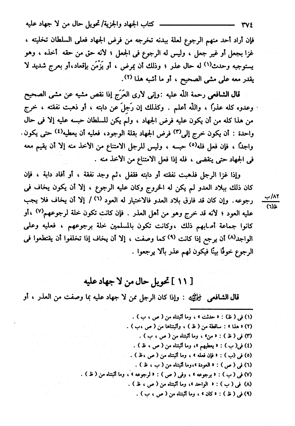 قَالَ الشَّافِعِيُّ : رحمه الله تعالى وَإِنِّي لاََرَى الْعَرَجَ إذَا نَقَصَ مَشْيُهُ عَنْ مَشْيِ الصَّحِيحِ وَعَدْوُهُ كُلُّهُ عُذْرًا وَاَللَّهُ تَعَالَى أَعْلَمُ , وَكَذَلِكَ إنْ رَجَلَ عَنْ دَابَّتِهِ , أَوْ ذَهَبَتْ نَفَقَتُهُ خَرَجَ مِنْ هَذَا كُلِّهِ مِنْ أَنْ يَكُونَ عَلَيْهِ فَرْضُ الْجِهَادِ , وَلَمْ يَكُنْ لِلسُّلْطَانِ حَبْسُهُ عَلَيْهِ إلَّا فِي حَالٍ وَاحِدَةٍ أَنْ يَكُونَ خَرَجَ إلَى فَرْضِ الْجِهَادِ بِقِلَّةِ الْوُجُودِ فَعَلَيْهِ أَنْ يُعْطِيَهُمْ حَتَّى يَكُونَ وَاجِدًا فَإِنْ فَعَلَهُ حَبَسَهُ وَلَيْسَ لِلرَّجُلِ الِامْتِنَاعُ مِنْ الْأَخْذِ مِنْهُ إلَّا أَنْ يُقِيمَ مَعَهُ فِي الْجِهَادِ حَتَّى يَنْقَضِيَ فَلَهُ إذَا فَعَلَ الِامْتِنَاعُ مِنْ الْأَخْذِ مِنْهُ .