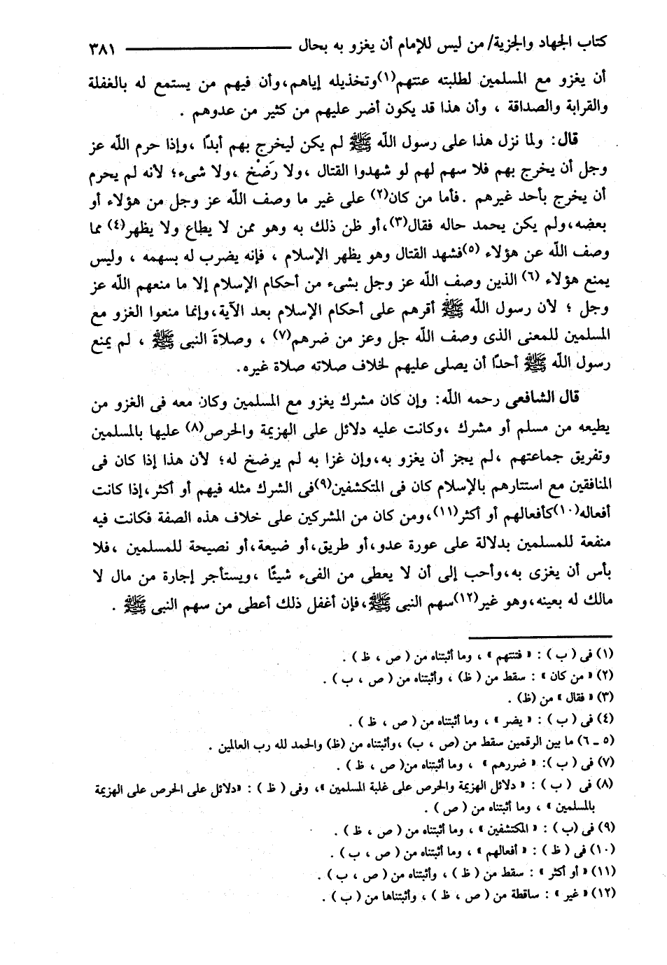 أَنْ يَغْزُوَ مَعَ الْمُسْلِمِينَ لِطَلَبَتِهِ فِتْنَتَهُمْ وَتَخْذِيلِهِ إيَّاهُمْ وَأَنَّ فِيهِمْ مَنْ يَسْتَمِعُ لَهُ بِالْغَفْلَةِ وَالْقَرَابَةِ وَالصَّدَاقَةِ وَأَنَّ هَذَا قَدْ يَكُونُ أَضَرَّ عَلَيْهِمْ مِنْ كَثِيرٍ مِنْ عَدُوِّهِمْ . ( قَالَ ) وَلَمَّا نَزَلَ هَذَا عَلَى رَسُولِ اللَّهِ - صلى الله عليه وسلم - لَمْ يَكُنْ لِيَخْرُجَ بِهِمْ أَبَدًا , وَإِذَا حَرَّمَ اللَّهُ عَزَّ وَجَلَّ أَنْ يَخْرُجَ بِهِمْ فَلاَ سَهْمَ لَهُمْ لَوْ شَهِدُوا الْقِتَالَ , وَلاَ رَضْخَ , وَلاَ شَيْءَ ; لِأَنَّهُ لَمْ يَحْرُمْ أَنْ يَخْرُجَ بِأَحَدٍ غَيْرِهِمْ فَأَمَّا مَنْ كَانَ عَلَى غَيْرِ مَا وَصَفَ اللَّهُ عَزَّ وَجَلَّ مِنْ هَؤُلاَءِ أَوْ بَعْضِهِ , وَلَمْ يَكُنْ يُحْمَدُ حَالُهُ أَوْ ظَنَّ ذَلِكَ بِهِ , وَهُوَ مِمَّنْ لاَ يُطَاعُ وَلاَ يَضُرُّ مَا وَصَفَ اللَّهُ تَعَالَى عَنْ هَؤُلاَءِ الَّذِينَ وَصَفَ اللَّهُ عَزَّ وَجَلَّ بِشَيْءٍ مِنْ أَحْكَامِ الْإِسْلاَمِ إلَّا مَا مَنَعَهُ اللَّهُ عَزَّ وَجَلَّ لِأَنَّ رَسُولَ اللَّهِ - صلى الله عليه وسلم - أَقَرَّهُمْ عَلَى أَحْكَامِ الْإِسْلاَمِ بَعْدَ الآيَةِ , وَإِنَّمَا مُنِعُوا الْغَزْوَ مَعَ الْمُسْلِمِينَ لِلْمَعْنَى الَّذِي وَصَفَ اللَّهُ عَزَّ وَجَلَّ مِنْ ضَرَرِهِمْ وَصَلاَةُ النَّبِيِّ - صلى الله عليه وسلم - لَمْ يَمْنَعْ رَسُولُ اللَّهِ - صلى الله عليه وسلم - أَحَدًا أَنْ يُصَلِّيَ عَلَيْهِمْ بِخِلاَفِ صَلاَتِهِ صَلاَةِ غَيْرِهِ .