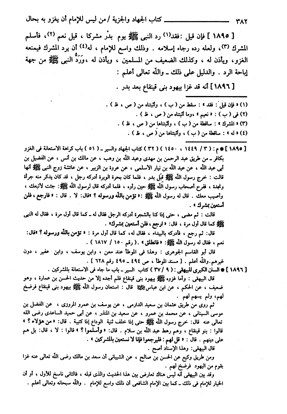 { وَرَدَّ النَّبِيُّ - صلى الله عليه وسلم - يَوْمَ بَدْرٍ مُشْرِكًا } قِيلَ نُعَيْمٌ فَأَسْلَمَ وَلَعَلَّهُ رَدَّهُ رَجَاءَ إسْلاَمِهِ وَذَلِكَ وَاسِعٌ لِلْإِمَامِ أَنْ يَرُدَّ الْمُشْرِكَ فَيَمْنَعُهُ الْغَزْوَ وَيَأْذَنَ لَهُ , وَكَذَلِكَ الضَّعِيفُ مِنْ الْمُسْلِمِينَ . وَيَأْذَنَ لَهُ وَرَدُّ النَّبِيِّ - صلى الله عليه وسلم - مِنْ جِهَةِ إبَاحَةِ الرَّدِّ وَالدَّلِيلُ عَلَى ذَلِكَ وَاَللَّهُ أَعْلَمُ أَنَّهُ قَدْ غَزَا بِيَهُودِ بَنِي قَيْنُقَاعَ بَعْدَ بَدْرٍ@