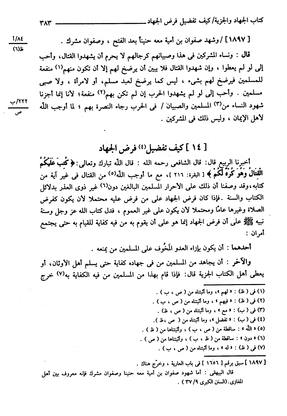 قَالَ الشَّافِعِيُّ: رحمه الله تعالى قَالَ اللَّهُ تَبَارَكَ وَتَعَالَى {كُتِبَ عَلَيْكُمْ الْقِتَالُ , وَهُوَ كُرْهٌ لَكُمْ} مَعَ مَا أَوْجَبَ مِنْ الْقِتَالِ فِي غَيْرِ آيَةٍ مِنْ كِتَابِهِ , وَقَدْ وَصَفْنَا أَنَّ ذَلِكَ عَلَى الْأَحْرَارِ الْمُسْلِمِينَ الْبَالِغِينَ غَيْرُ ذَوِي الْعُذْرِ بِدَلاَئِلِ الْكِتَابِ وَالسُّنَّةِ , فَإِذَا كَانَ فَرْضُ الْجِهَادِ عَلَى مَنْ فُرِضَ عَلَيْهِ مُحْتَمِلاً لاََنْ يَكُونَ كَفَرْضِ الصَّلاَةِ وَغَيْرِهَا عَامًّا وَمُحْتَمِلاً لاََنْ يَكُونَ عَلَى غَيْرِ الْعُمُومِ فَدَلَّ كِتَابُ اللَّهِ عَزَّ وَجَلَّ وَسُنَّةُ نَبِيِّهِ - صلى الله عليه وسلم - عَلَى أَنَّ فَرْضَ الْجِهَادِ إنَّمَا هُوَ عَلَى أَنْ يَقُومَ بِهِ مَنْ فِيهِ كِفَايَةٌ لِلْقِيَامِ بِهِ حَتَّى يَجْتَمِعَ أَمْرَانِ أَحَدُهُمَا أَنْ يَكُونَ بِإِزَاءِ الْعَدُوِّ الْمَخُوفِ عَلَى الْمُسْلِمِينَ مَنْ يَمْنَعُهُ , وَالْآخَرُ أَنْ يُجَاهِدَ مِنْ الْمُسْلِمِينَ مَنْ فِي جِهَادِهِ كِفَايَةٌ حَتَّى يُسْلِمَ أَهْلُ الْأَوْثَانِ , أَوْ يُعْطِيَ أَهْلُ الْكِتَابِ الْجِزْيَةَ قُلْ , فَإِذَا قَامَ بِهَذَا مِنْ الْمُسْلِمِينَ مَنْ فِيهِ الْكِفَايَةُ بِهِ خَرَجَ@
