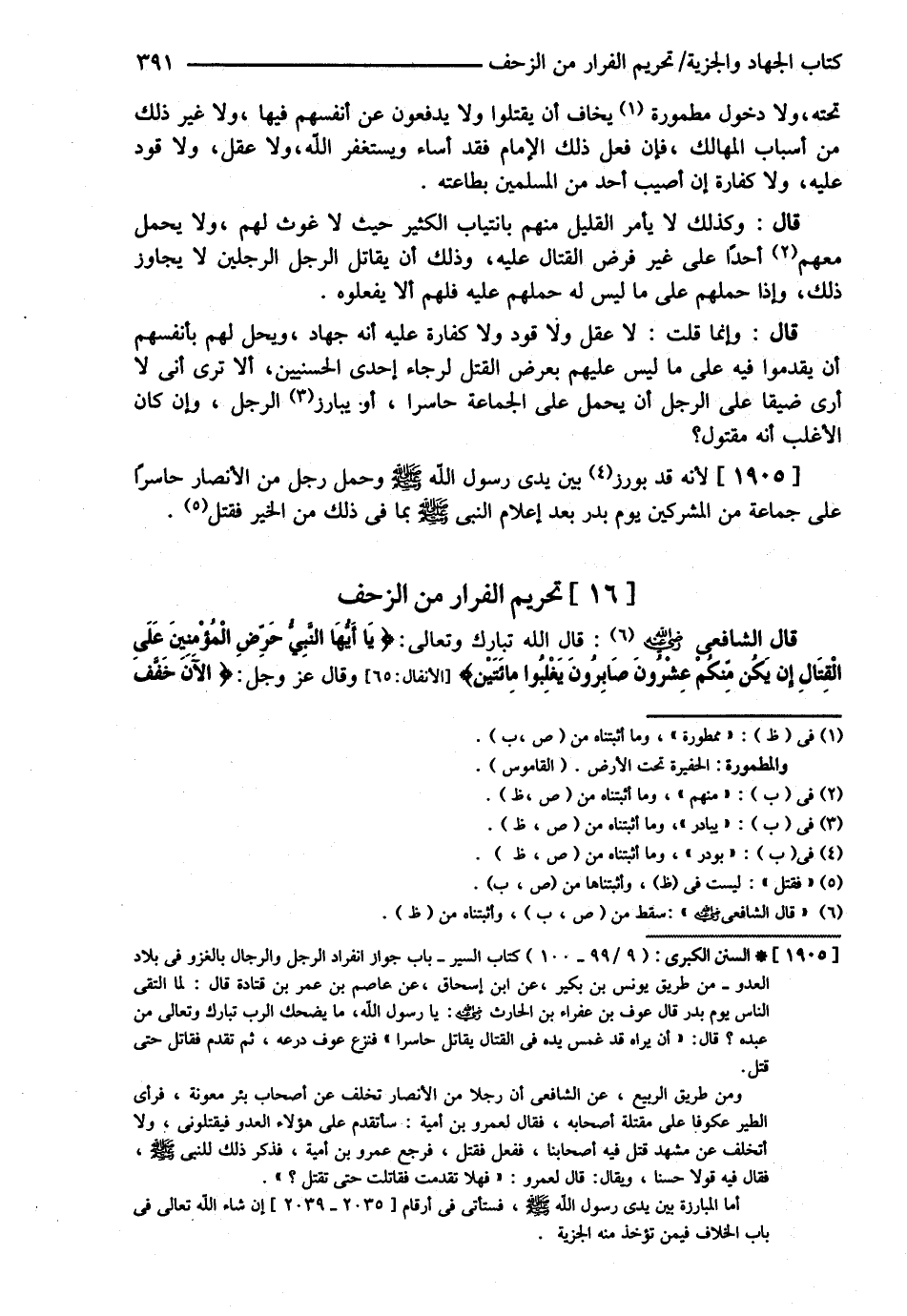 تَحْرِيمُ الْفِرَارِ مِنْ الزَّحْفِ . قَالَ : اللَّهُ تَبَارَكَ وَتَعَالَى { يَا أَيُّهَا النَّبِيُّ حَرِّضْ الْمُؤْمِنِينَ عَلَى الْقِتَالِ إنْ يَكُنْ مِنْكُمْ عِشْرُونَ صَابِرُونَ يَغْلِبُوا مِائَتَيْنِ } وَقَالَ عَزَّ وَجَلَّ : ? الْآنَ خَفَّفَ@