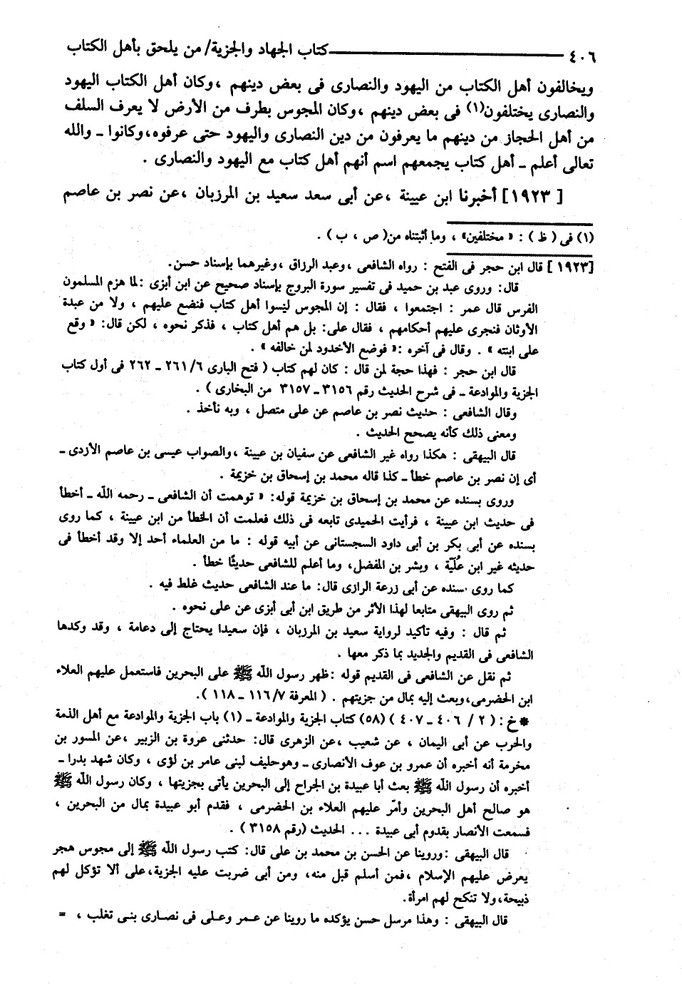 وَيُخَالِفُونَ أَهْلَ الْكِتَابِ مِنْ الْيَهُودِ وَالنَّصَارَى فِي بَعْضِ دِينِهِمْ وَكَانَ أَهْلُ الْكِتَابِ الْيَهُودِ وَالنَّصَارَى يَخْتَلِفُونَ فِي بَعْضِ دِينِهِمْ وَكَانَ الْمَجُوسُ بِطَرَفٍ مِنْ الْأَرْضِ لاَ يَعْرِفُ السَّلَفُ مِنْ أَهْلِ الْحِجَازِ مِنْ دِينِهِمْ مَا يَعْرِفُونَ مِنْ دِينِ النَّصَارَى وَالْيَهُودِ حَتَّى عَرَفُوهُ وَكَانُوا وَاَللَّهُ تَعَالَى أَعْلَمُ أَهْلَ كِتَابٍ يَجْمَعُهُمْ اسْمٌ أَنَّهُمْ أَهْلُ كِتَابٍ مَعَ الْيَهُودِ وَالنَّصَارَى. أَخْبَرَنَا ابْنُ عُيَيْنَةَ عَنْ أَبِي سَعْدٍ سَعِيدِ بْنِ الْمَرْزُبَانِ عَنْ نَصْرِ بْنِ عَاصِمٍ@