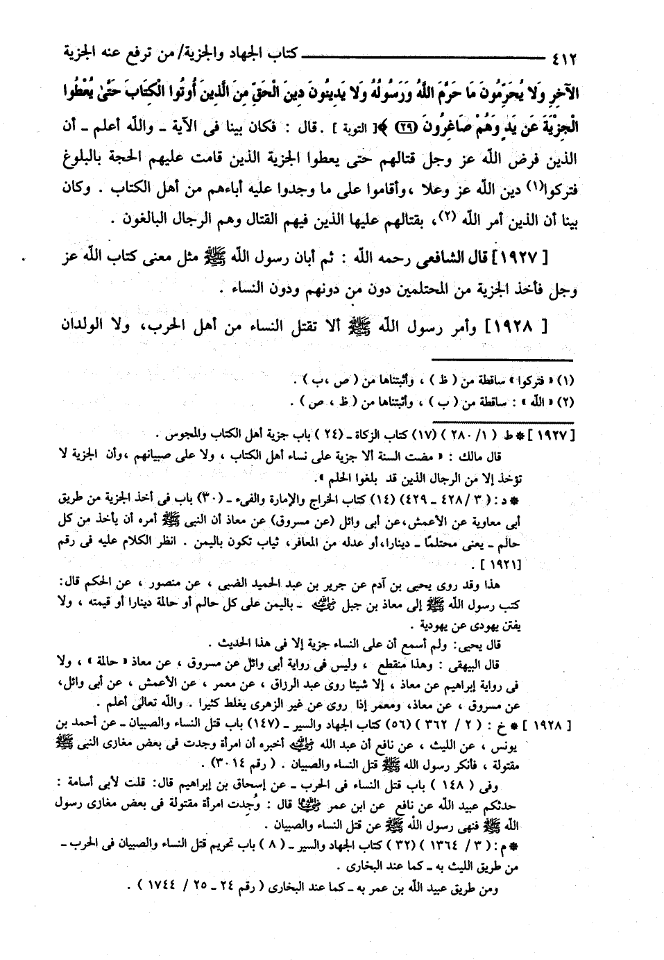 قَالَ الشَّافِعِيُّ: رحمه الله تعالى ثُمَّ أَبَانَ رَسُولُ اللَّهِ - صلى الله عليه وسلم - مِثْلَ مَعْنَى كِتَابِ اللَّهِ عَزَّ وَجَلَّ فَأَخَذَ الْجِزْيَةَ مِنْ الْمُحْتَلِمِينَ دُونَ مَنْ دُونَهُمْ وَدُونَ النِّسَاءِ {وَأَمَرَ رَسُولُ اللَّهِ - صلى الله عليه وسلم - أَنْ لاَ تُقْتَلَ النِّسَاءُ مِنْ أَهْلِ الْحَرْبِ , وَلاَ الْوِلْدَانُ@