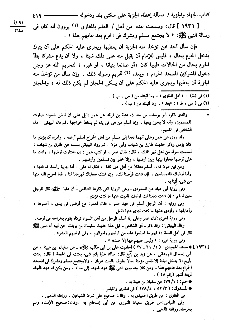 قَالَ : وَسَمِعْت عَدَدًا مِنْ أَهْلِ الْعِلْمِ بِالْمَغَازِي يَرْوُونَ أَنَّهُ كَانَ فِي رِسَالَةِ النَّبِيِّ - صلى الله عليه وسلم - { لاَ يَجْتَمِعُ مُسْلِمٌ وَمُشْرِكٌ فِي الْحَرَمِ بَعْدَ عَامِهِمْ هَذَا } فَإِنْ سَأَلَ أَحَدٌ مِمَّنْ تُؤْخَذُ مِنْهُ الْجِزْيَةُ أَنْ يُعْطِيَهَا وَيَجْرِيَ عَلَيْهِ الْحُكْمُ عَلَى أَنْ يُتْرَكَ يَدْخُلَ الْحَرَمَ بِحَالٍ فَلَيْسَ لِلْإِمَامِ أَنْ يَقْبَلَ مِنْهُ عَلَى ذَلِكَ شَيْئًا , وَلاَ أَنْ يَدَعَ مُشْرِكًا يَطَأُ الْحَرَمَ بِحَالٍ مِنْ الْحَالاَتِ طَبِيبًا كَانَ أَوْ صَانِعًا بُنْيَانًا , أَوْ غَيْرَهُ لِتَحْرِيمِ اللَّهِ عَزَّ وَجَلَّ دُخُولَ الْمُشْرِكِينَ الْمَسْجِدَ الْحَرَامَ وَبَعْدَهُ تَحْرِيمُ رَسُولِهِ ذَلِكَ وَإِنْ سَأَلَ مَنْ تُؤْخَذُ مِنْهُ الْجِزْيَةُ أَنْ يُعْطِيَهَا وَيَجْرِيَ عَلَيْهِ الْحُكْمُ عَلَى أَنْ يَسْكُنَ الْحِجَازَ لَمْ يَكُنْ ذَلِكَ لَهُ وَالْحِجَازُ@