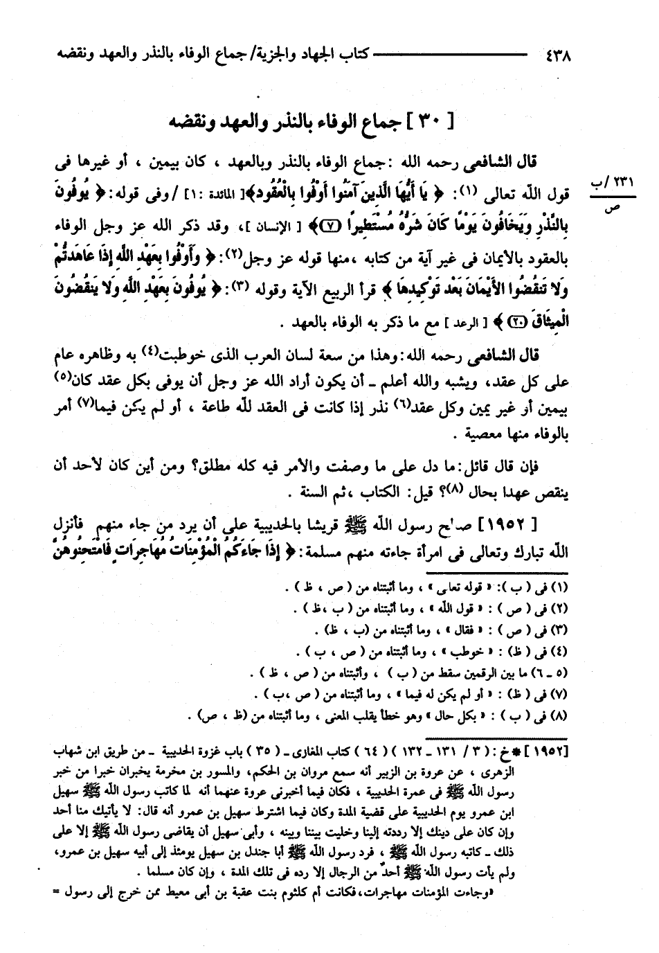 قَالَ الشَّافِعِيُّ : رحمه الله تعالى : وَهَذَا مِنْ سَعَةِ لِسَانِ الْعَرَبِ الَّذِي خُوطِبَتْ بِهِ وَظَاهِرُهُ عَامٌّ عَلَى كُلِّ عَقْدٍ وَيُشْبِهُ وَاَللَّهُ تَعَالَى أَعْلَمُ أَنْ يَكُونَ أَرَادَ اللَّهُ عَزَّ وَجَلَّ أَنْ يُوفِيَ بِكُلِّ عَقْدِ نَذْرٍ إذَا كَانَتْ فِي الْعَقْدِ لِلَّهِ طَاعَةٌ , وَلَمْ يَكُنْ فِيمَا أَمَرَ بِالْوَفَاءِ مِنْهَا مَعْصِيَةٌ . فَإِنْ قَالَ : قَائِلٌ مَا دَلَّ عَلَى مَا وَصَفْت وَالْأَمْرُ فِيهِ كُلُّهُ مُطْلَقٌ ؟ وَمِنْ أَيْنَ كَانَ لِأَحَدٍ أَنْ يَنْقُضَ عَهْدًا بِكُلِّ حَالٍ ؟ قِيلَ : الْكِتَابُ ثُمَّ السُّنَّةُ { صَالَحَ رَسُولُ اللَّهِ - صلى الله عليه وسلم - قُرَيْشًا بِالْحُدَيْبِيَةِ عَلَى أَنْ يَرُدَّ مَنْ جَاءَ مِنْهُمْ فَأَنْزَلَ اللَّهُ تَبَارَكَ وَتَعَالَى فِي امْرَأَةٍ جَاءَتْهُ مِنْهُمْ مُسْلِمَةً { إذَا جَاءَكُمْ الْمُؤْمِنَاتُ مُهَاجِرَاتٍ فَامْتَحِنُوهُنَّ@
