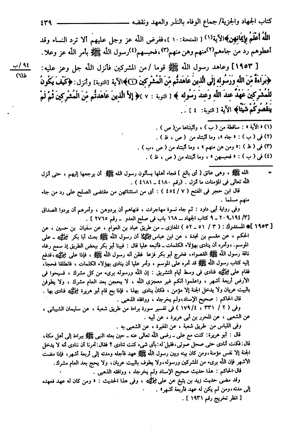 اللَّهُ أَعْلَمُ بِإِيمَانِهِنَّ } } فَفَرَضَ اللَّهُ عَزَّ وَجَلَّ عَلَيْهِمْ أَنْ لاَ تُرَدَّ النِّسَاءُ , وَقَدْ أَعْطَوْهُمْ رَدَّ مَنْ جَاءَ مِنْهُمْ وَهُنَّ مِنْهُمْ فَحَبَسَهُنَّ رَسُولُ اللَّهِ - صلى الله عليه وسلم - بِأَمْرِ اللَّهِ عَزَّ وَجَلَّ : ? وَعَاهَدَ رَسُولُ اللَّهِ - صلى الله عليه وسلم - قَوْمًا مِنْ الْمُشْرِكِينَ فَأَنْزَلَ اللَّهُ عَزَّ وَجَلَّ عَلَيْهِ { بَرَاءَةٌ مِنْ اللَّهِ وَرَسُولِهِ إلَى الَّذِينَ عَاهَدْتُمْ مِنْ الْمُشْرِكِينَ } } الْآيَةُ . وَأَنْزَلَ { كَيْفَ يَكُونُ لِلْمُشْرِكِينَ عَهْدٌ عِنْدَ اللَّهِ وَعِنْدَ رَسُولِهِ إلَّا الَّذِينَ عَاهَدْتُمْ مِنْ الْمُشْرِكِينَ ثُمَّ لَمْ يَنْقُصُوكُمْ شَيْئًا ? الآيَةَ. . @
