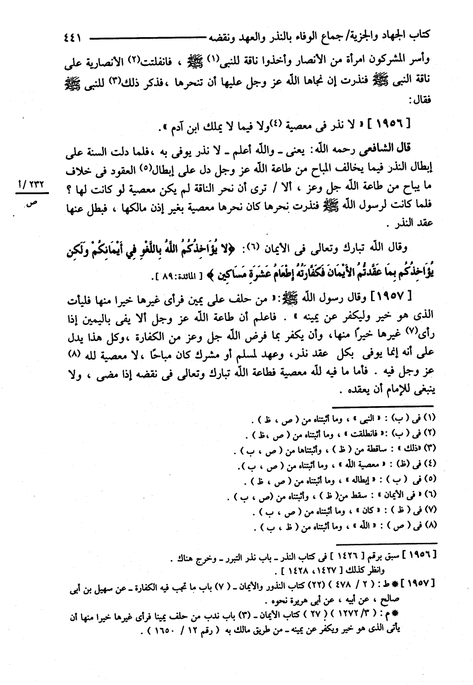 { وَأَسَرَ الْمُشْرِكُونَ امْرَأَةً مِنْ الْأَنْصَارِ وَأَخَذُوا نَاقَةَ النَّبِيِّ - صلى الله عليه وسلم - فَانْطَلَقَتْ الْأَنْصَارِيَّةُ عَلَى نَاقَةِ النَّبِيِّ - صلى الله عليه وسلم - فَنَذَرَتْ إنْ نَجَّاهَا اللَّهُ عَزَّ وَجَلَّ عَلَيْهَا أَنْ تَنْحَرَهَا فَذُكِرَ ذَلِكَ لِلنَّبِيِّ - صلى الله عليه وسلم - فَقَالَ : لاَ نَذْرَ فِي مَعْصِيَةٍ , وَلاَ فِيمَا لاَ يَمْلِكُ ابْنُ آدَمَ } .