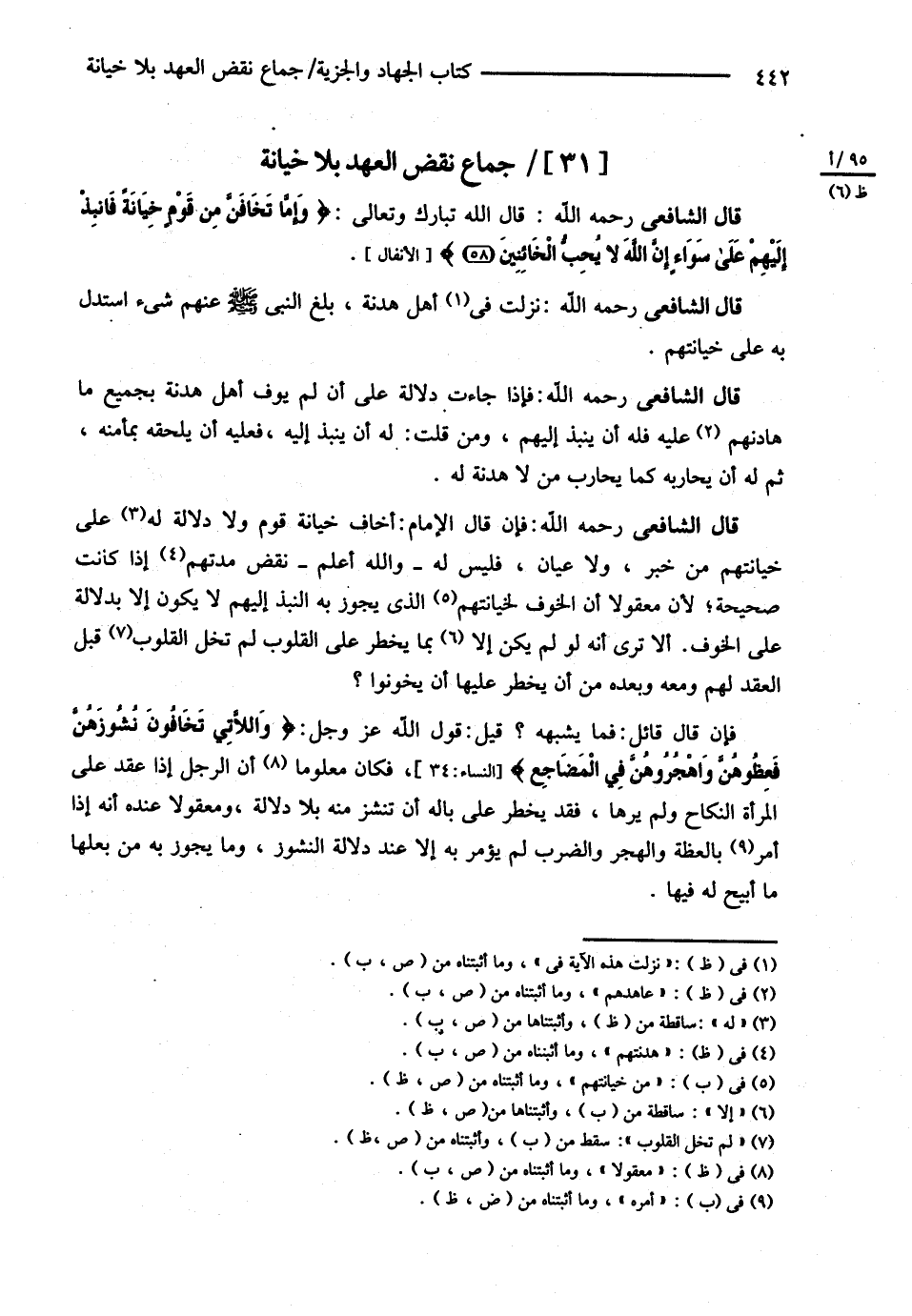 قَالَ الشَّافِعِيُّ : رحمه الله تعالى فَإِنْ قَالَ الْإِمَامُ : أَخَافُ خِيَانَةَ قَوْمٍ , وَلاَ دَلاَلَةَ لَهُ عَلَى خِيَانَتِهِمْ مِنْ خَبَرٍ , وَلاَ عِيَانٍ فَلَيْسَ لَهُ وَاَللَّهُ تَعَالَى أَعْلَمُ نَقْضُ مُدَّتِهِمْ إذَا كَانَتْ صَحِيحَةً ; لِأَنَّ مَعْقُولاً أَنَّ الْخَوْفَ مِنْ خِيَانَتِهِمْ الَّذِي يَجُوزُ بِهِ النَّبْذُ إلَيْهِمْ لاَ يَكُونُ إلَّا بِدَلاَلَةٍ عَلَى الْخَوْفِ , أَلاَ تَرَى أَنَّهُ لَوْ لَمْ يَكُنْ بِمَا يَخْطُرُ عَلَى الْقُلُوبِ قَبْلَ الْعَقْدِ لَهُمْ وَمَعَهُ وَبَعْدَهُ مِنْ أَنْ يَخْطُرَ عَلَيْهَا أَنْ يَخُونُوا , فَإِنْ قَالَ قَائِلٌ فَمَا يُشْبِهُهُ ؟ قِيلَ : قَوْلُ اللَّهِ عَزَّ وَجَلَّ : ? وَاَللَّاتِي تَخَافُونَ نُشُوزَهُنَّ فَعِظُوهُنَّ وَاهْجُرُوهُنَّ فِي الْمَضَاجِعِ } فَكَانَ مَعْلُومًا أَنَّ الرَّجُلَ إذَا عَقَدَ عَلَى الْمَرْأَةِ النِّكَاحَ , وَلَمْ يَرَهَا , فَقَدْ يَخْطُرُ عَلَى بَالِهِ أَنْ تَنْشُزَ مِنْهُ بِدَلاَلَةٍ وَمَعْقُولاً عِنْدَهُ أَنَّهُ إذَا أَمَرَهُ بِالْعِظَةِ وَالْهَجْرِ وَالضَّرْبِ لَمْ يُؤْمَرْ بِهِ إلَّا عِنْدَ دَلاَلَةِ النُّشُوزِ وَمَا يَجُوزُ بِهِ مِنْ بَعْلِهَا مَا أُتِيحَ لَهُ فِيهَا .@